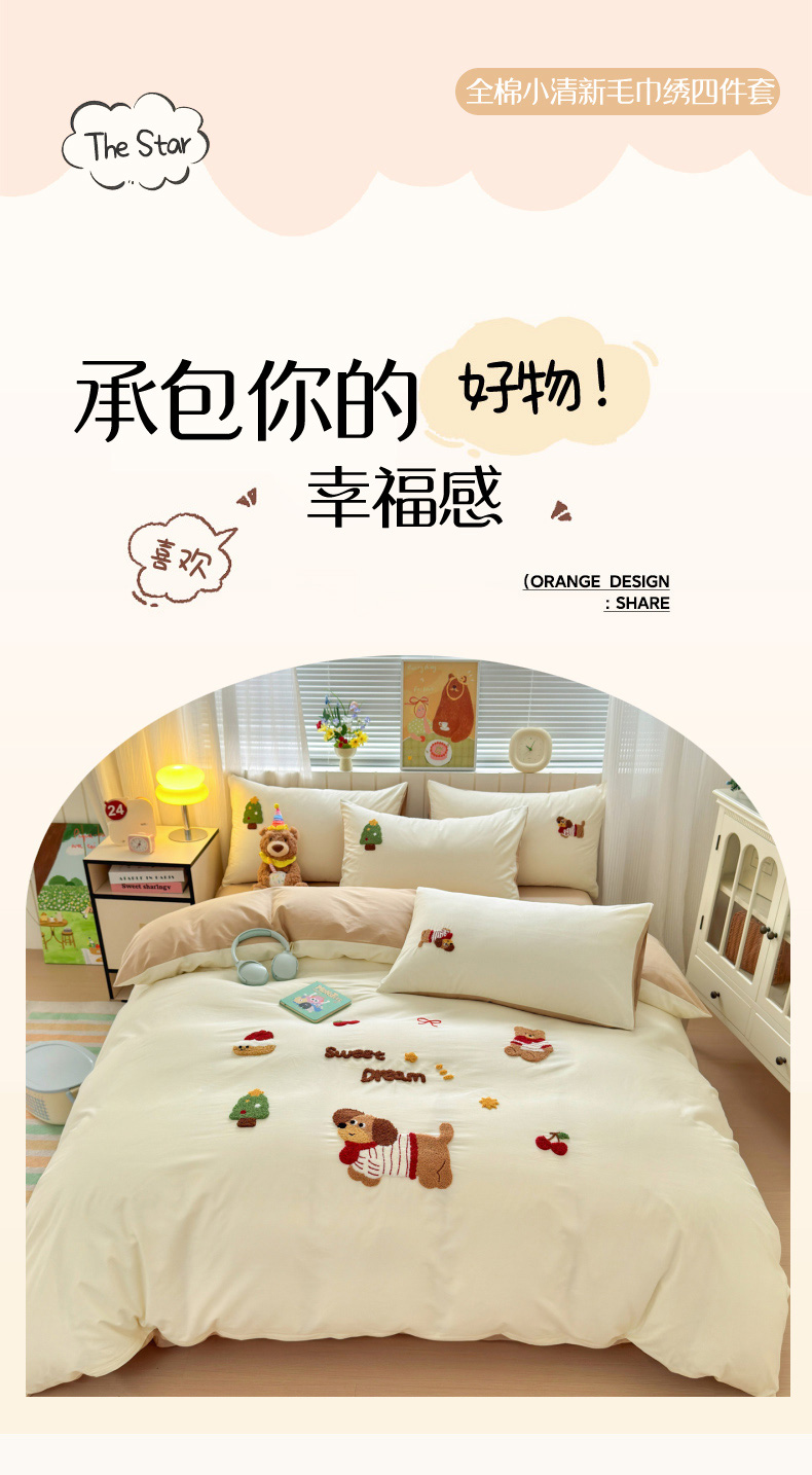 (总)如意朵 2026新款全棉磨毛卡通毛巾绣四件套(专版花型)-场景二,草莓兔兔,运动小狗,复古小狗,好朋友,好柿发生,加油小狗,快乐小狗,猫咪一家,猫抓鱼,毛线小狗,美味吐司,萌布布粉,明星狮子,趴趴乐,苹果熊猫,企鹅宝宝,三只企鹅,小狐狸,羞羞狗,音乐企鹅,摘星熊