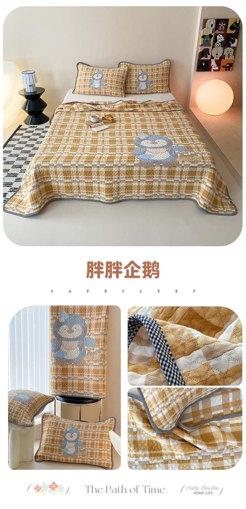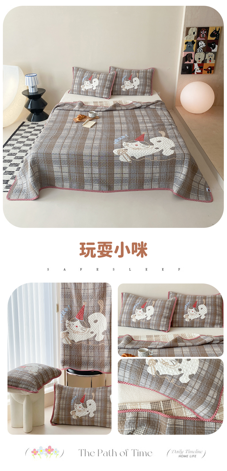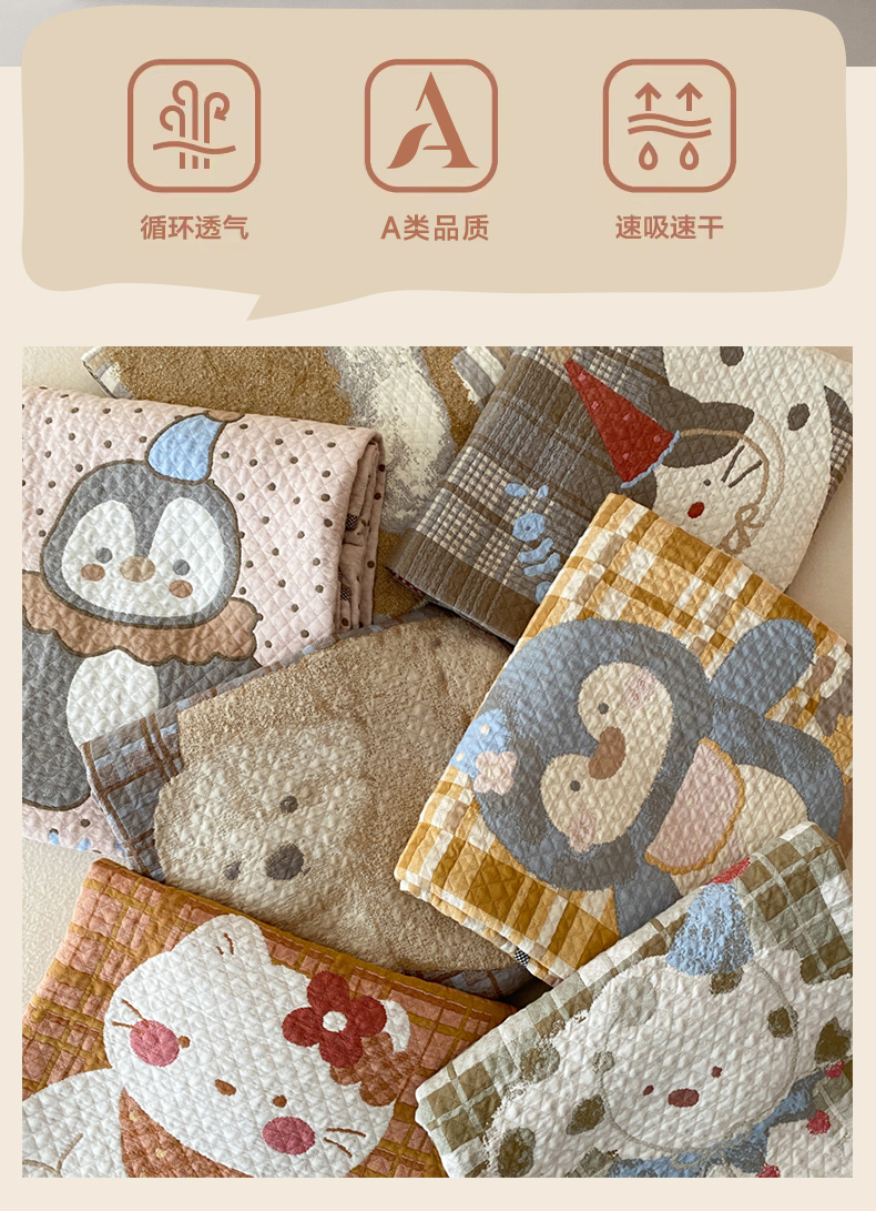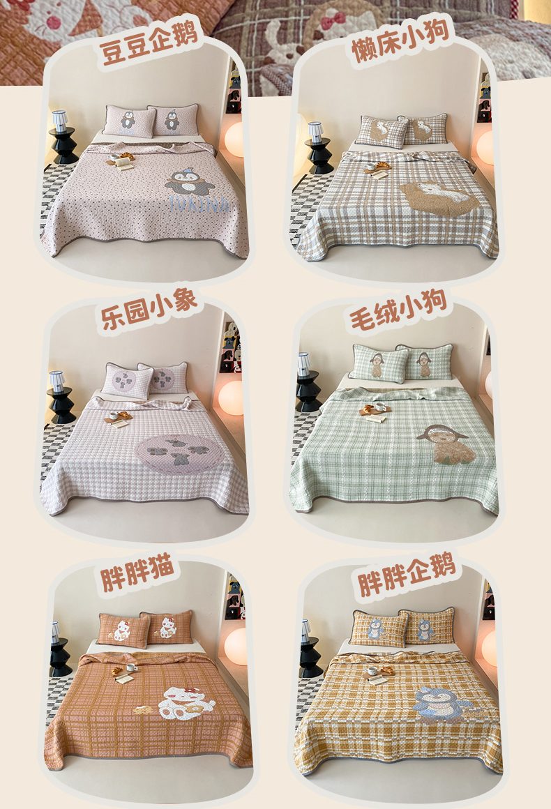 (总)麻依 2026新款软萌纱布床盖三件套系列,斑点小猫,博美,豆豆企鹅,懒床小狗,乐园小象,毛绒小狗,胖胖猫,胖胖企鹅,桃心KT,玩耍小咪,香蕉小猫,杂技萌宠,组合