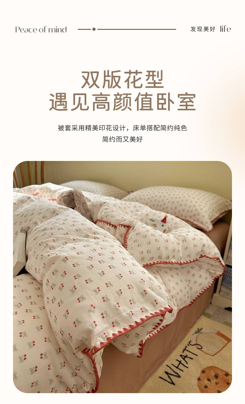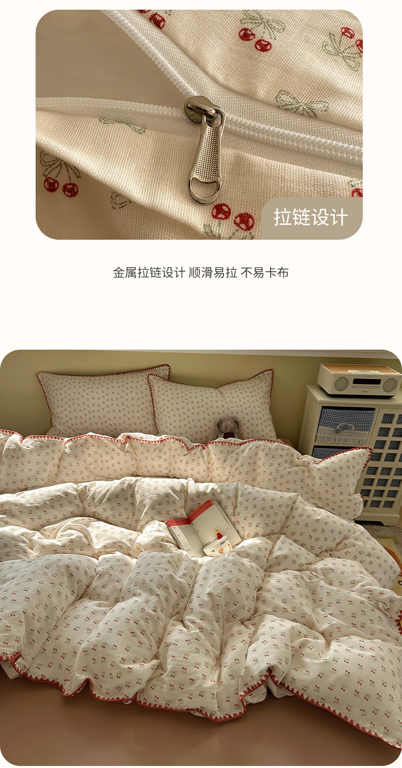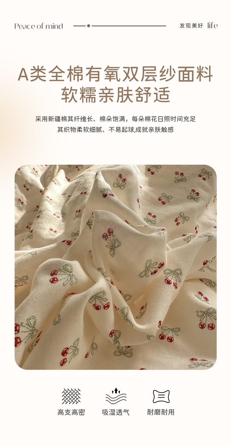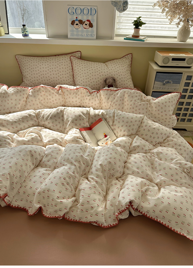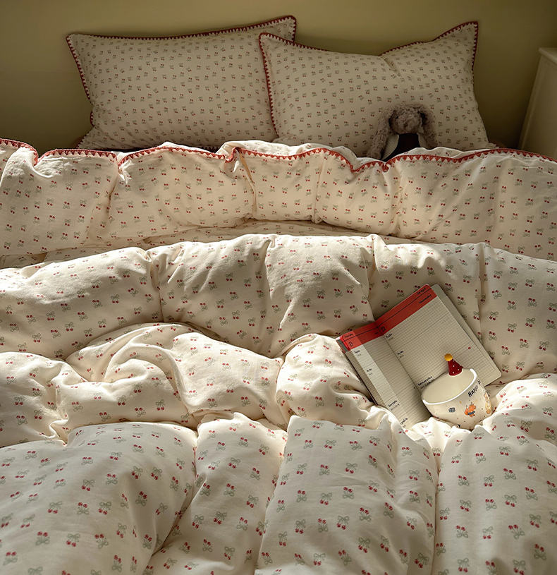 当前位置: 91家纺网 > 商品网购 > 床品套件 > 四件套 > 全棉普通四件套 > 瑞莱 2026新款A类全棉纯棉有氧双层纱四件套 樱桃画报