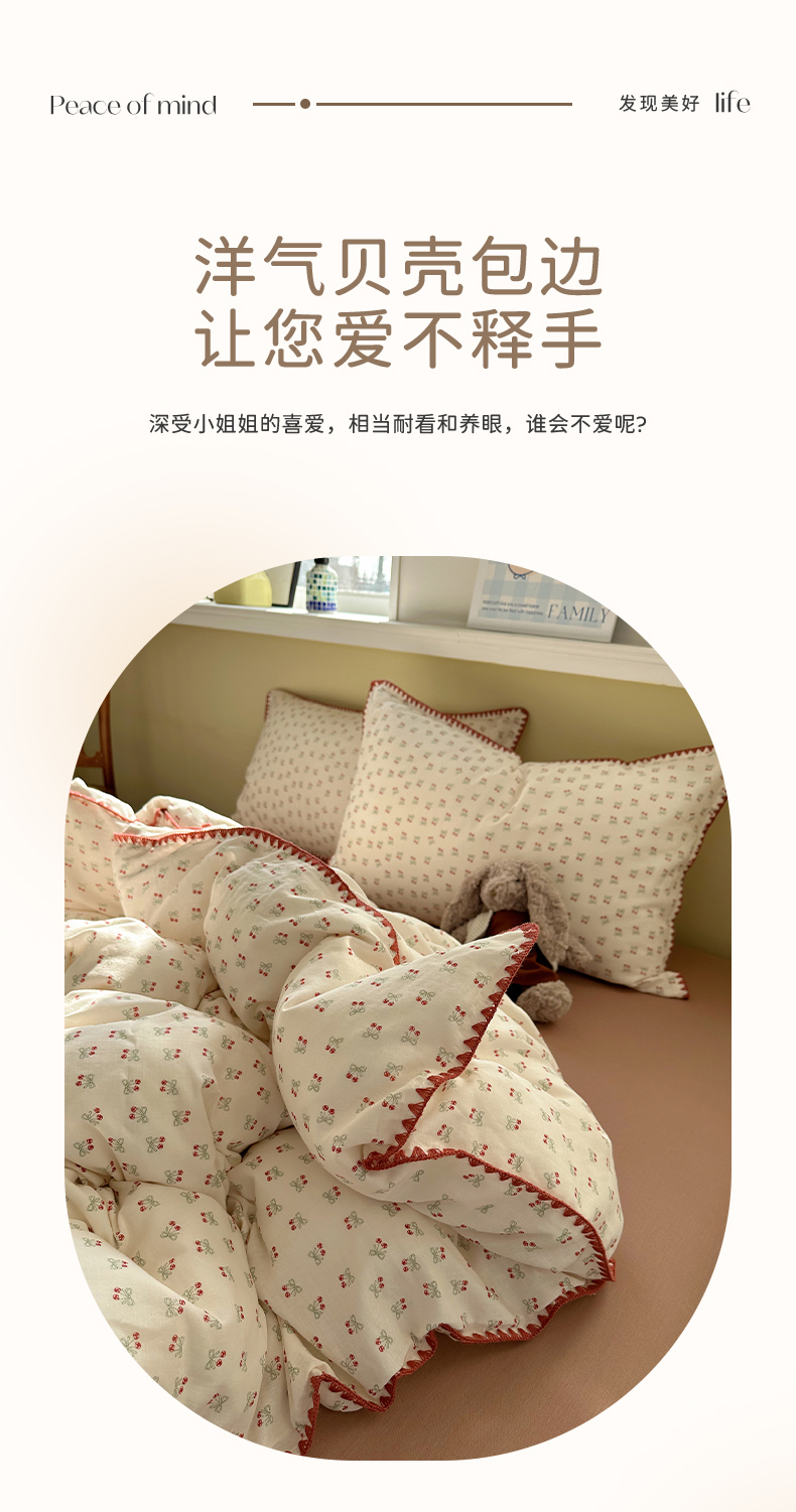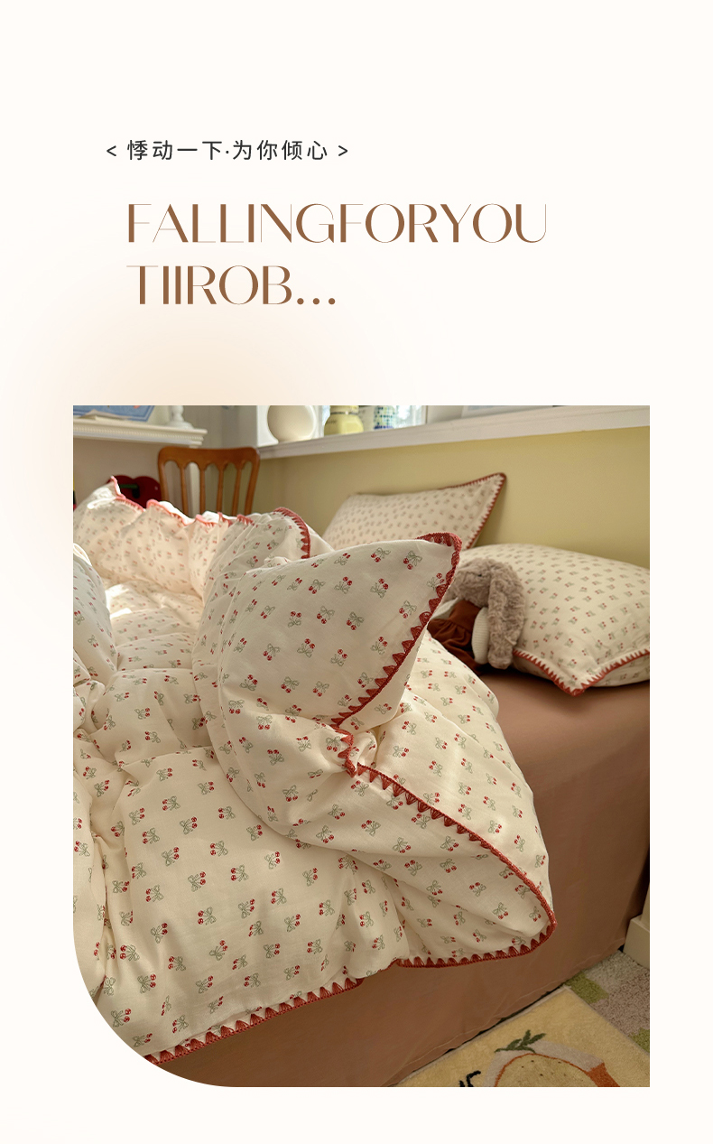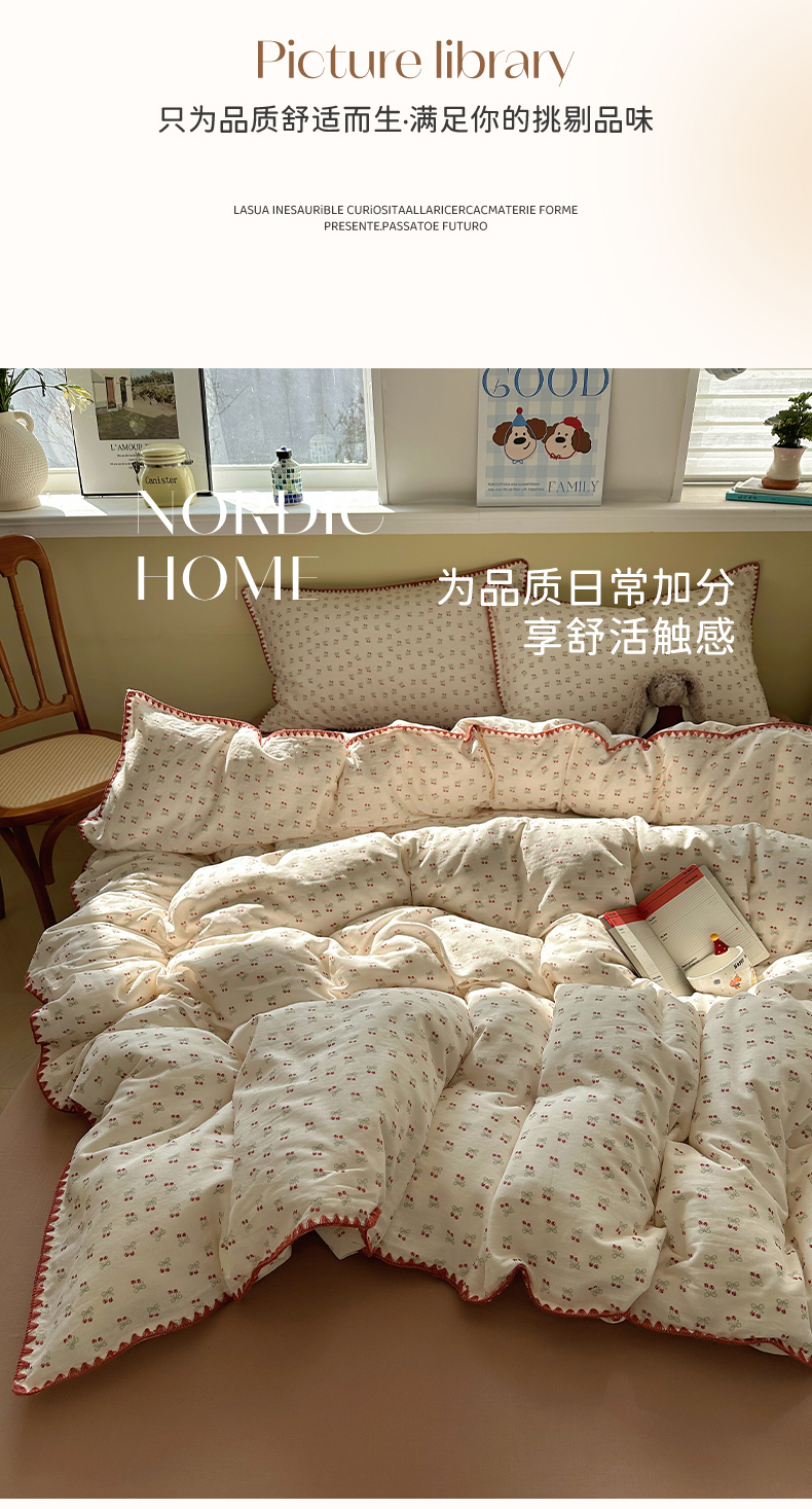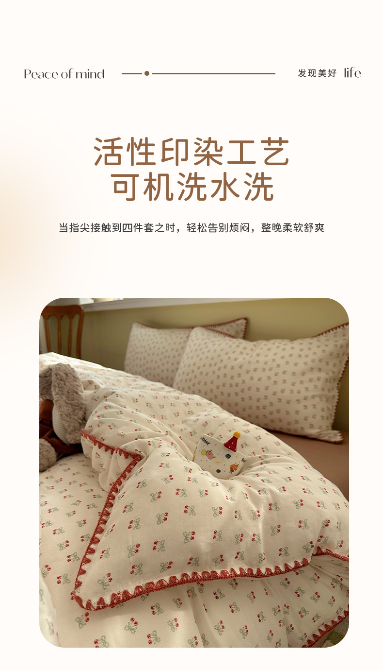 当前位置: 91家纺网 > 商品网购 > 床品套件 > 四件套 > 全棉普通四件套 > 瑞莱 2026新款A类全棉纯棉有氧双层纱四件套 樱桃画报