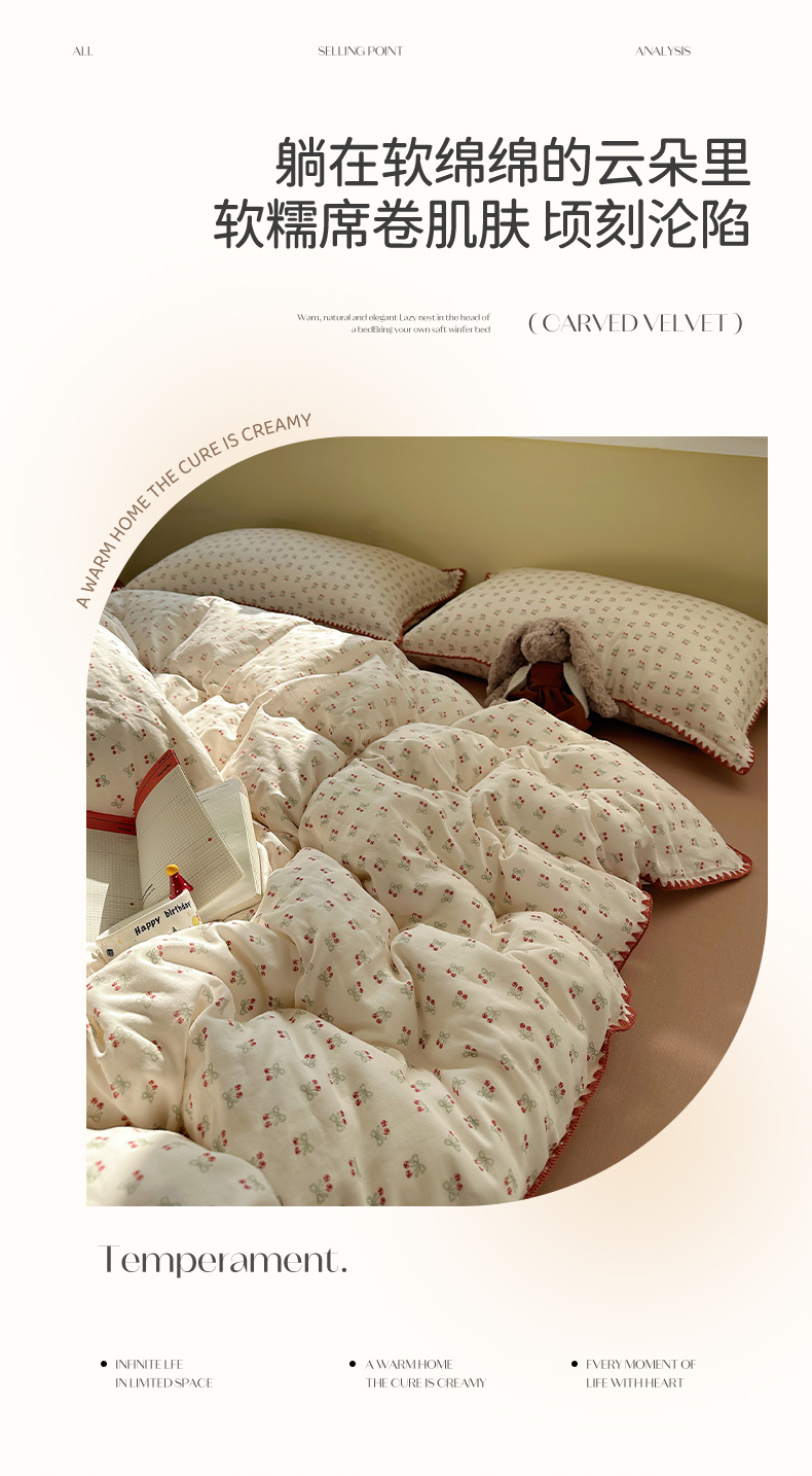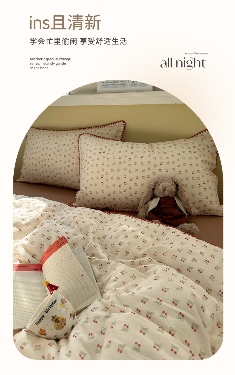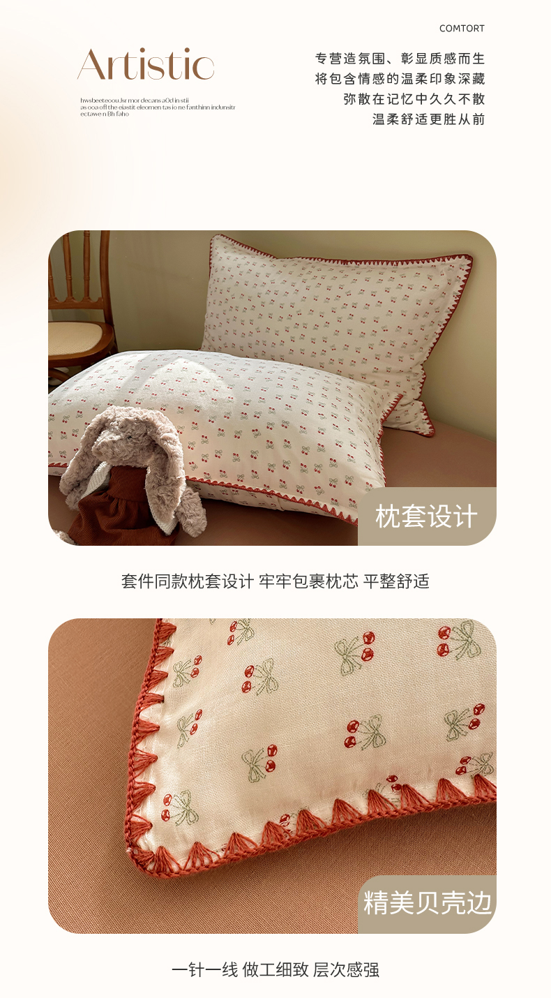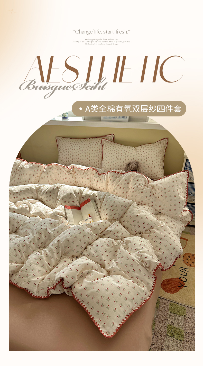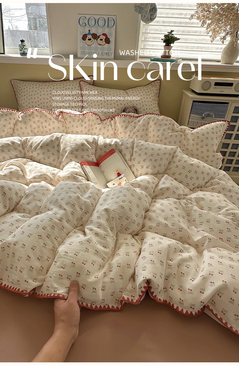 当前位置: 91家纺网 > 商品网购 > 床品套件 > 四件套 > 全棉普通四件套 > 瑞莱 2026新款A类全棉纯棉有氧双层纱四件套 樱桃画报