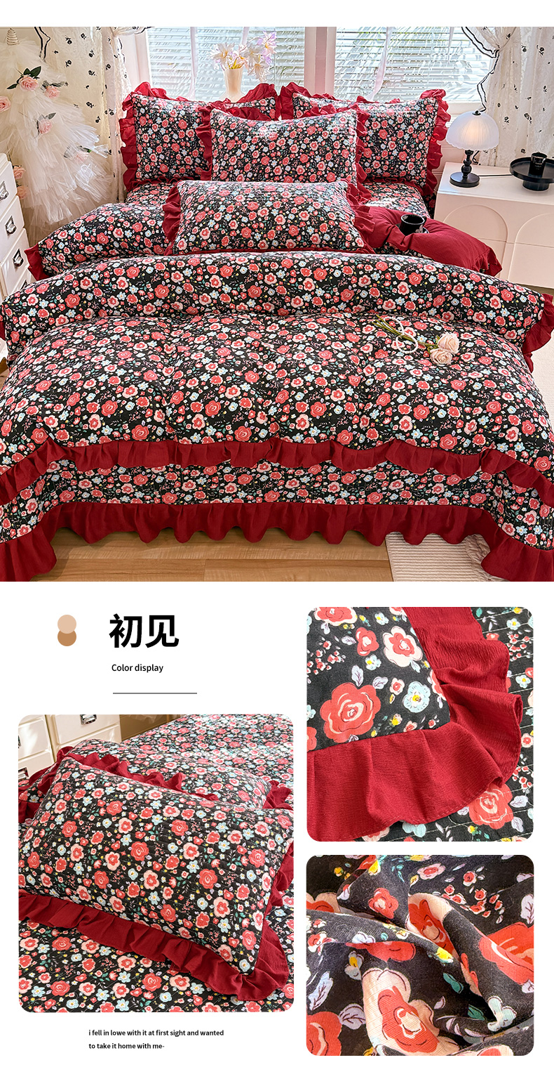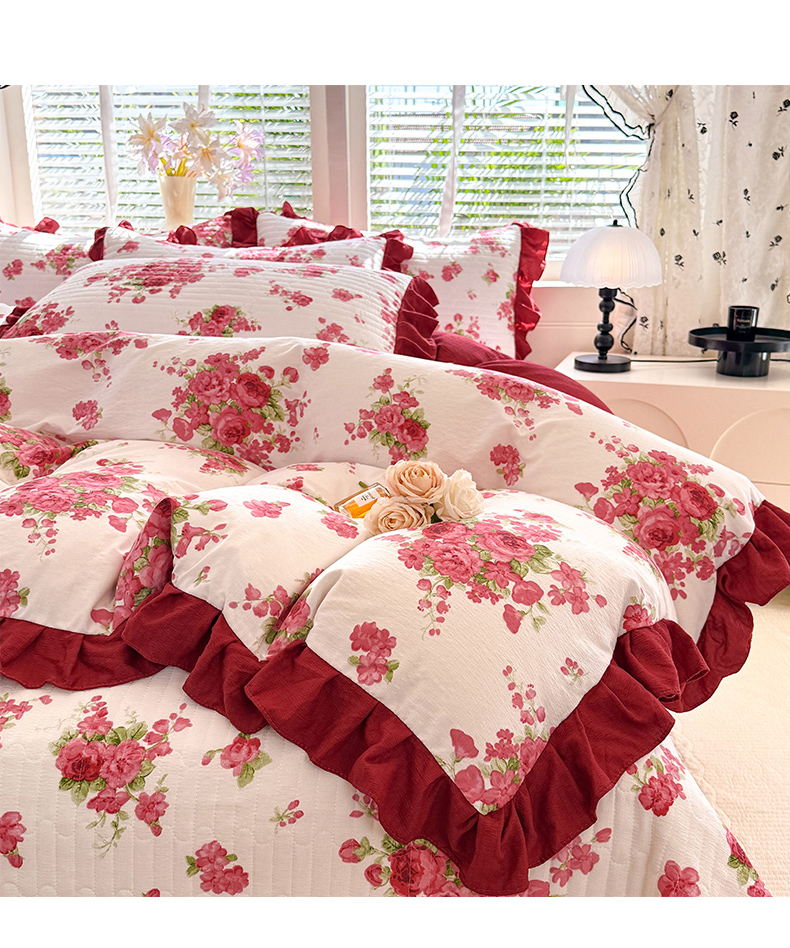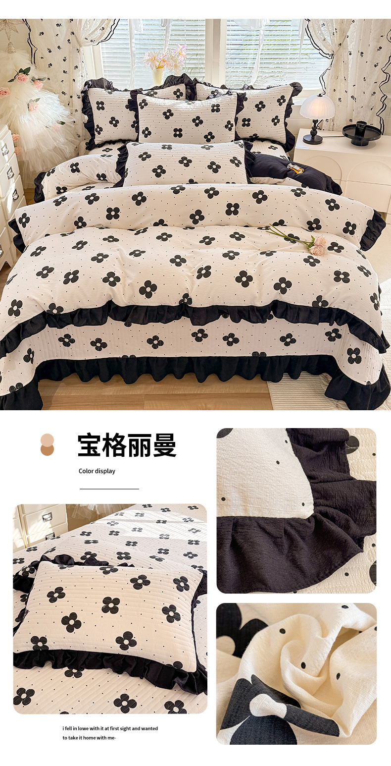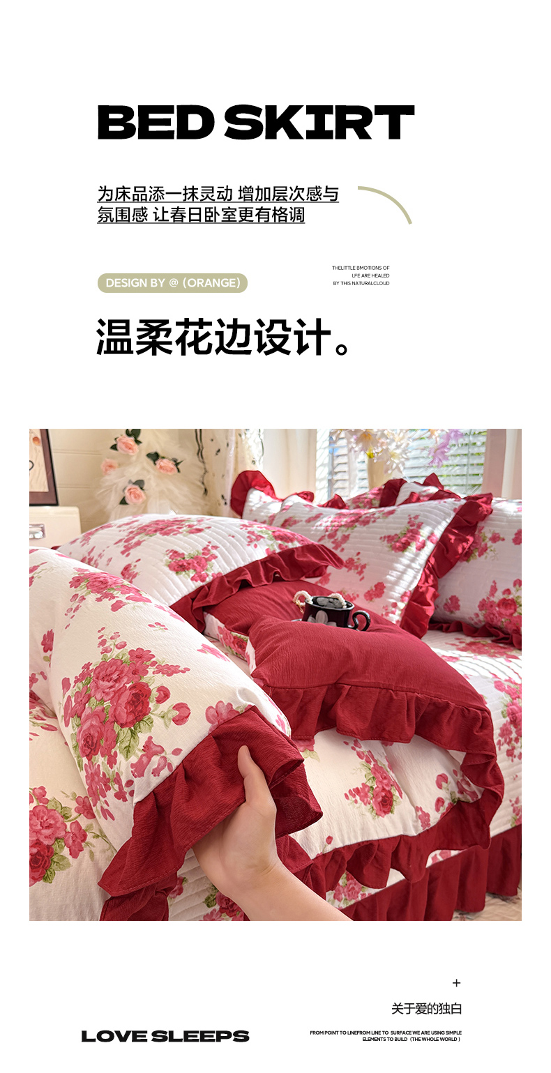 当前位置: 91家纺网 > 商品网购 > 床品套件 > 四件套 > 水洗棉四件套 > 唐人居 2026春夏新款皱皱水洗棉花边床盖四件套 花影