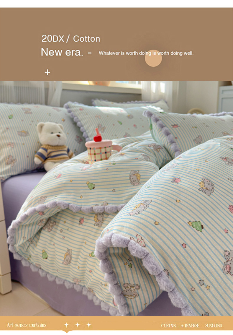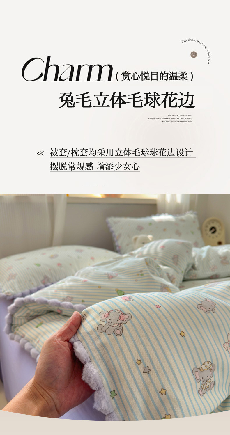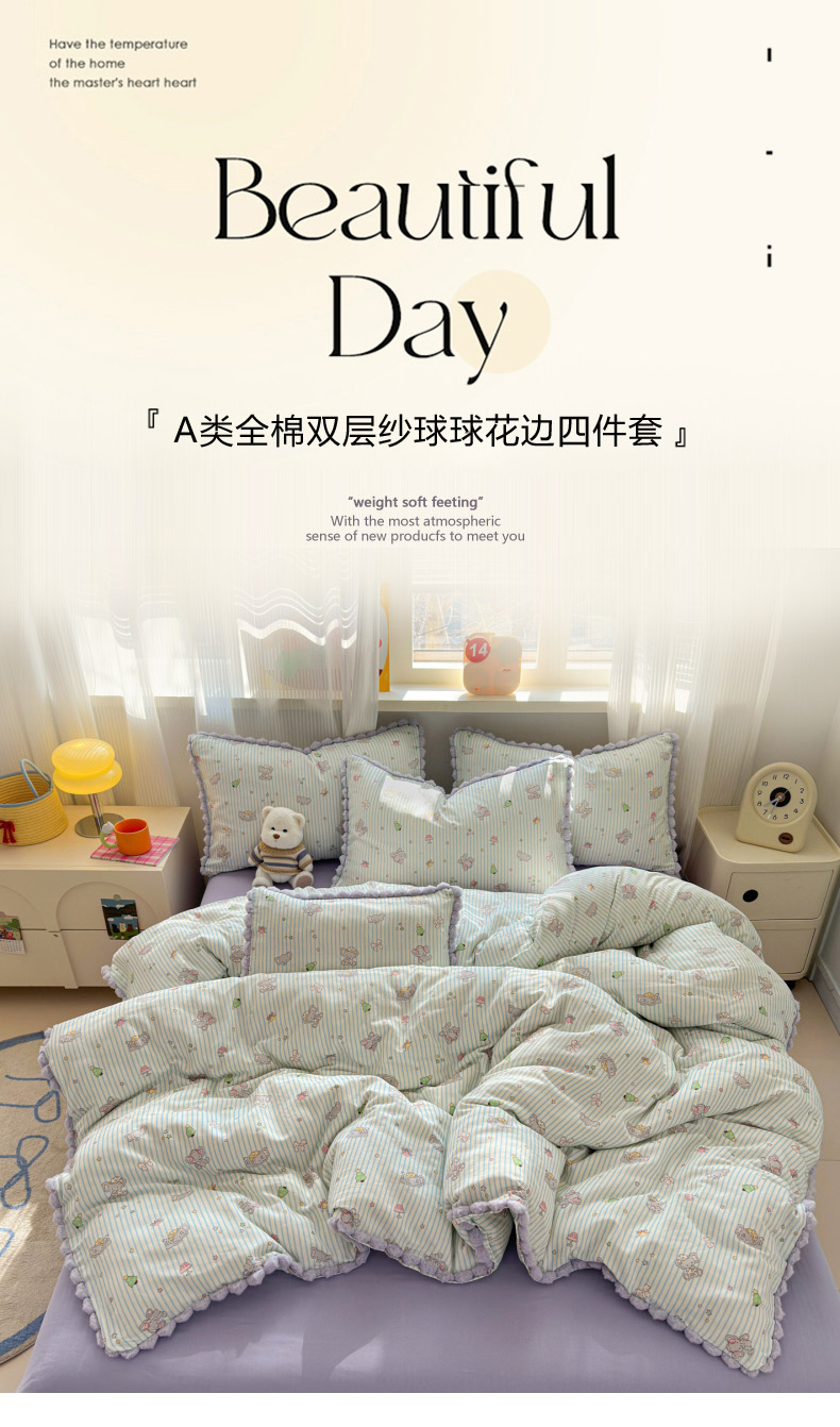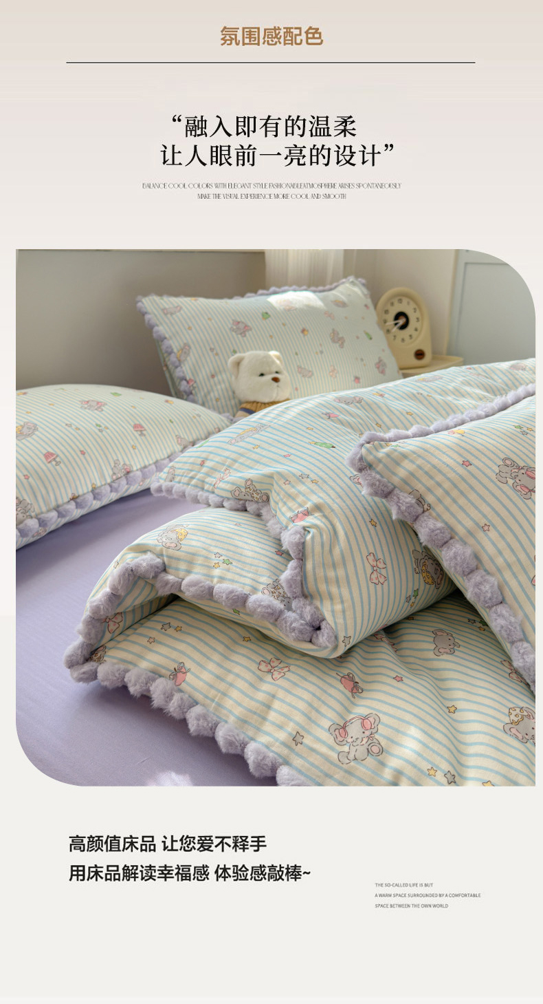 当前位置: 91家纺网 > 商品网购 > 床品套件 > 四件套 > 全棉普通四件套 > 丽涵家纺 2026新款全棉双层纱全棉纯棉大雁纹毛球花边四件套 音乐小象-紫