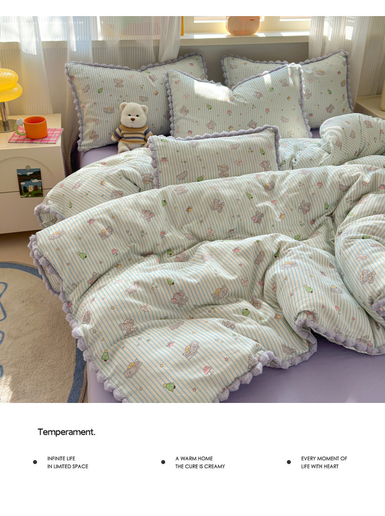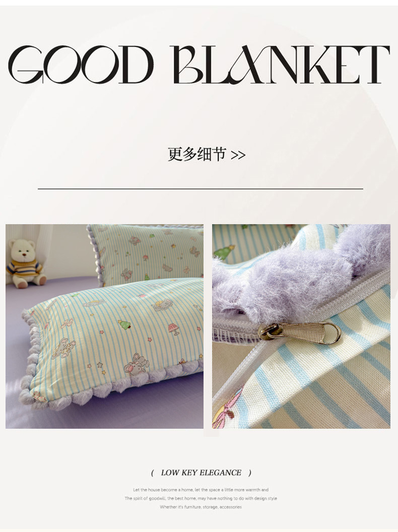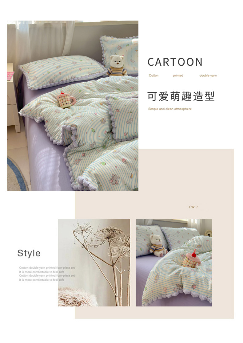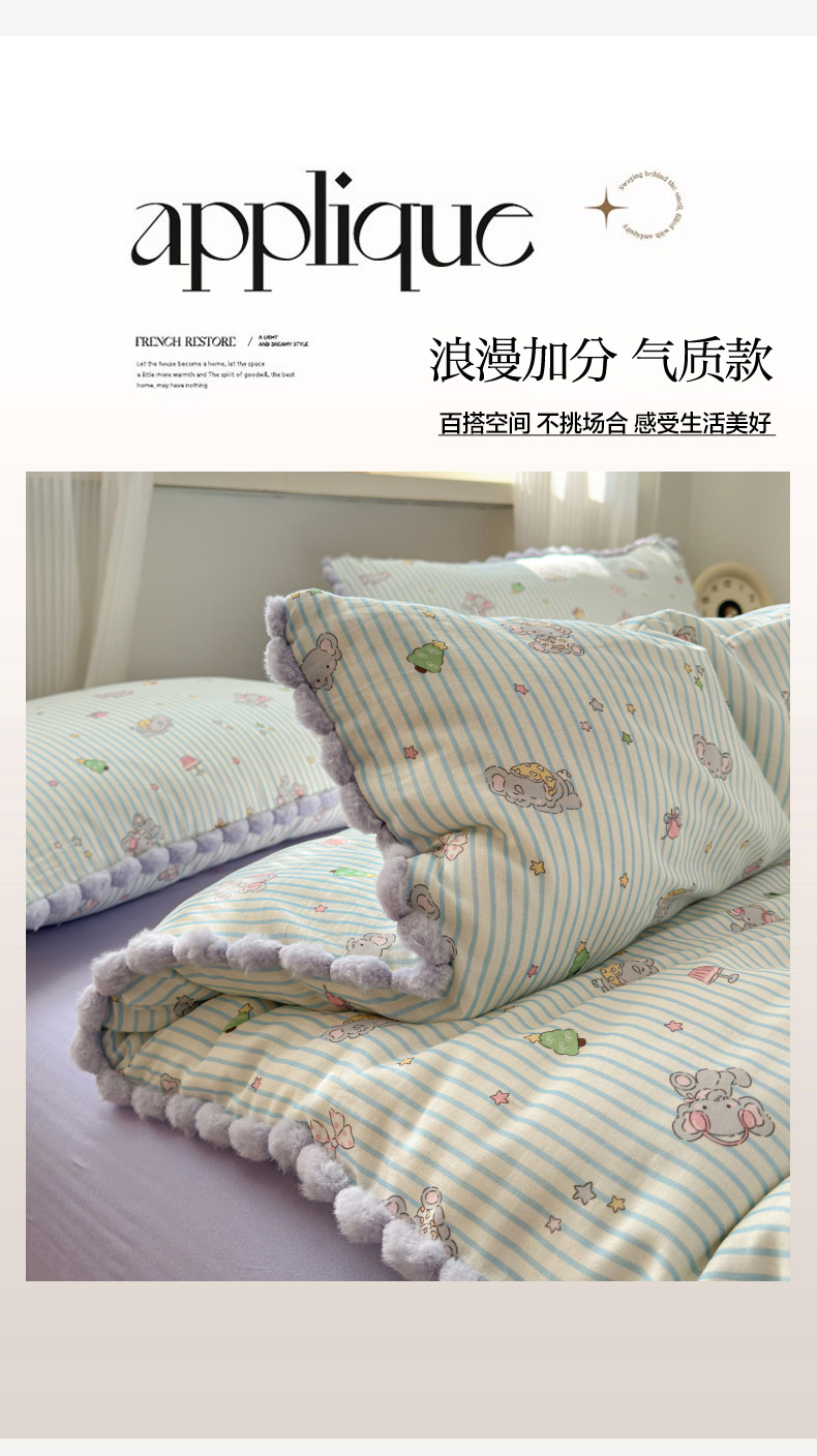 当前位置: 91家纺网 > 商品网购 > 床品套件 > 四件套 > 全棉普通四件套 > 丽涵家纺 2026新款全棉双层纱全棉纯棉大雁纹毛球花边四件套 音乐小象-紫