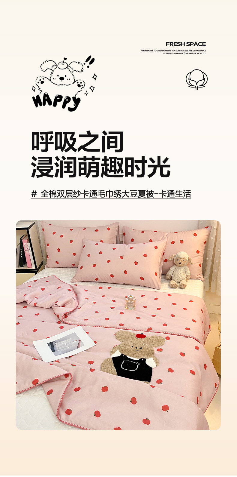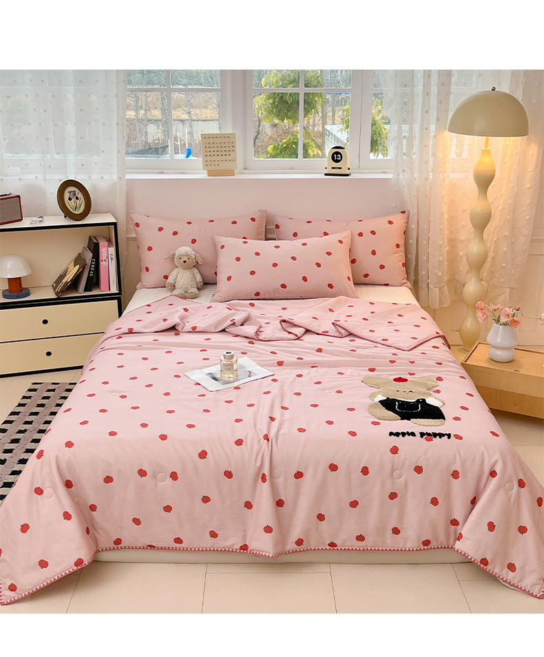 商品名称:一加一 2026新款全棉双层纱卡通毛巾绣大豆夏被夏凉被空调被-卡通生活 苹果小狗