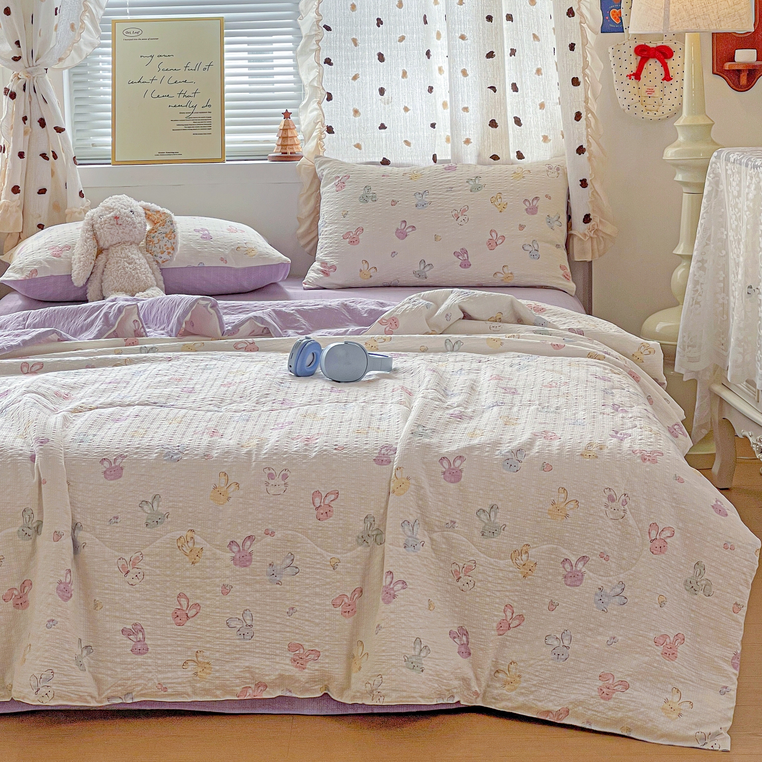 (总)一比一家纺 2026新款泡芙纱简款夏被四件套,安妮,草莓恋语,春日小兔,花藤小兔,咖啡狗,浪漫彩蝶,玫瑰之恋,素锦,小黄鸭,心愿,星梦乐园,星星狗,熊博士,摇摇星人,樱桃波点,云朵泡芙,长耳兔,紫色花语,组合图仅供展示-不可下单