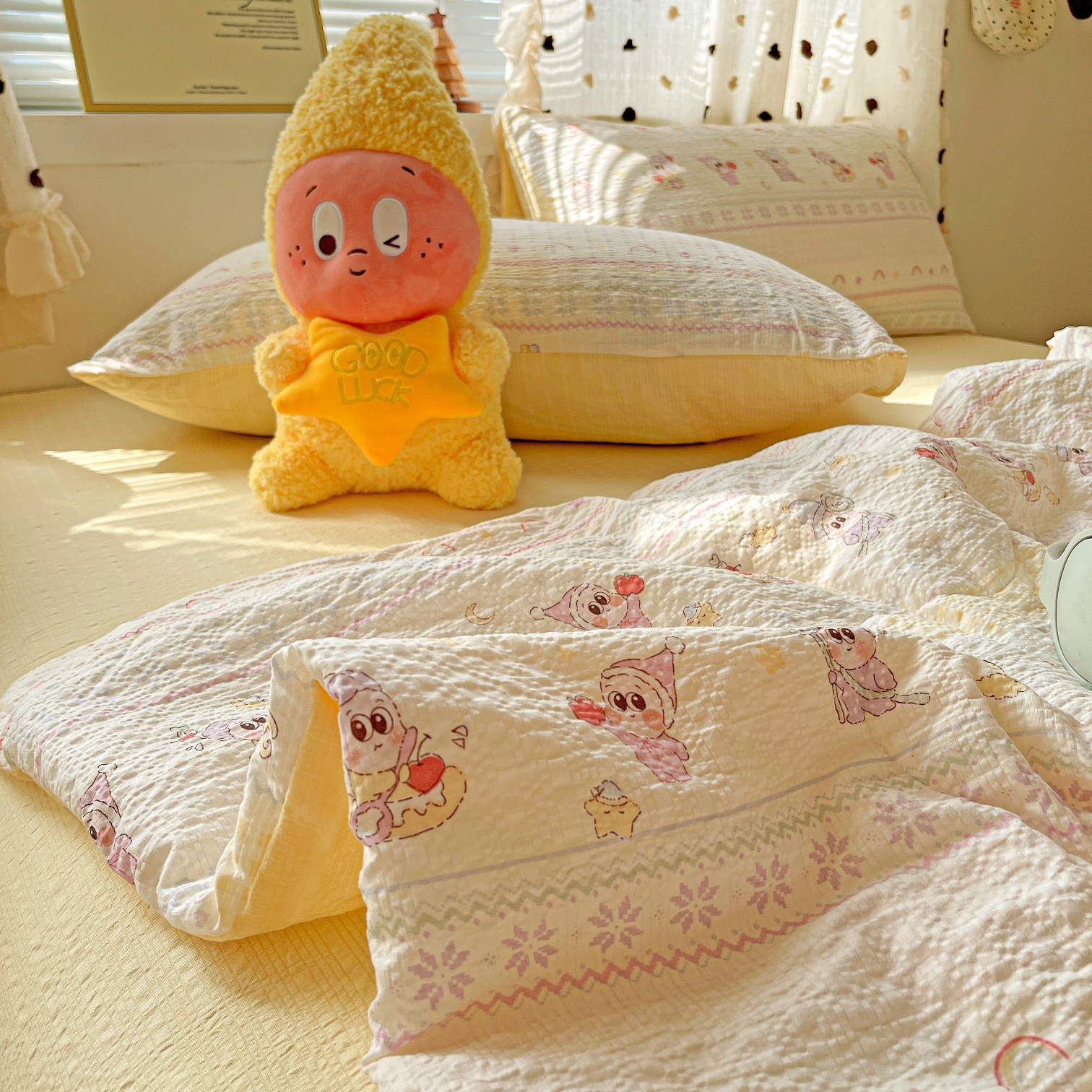 (总)一比一家纺 2026新款古法水洗仿棉云感纱A类四件套,知秋,白兰地,彩波波,草莓点点,格纹狗,嗨皮狗,赫莲娜,花千朵,花絮,酱果,蓝小格,莉莉安,梦幻灰,南瓜果果,葡萄,浅梦,森屿,疏影,甜心草莓,甜心喵,条纹狗,童趣,小黄花,小木马,小时光,小幸运,修修狗,薰衣草,灰樱桃,樱桃熊,鱼多多,组合图仅做展示不可下单,快乐时光