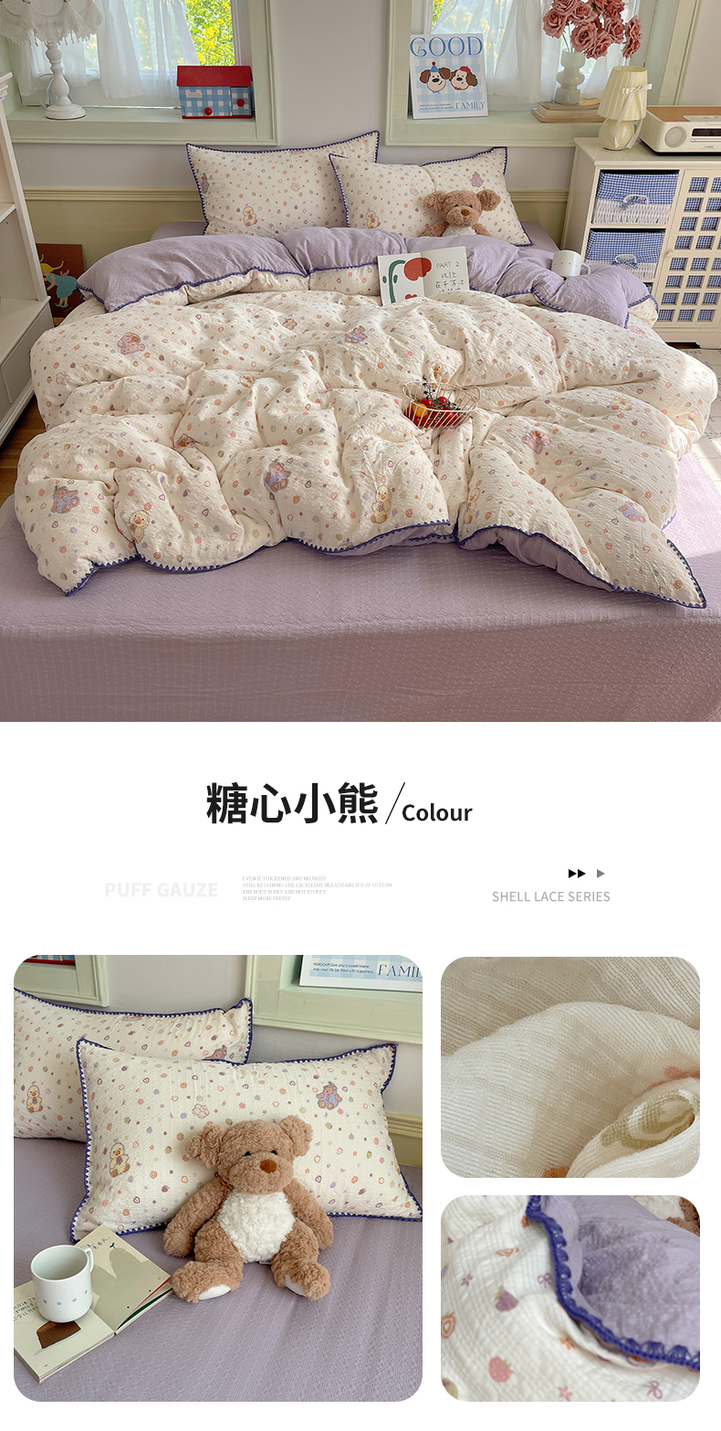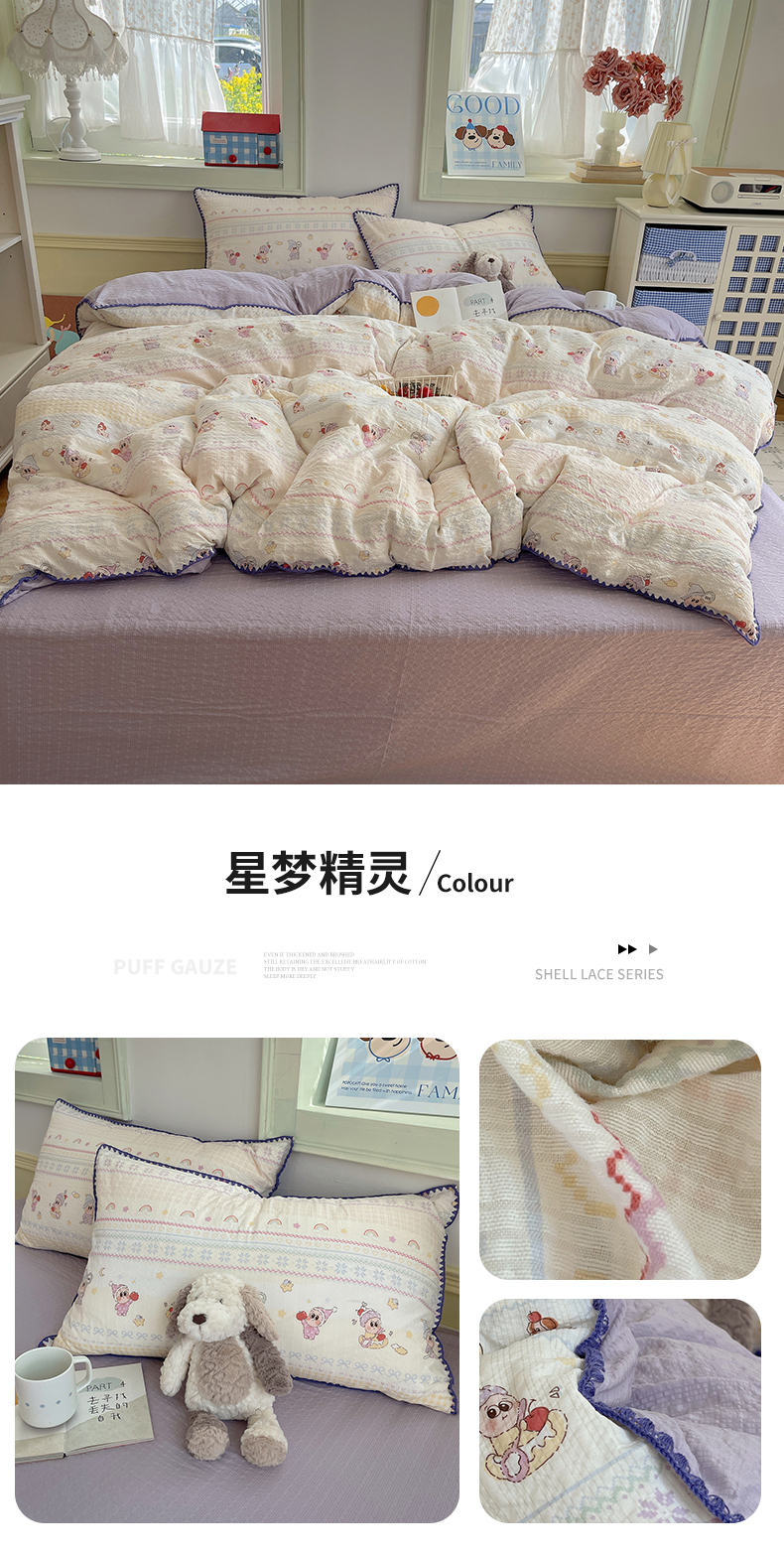 当前位置: 91家纺网 > 商品网购 > 床品套件 > 四件套 > 其它四件套 > 凯洛奇 2026春夏新款A类高品质泡芙纱贝壳边四件套 紫雾花事