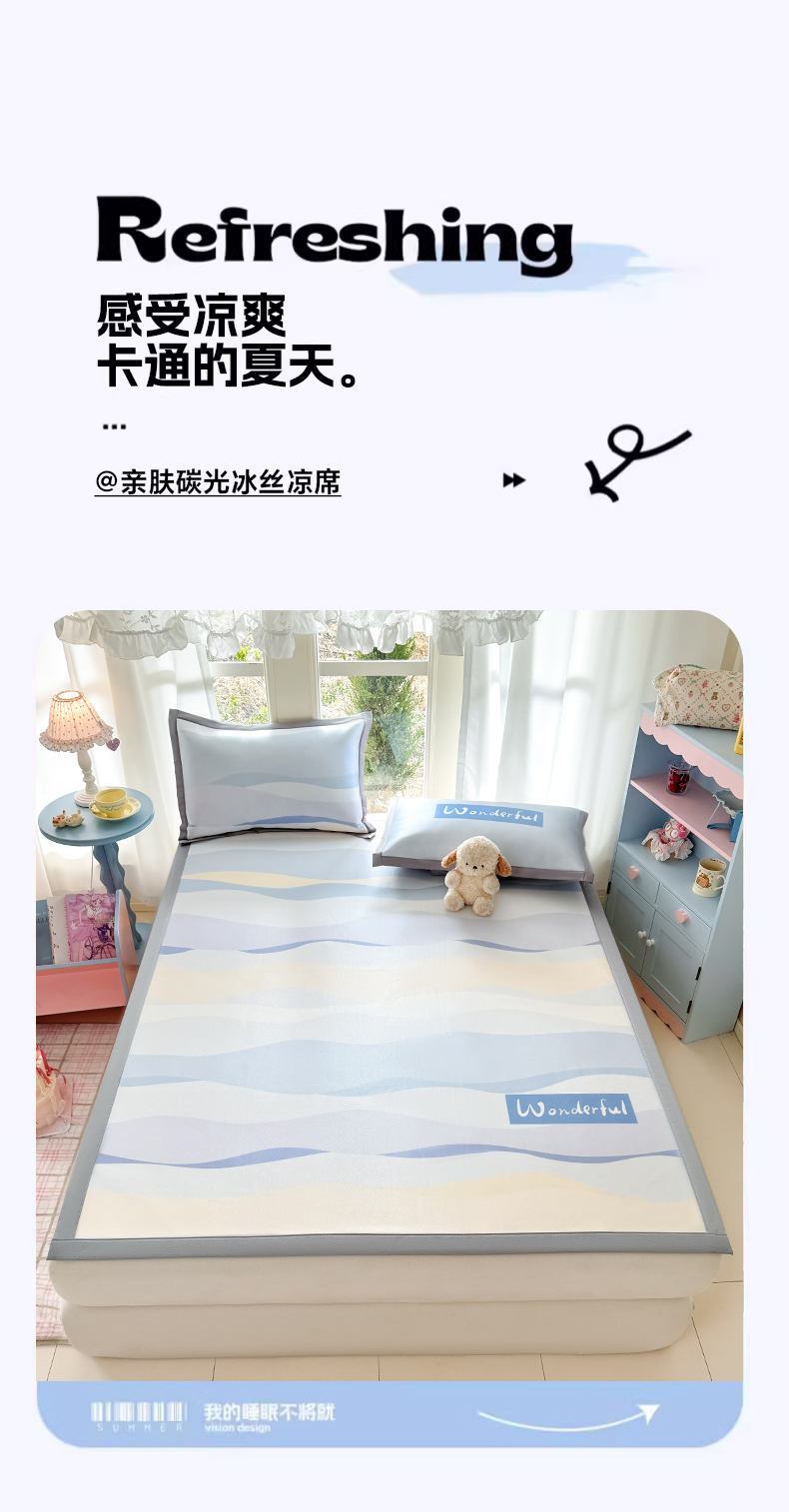 川悦生活 2026新款碳光冰丝大阪卡通凉席 bu卡卡-水蓝