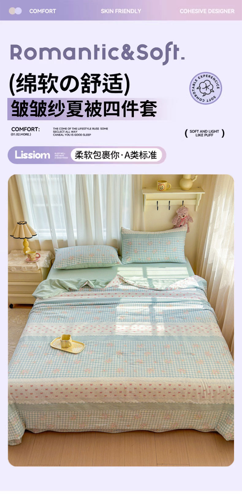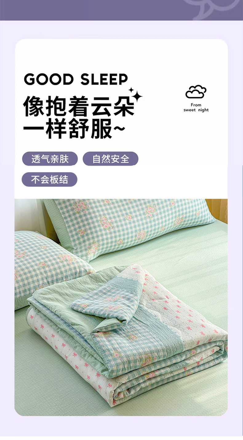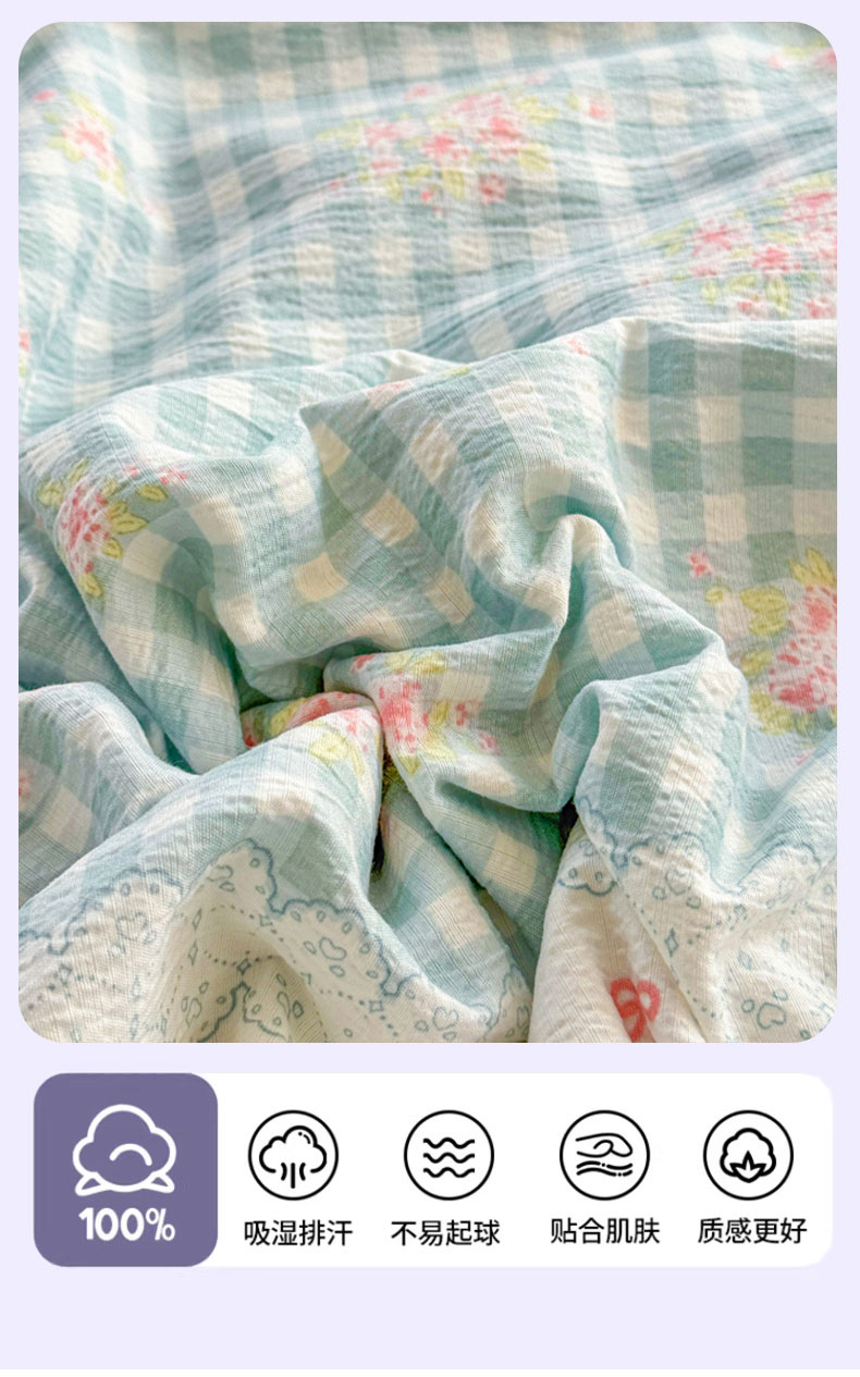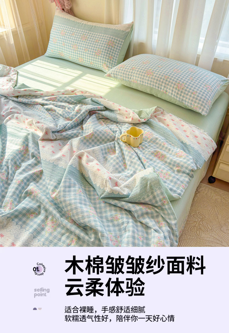 当前位置: 91家纺网 > 商品网购 > 床品套件 > 四件套 > 夏被四件套 > 梵希雅 2026新款A类木棉皱皱纱夏被 青格花信