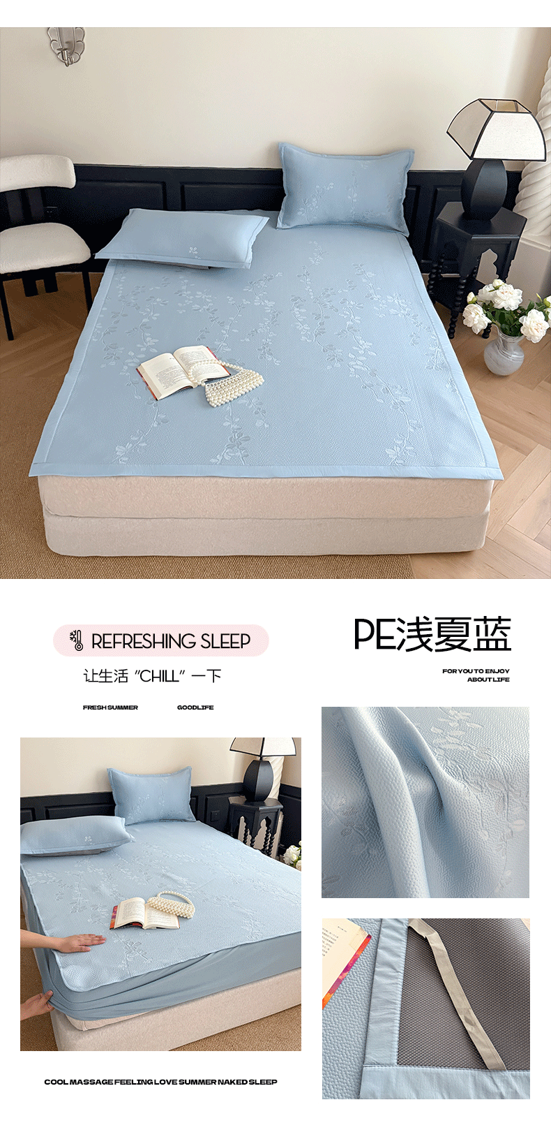 (总)吾欢心 2026新款高端复合三明治PE乙纶双面提花高克重凉席三件套浅夏系列,组合图仅供展示不可下单,PE浅夏粉-床席款,PE浅夏灰-床席款,PE浅夏蓝-床席款,PE浅夏绿-床席款,PE浅夏粉-床笠款,PE浅夏灰-床笠款,PE浅夏蓝-床笠款,PE浅夏绿-床笠款