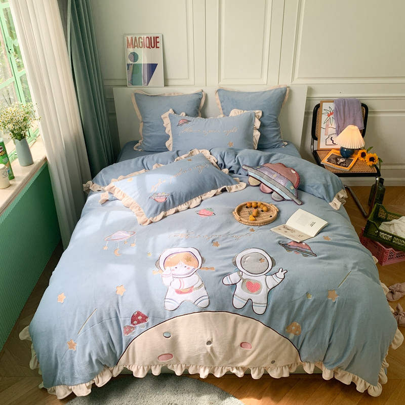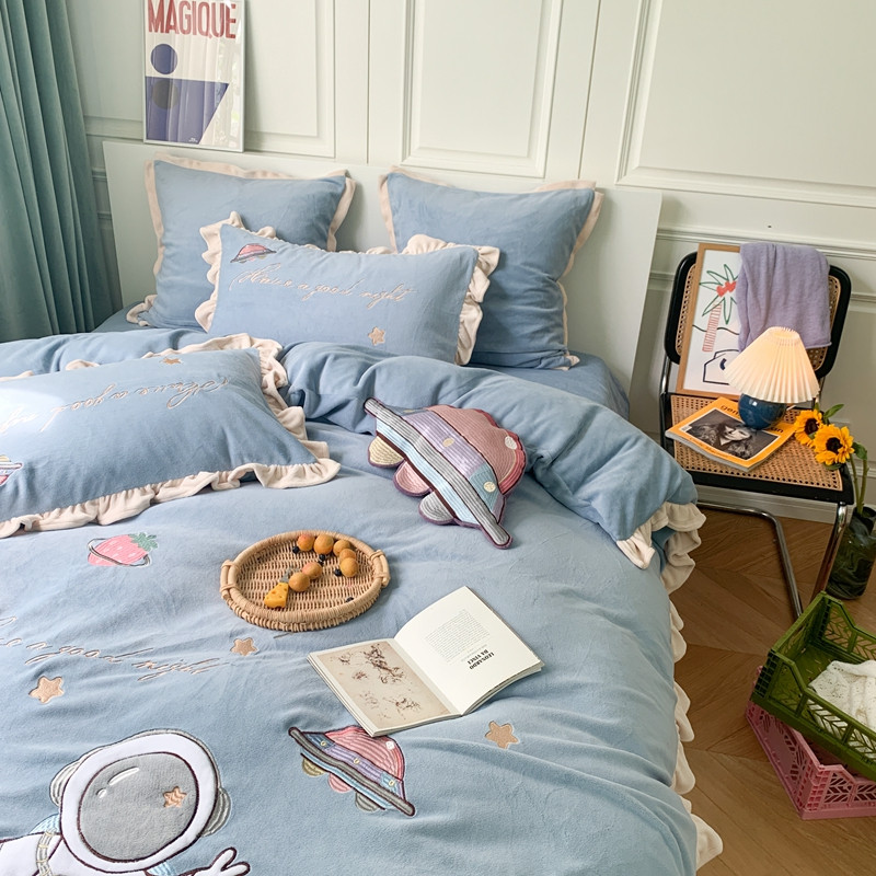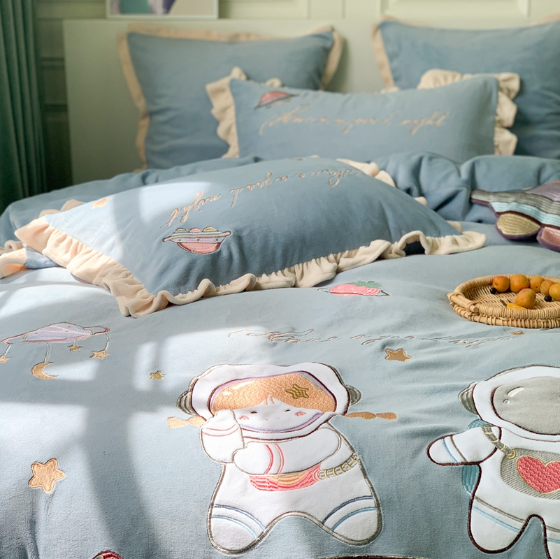 柚子YOUTH 2021新款牛奶绒工艺款四件套-实拍 星球漫步蓝