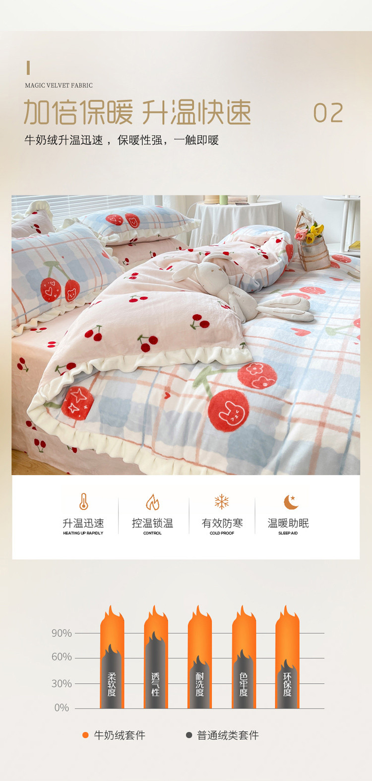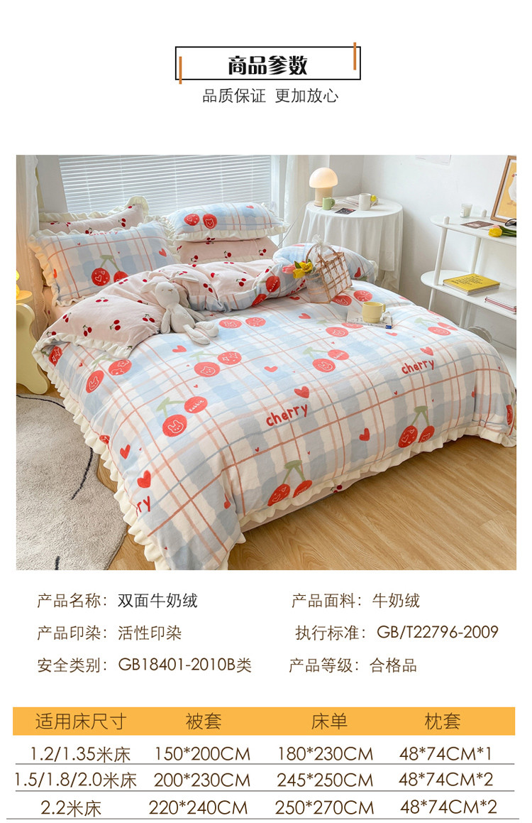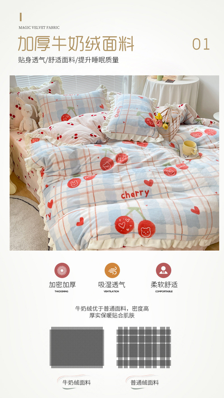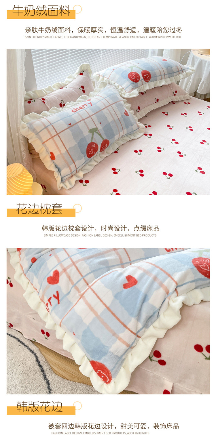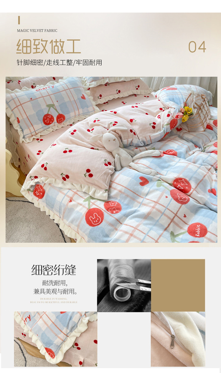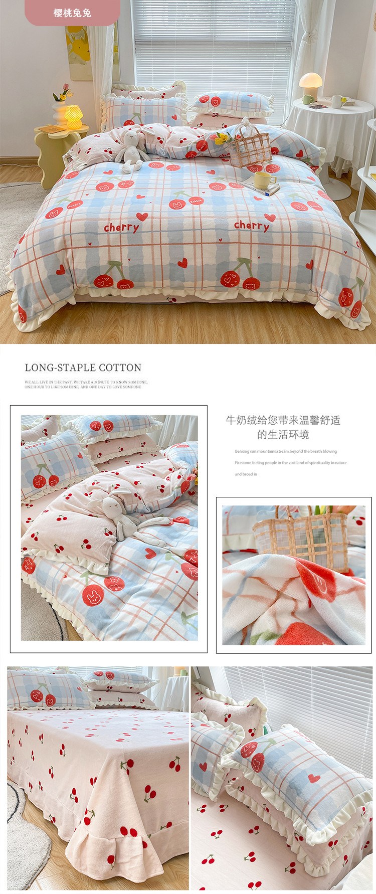 商品名称:眠帛 2021新款小清新花边款牛奶绒四件套 樱桃兔兔
