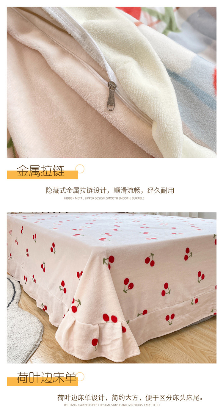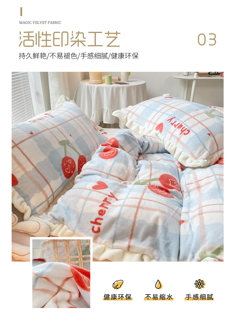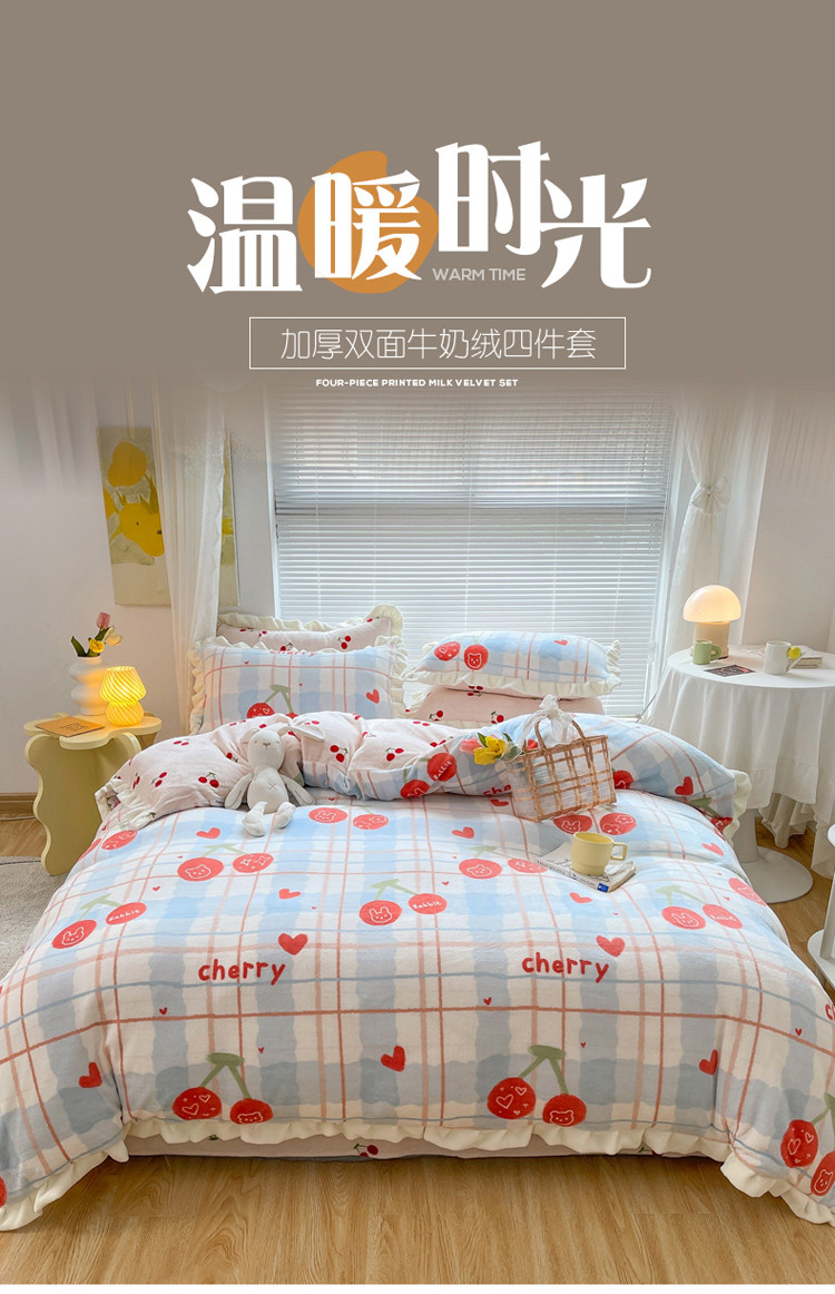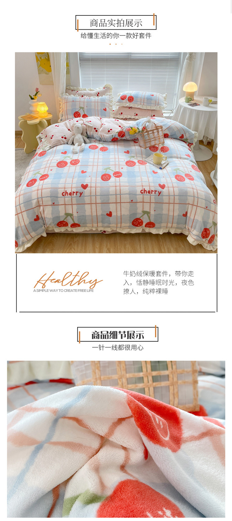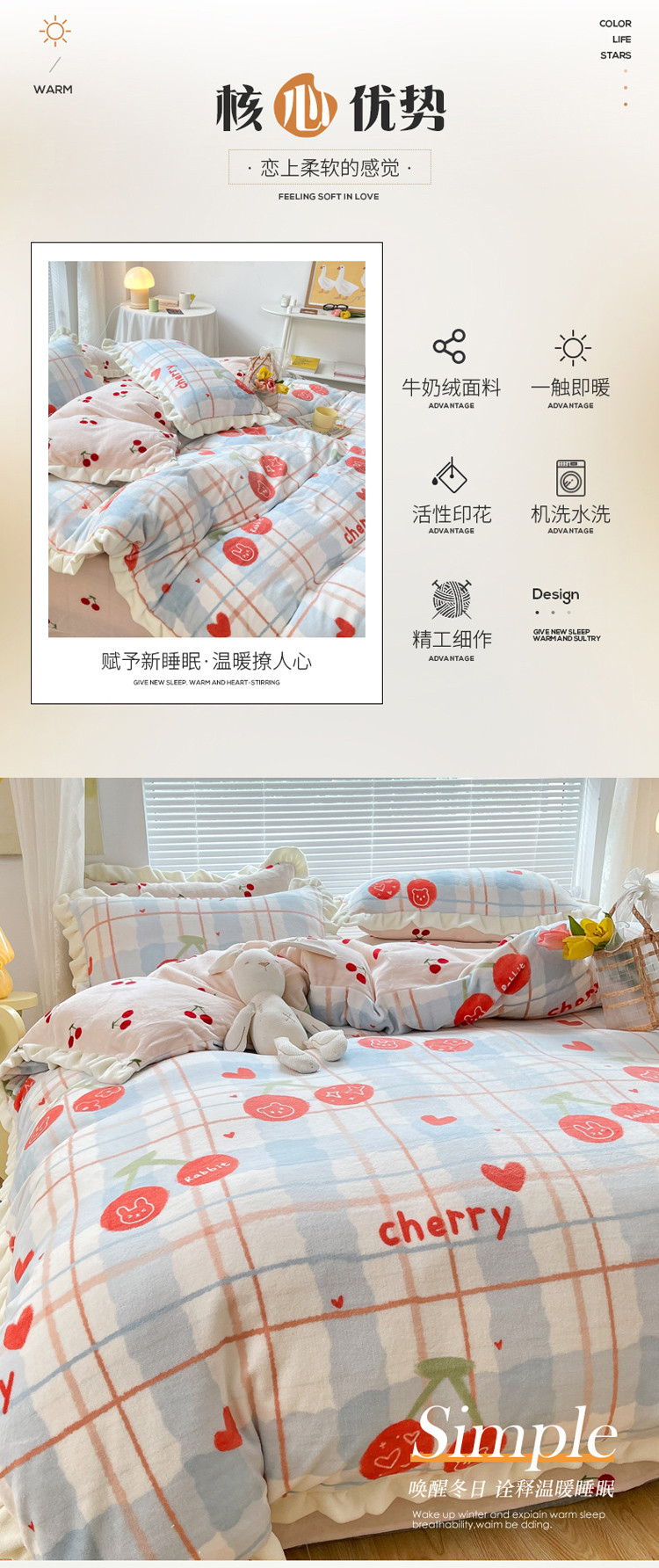 商品名称:眠帛 2021新款小清新花边款牛奶绒四件套 樱桃兔兔