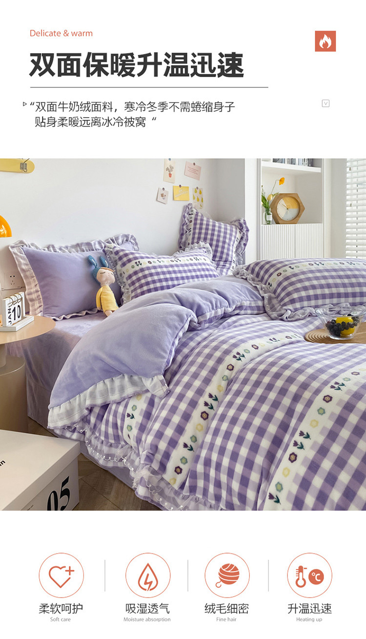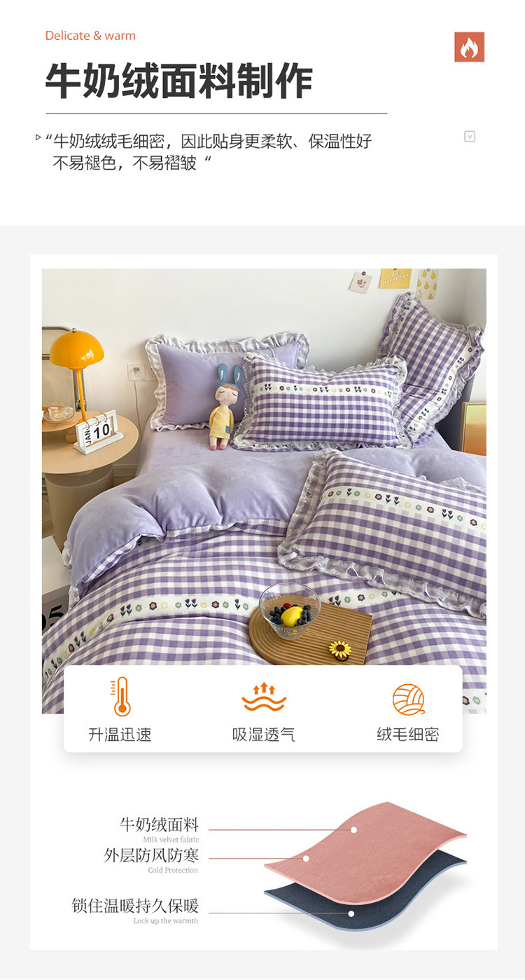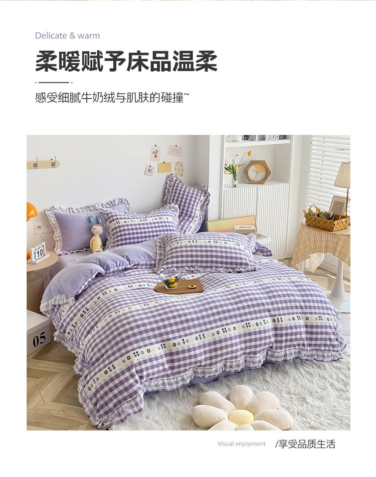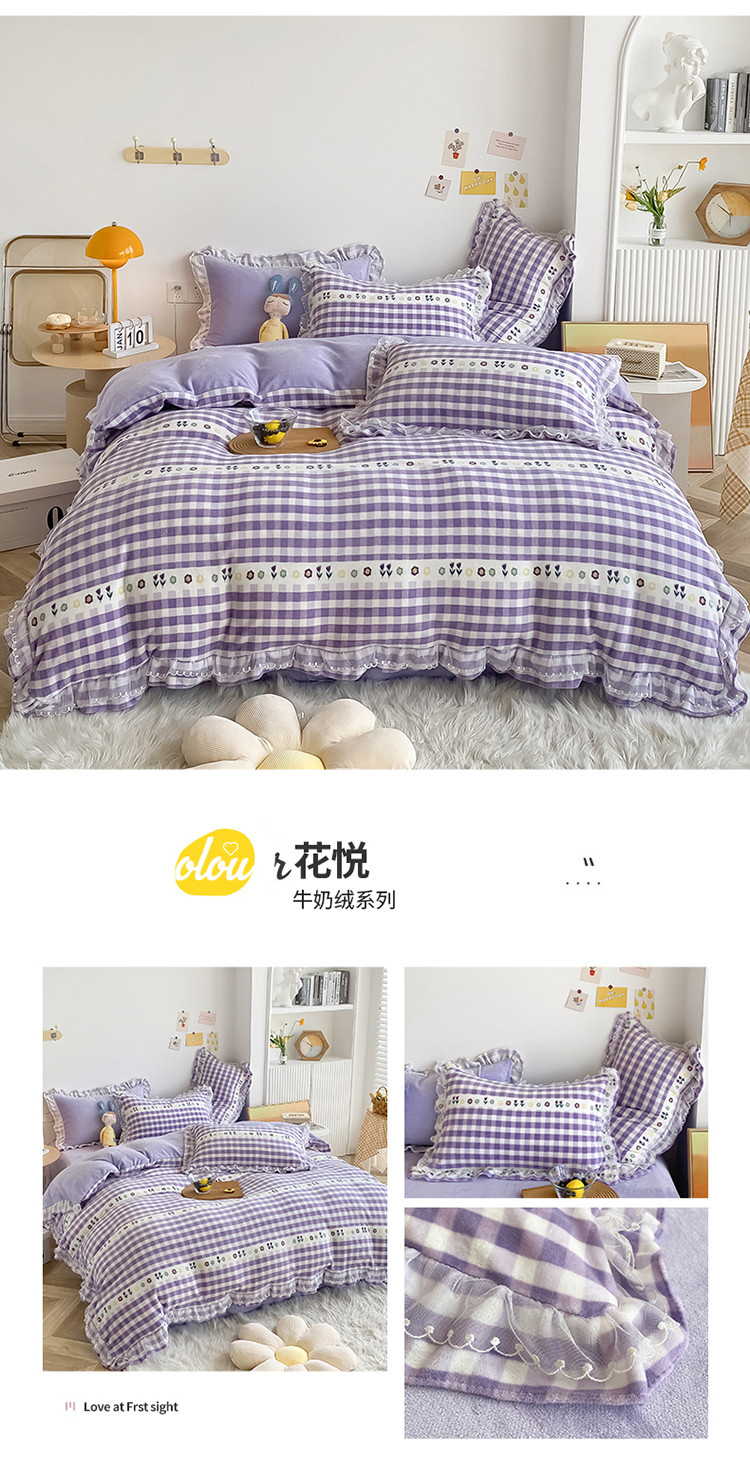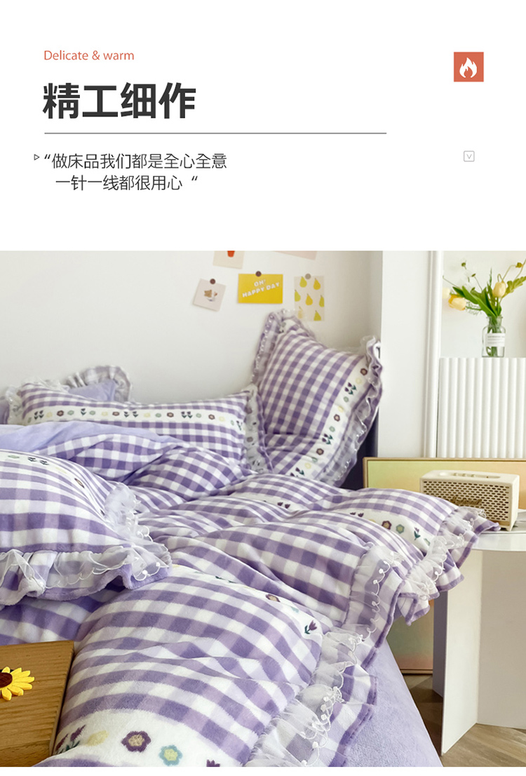 眠屿家纺 2021新款韩版双层花边高克重牛奶绒四件套 花悦
