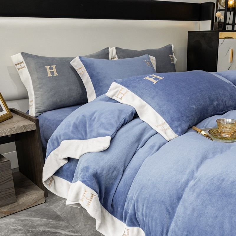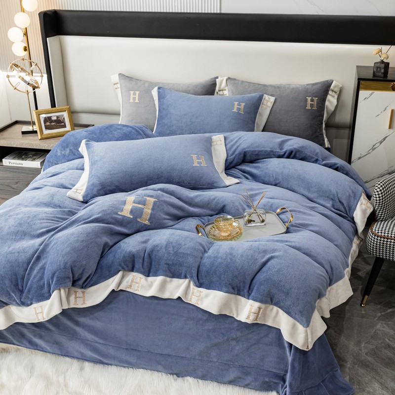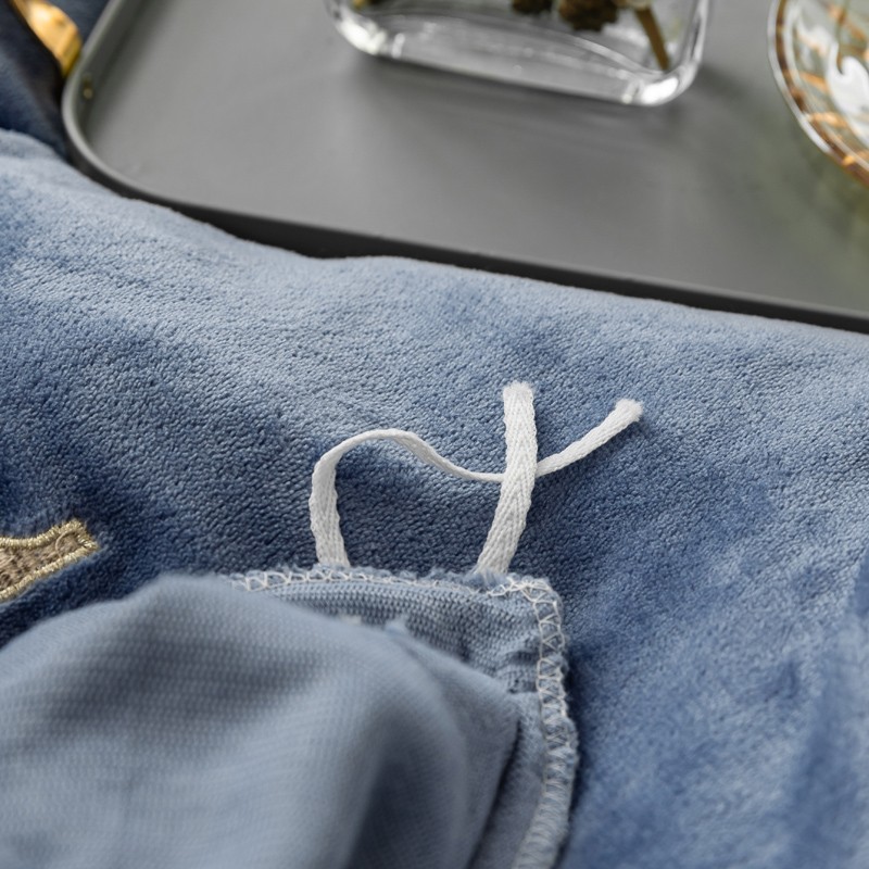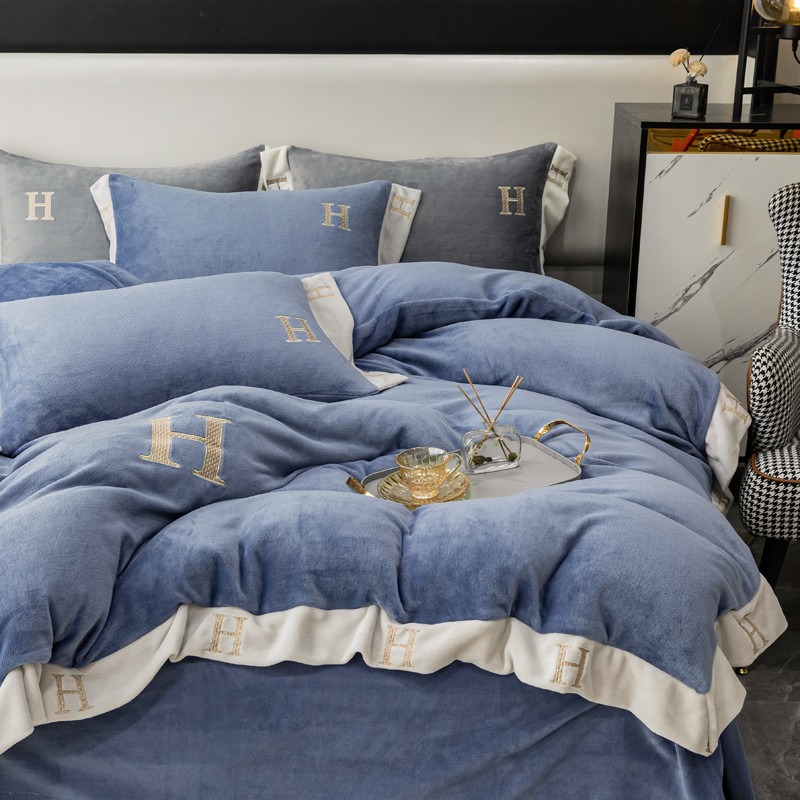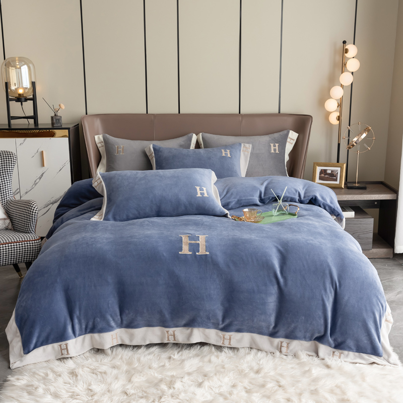 芯贝儿 2021新款加厚牛奶绒轻奢宽边刺绣四件套 希腊蓝