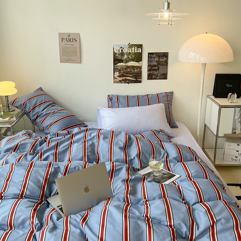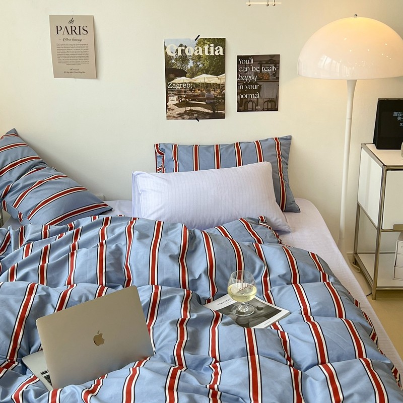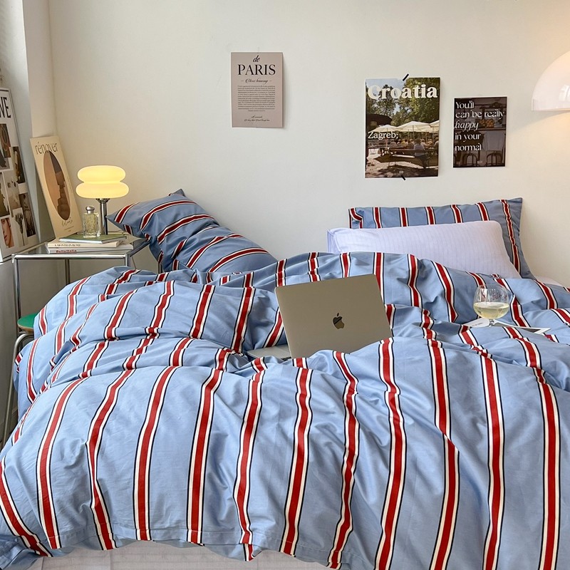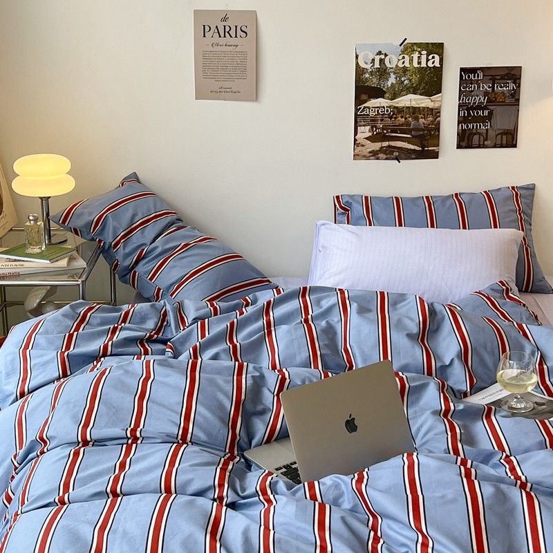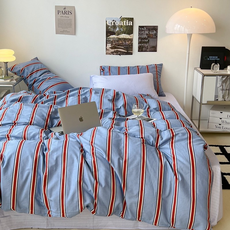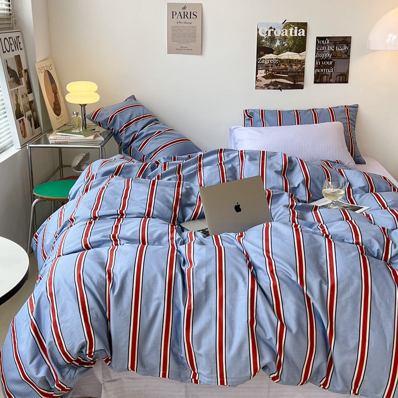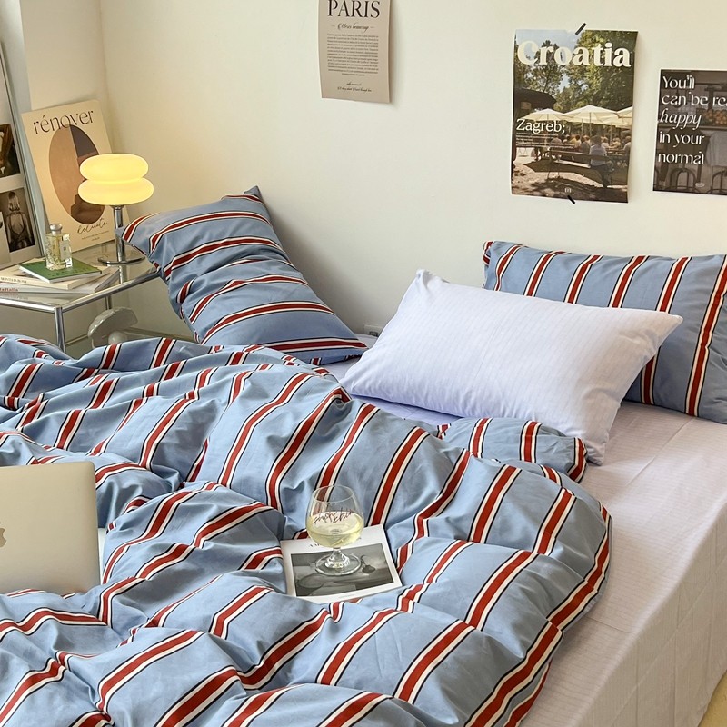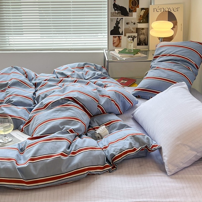 昔可家纺2022新款韩风简约条纹全棉套件混搭款 混搭红蓝条