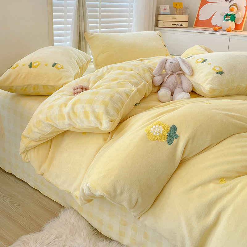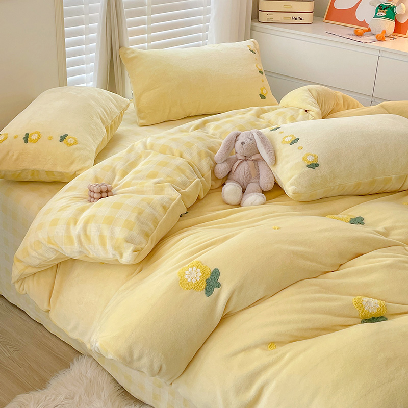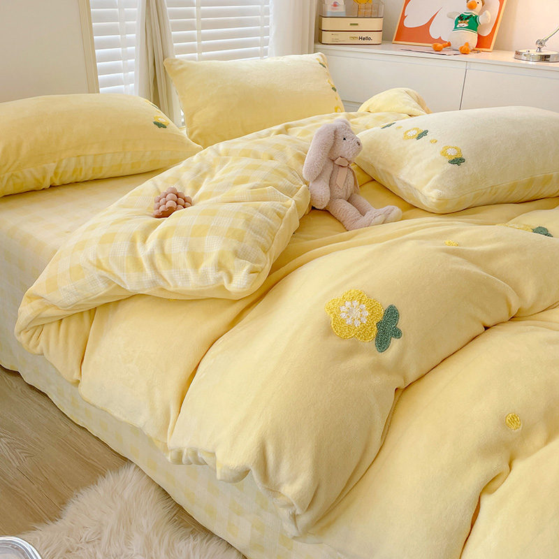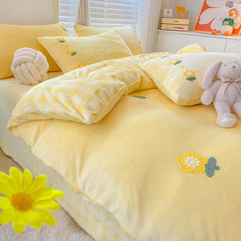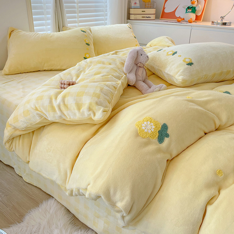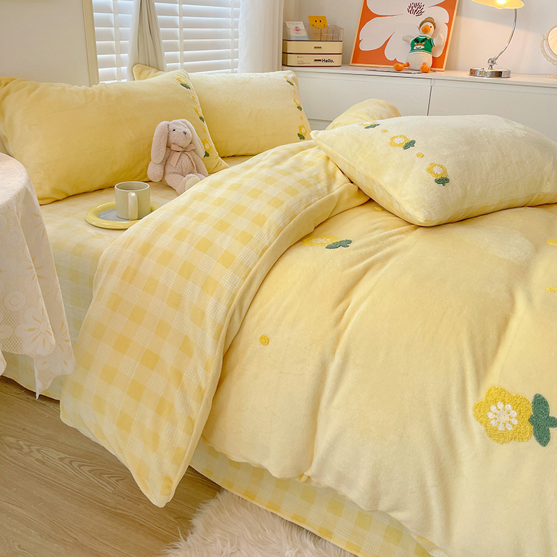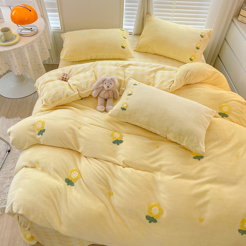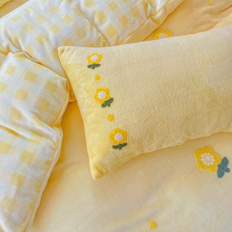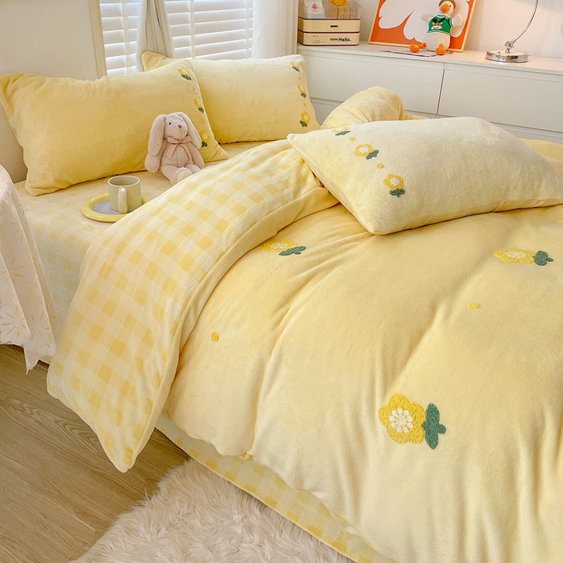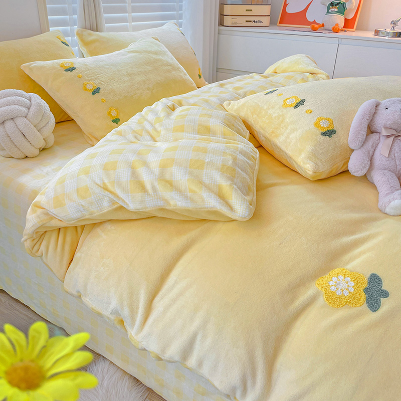 麦朵2022新款毛巾绣牛奶绒四件套格子双拼法莱水晶四件套 黄色小花