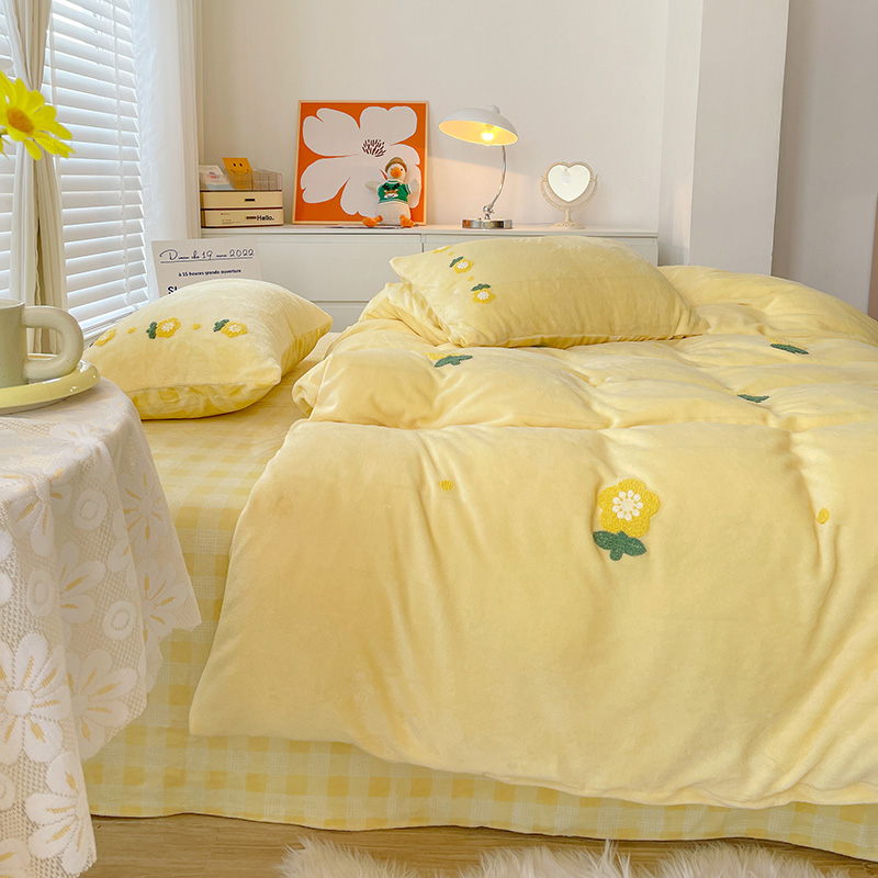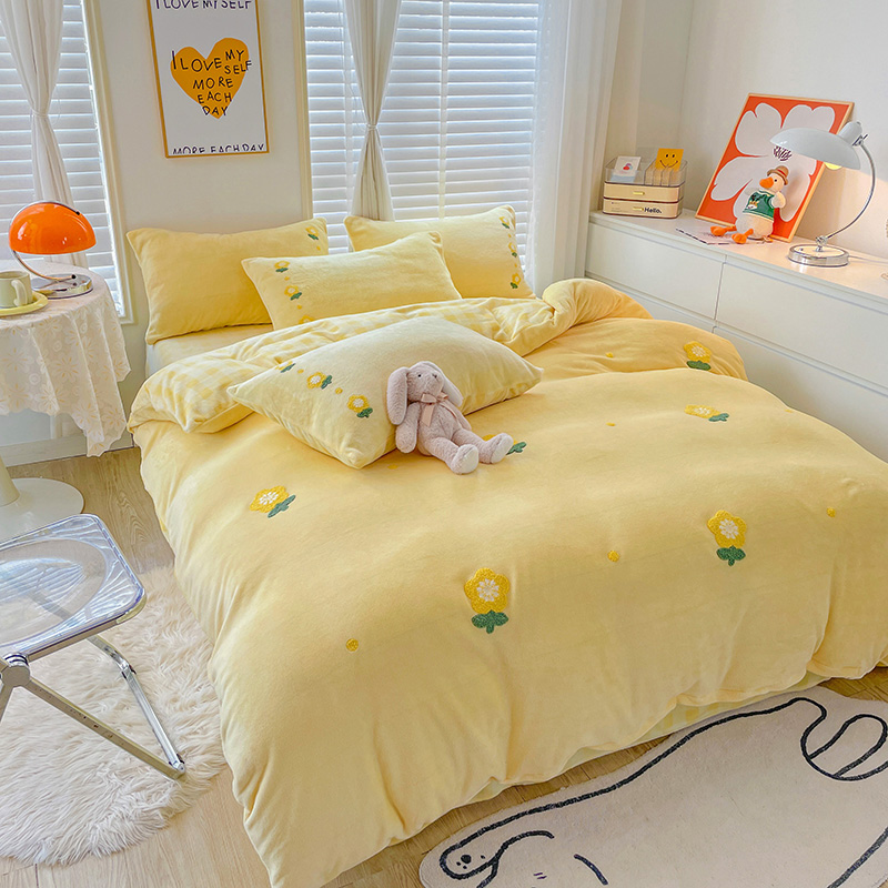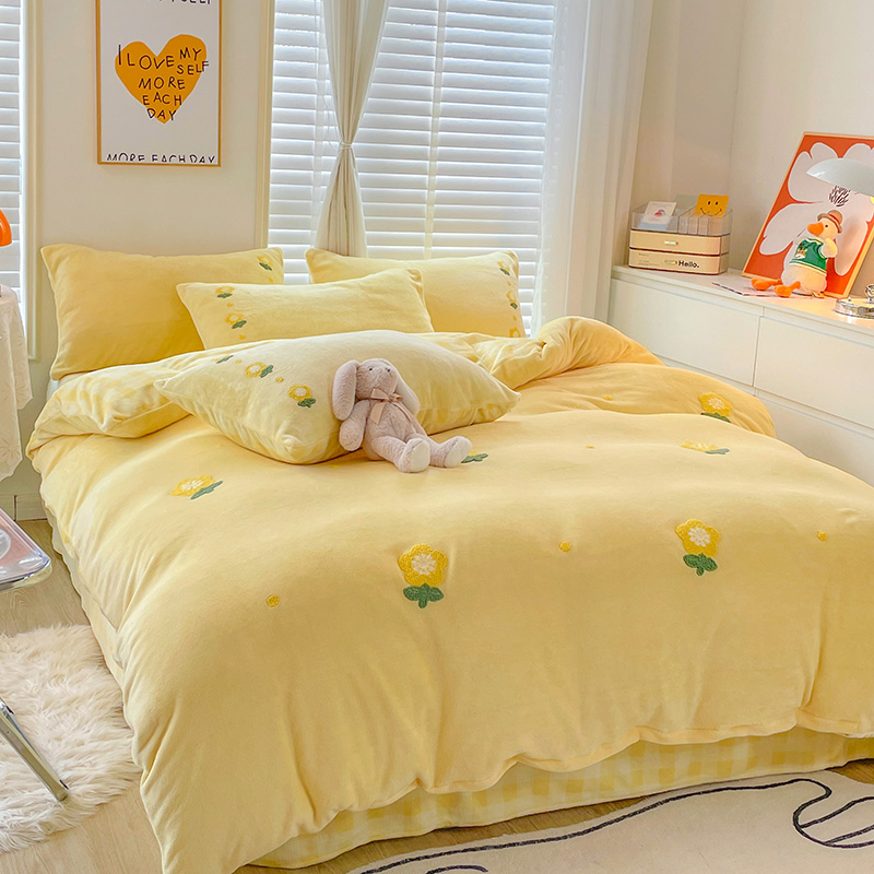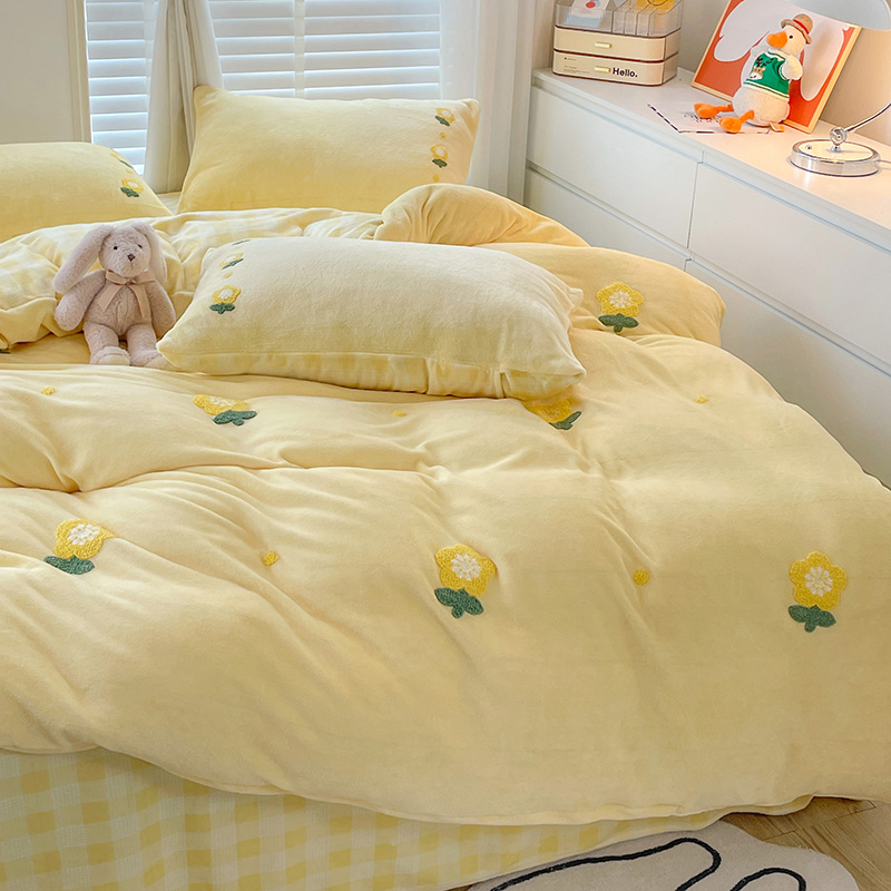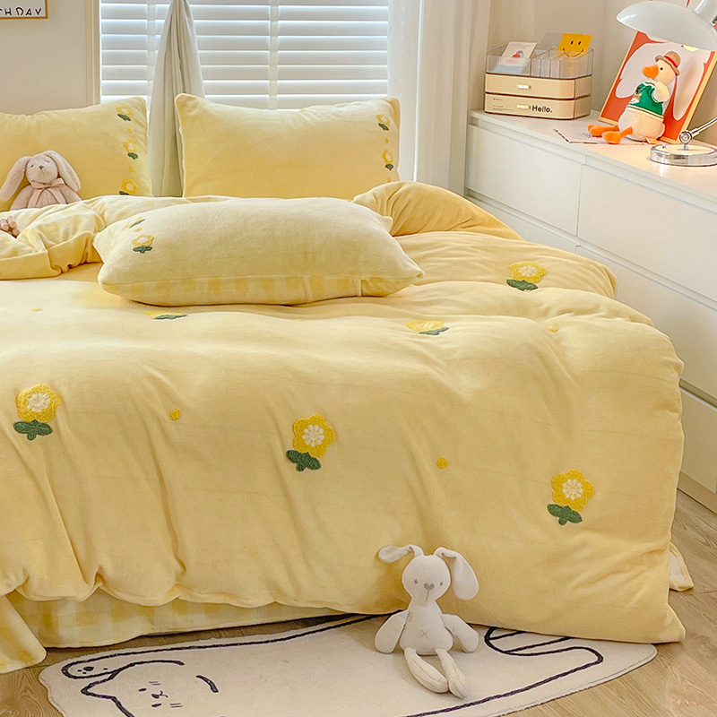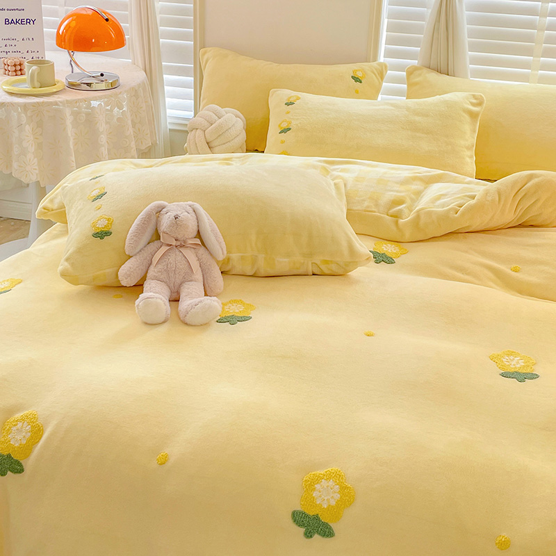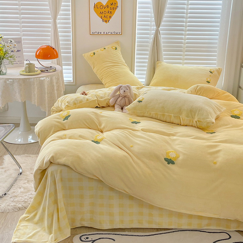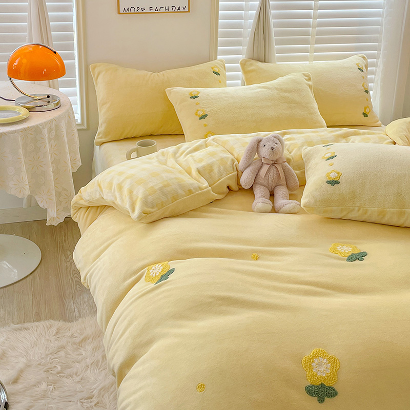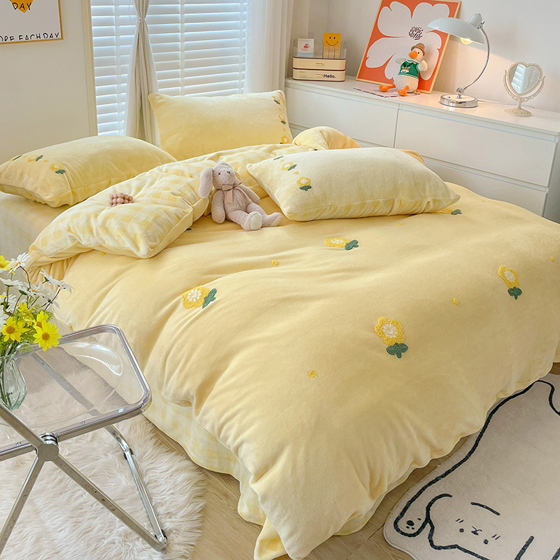 麦朵2022新款毛巾绣牛奶绒四件套格子双拼法莱水晶四件套 黄色小花