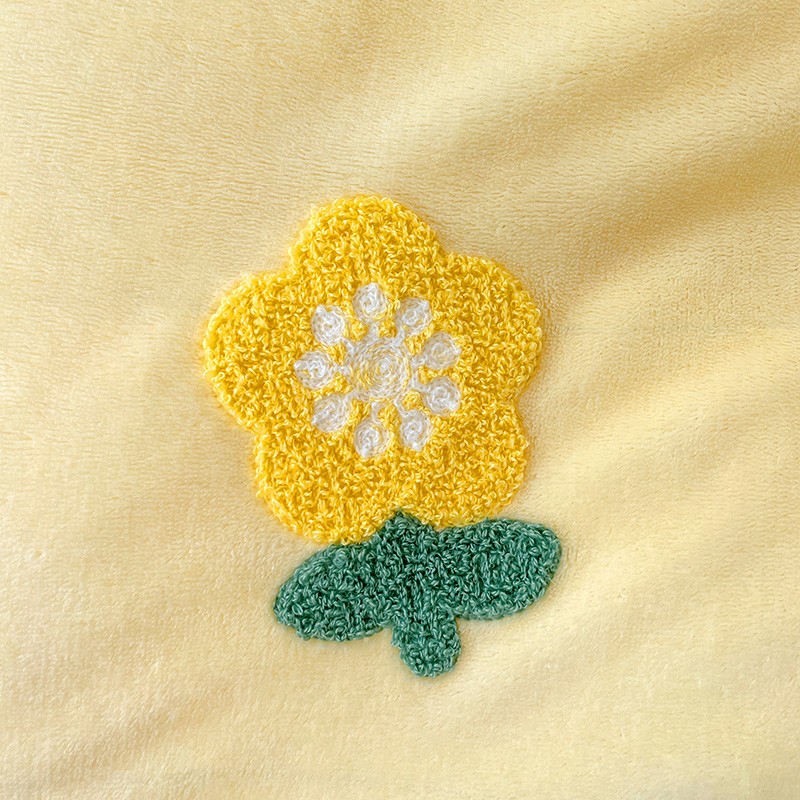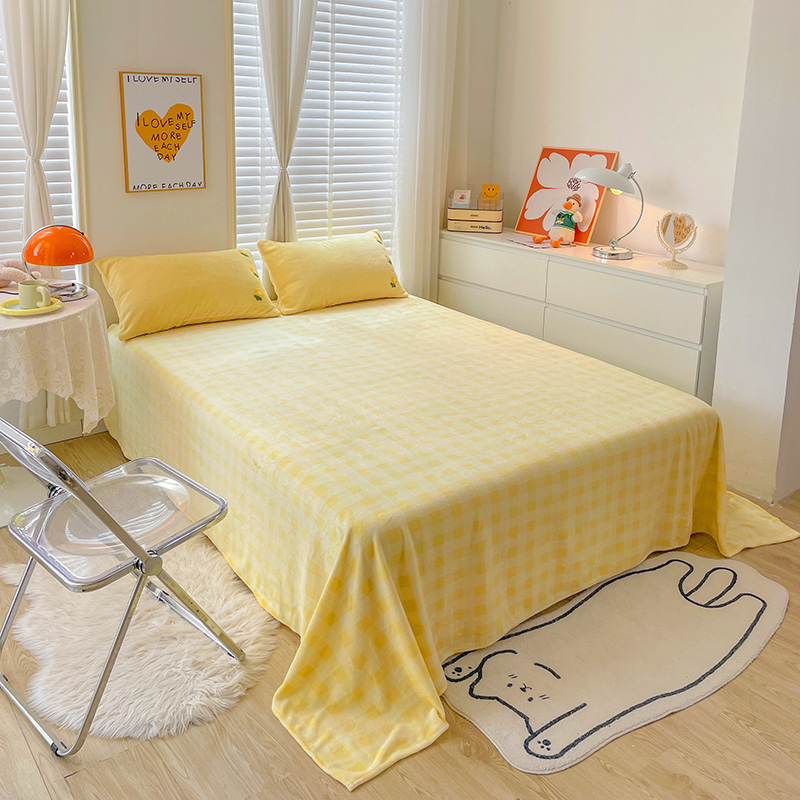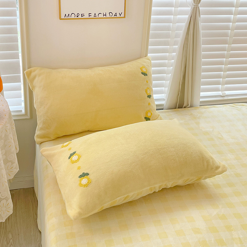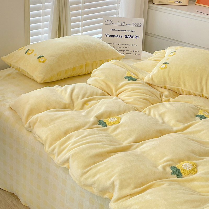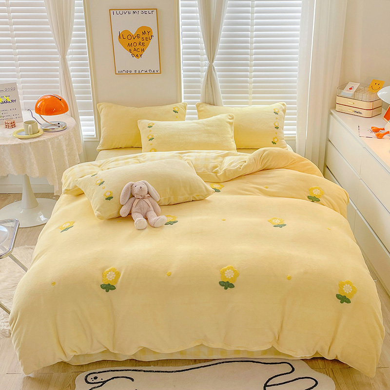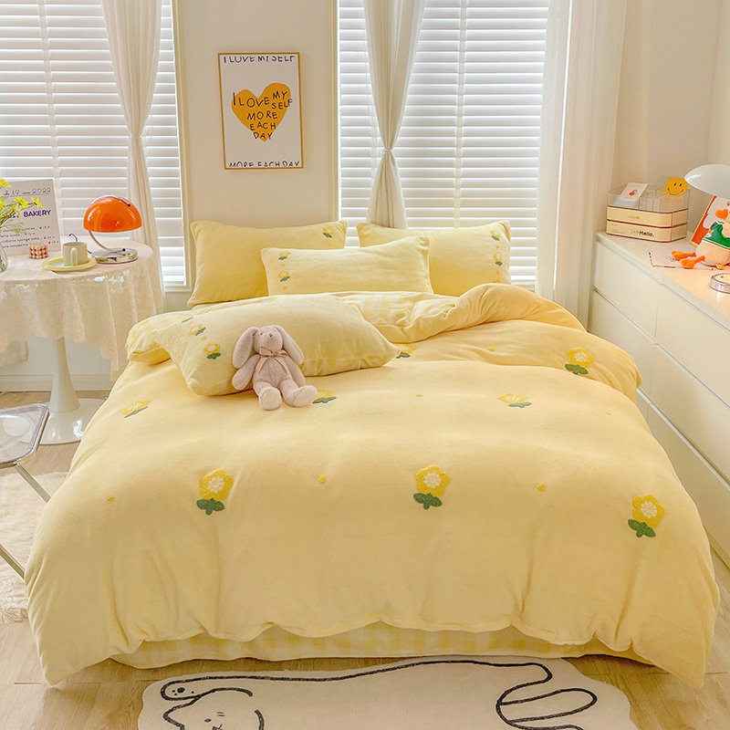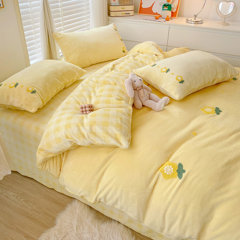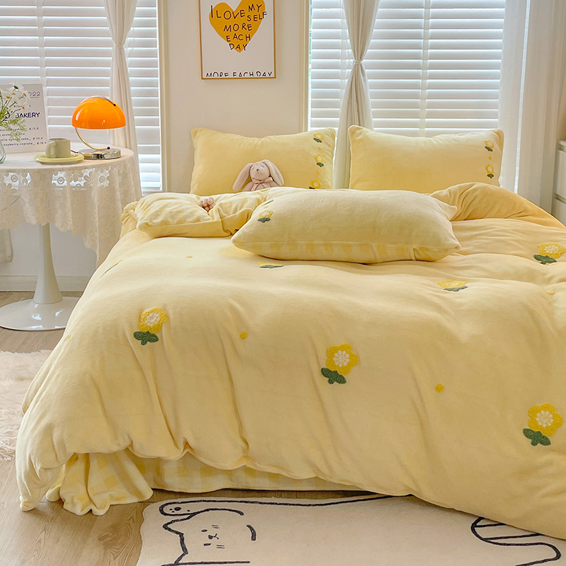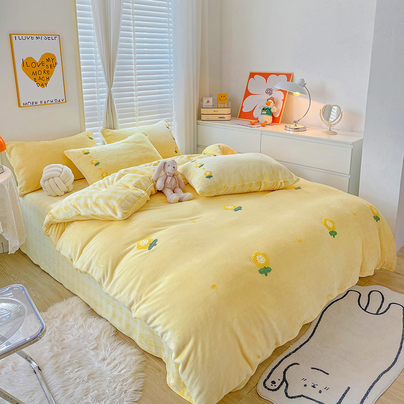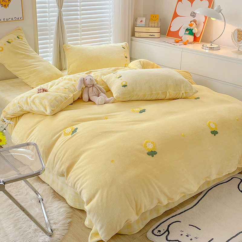 麦朵2022新款毛巾绣牛奶绒四件套格子双拼法莱水晶四件套 黄色小花
