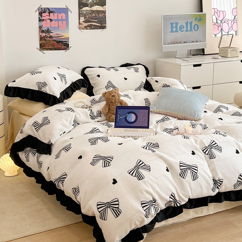 昔可 2022新款花边牛奶绒四件套 赫本蝴蝶结