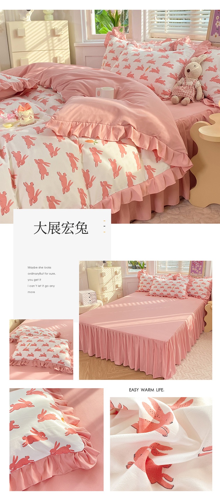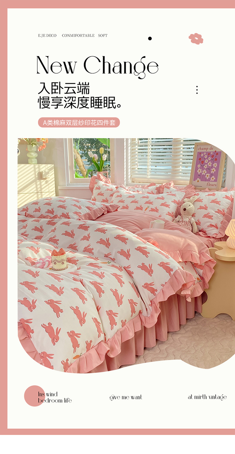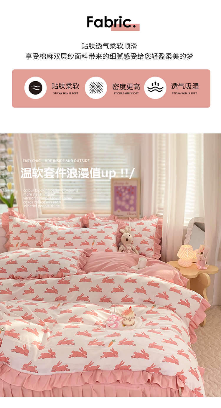 当前位置: 91家纺网 > 商品网购 > 床品套件 > 四件套 > 棉麻四件套 > 梦之岛 2023新款棉麻水洗双层纱床裙四件套 大展宏兔