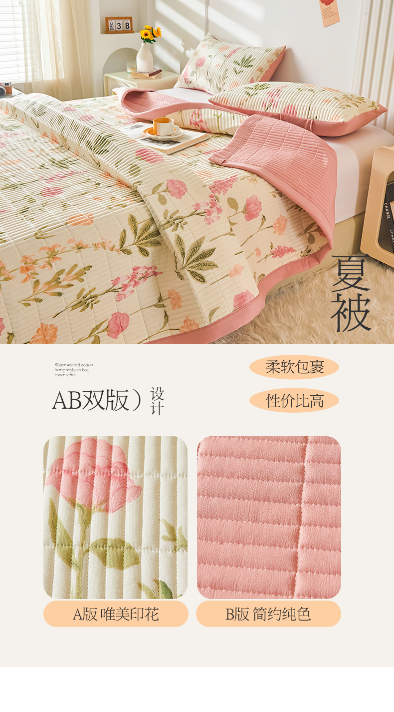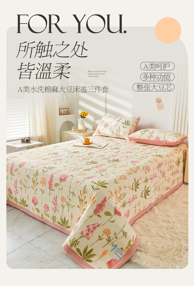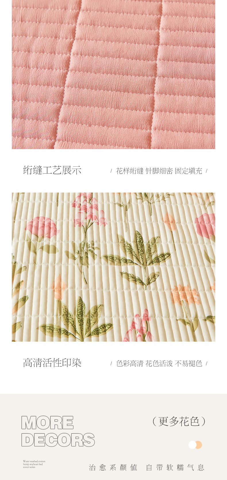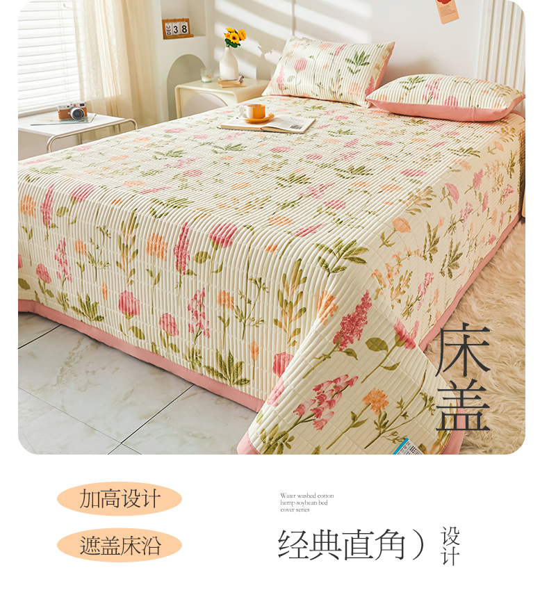 水洗棉麻床盖大豆纤维夹棉加厚宿舍铺盖两用床单床裙保护垫 繁花似锦