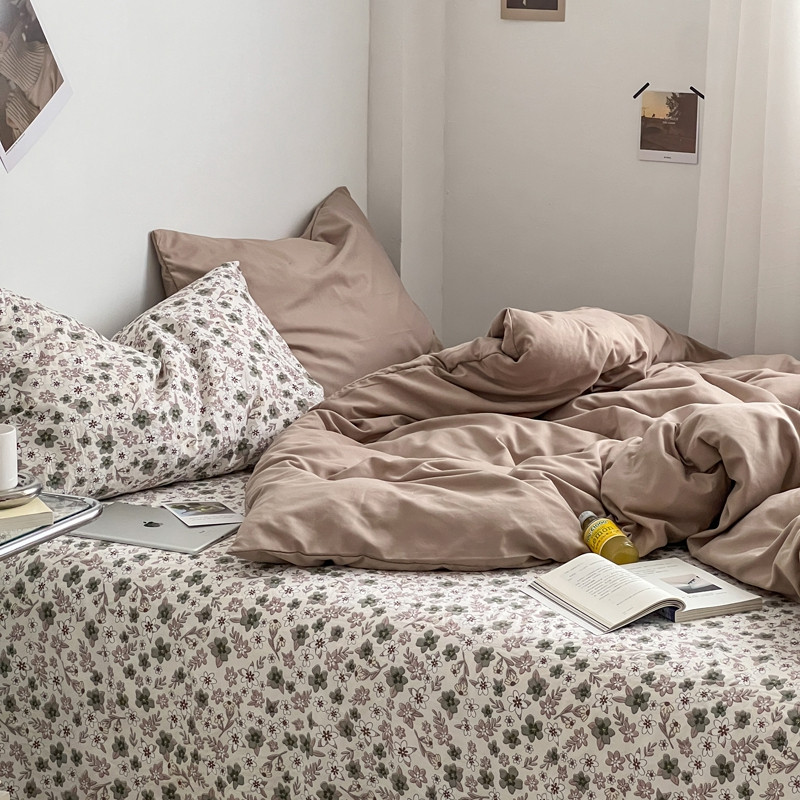 直播热款水洗棉双层纱四件套碎花简约风床单单品单件 卡其+繁花