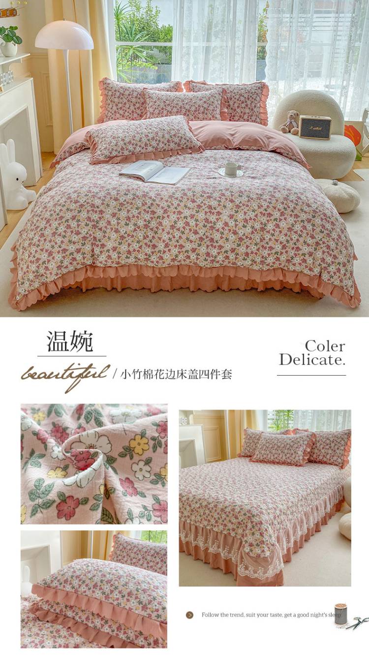 (总)艺慕 2025新款双层纱水洗棉麻蕾丝花边床盖,春意,粉色玫瑰,红豆,青花瓷,太阳花绿,屋顶花园,夕颜,夏日仙草,心动绿,萌兔子,花丛兔