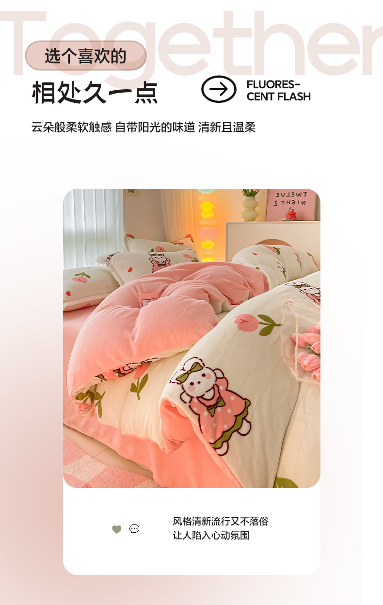 (总)莱米 2023新款直播爆款牛奶绒豆豆绒四件套高克重豆豆绒四件套,爱心小熊,缤纷花语,纯色—白+粉,纯色—白+卡其,纯色—深灰,纯色—樱花粉,花海,花样年华,浪漫小兔,绿野仙踪,萌萌兔,秘密花园,浅夏,兔兔乐园,银杏叶,字母小狗