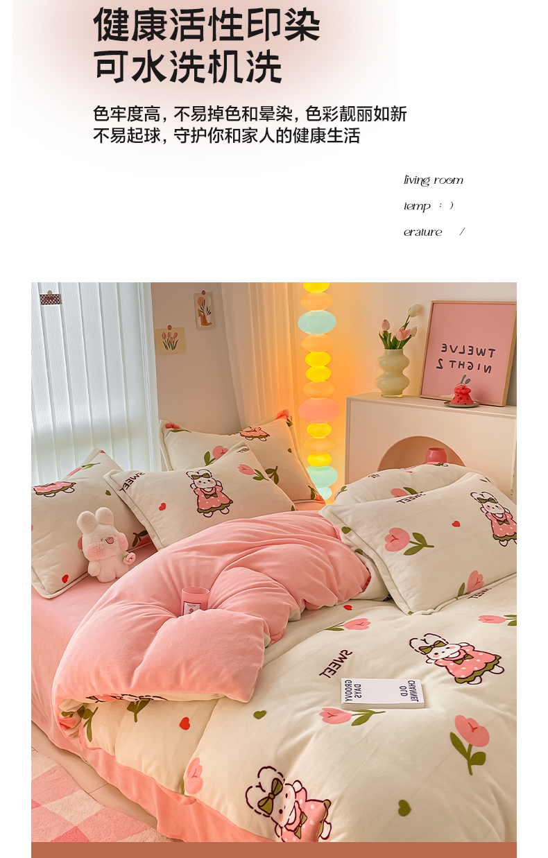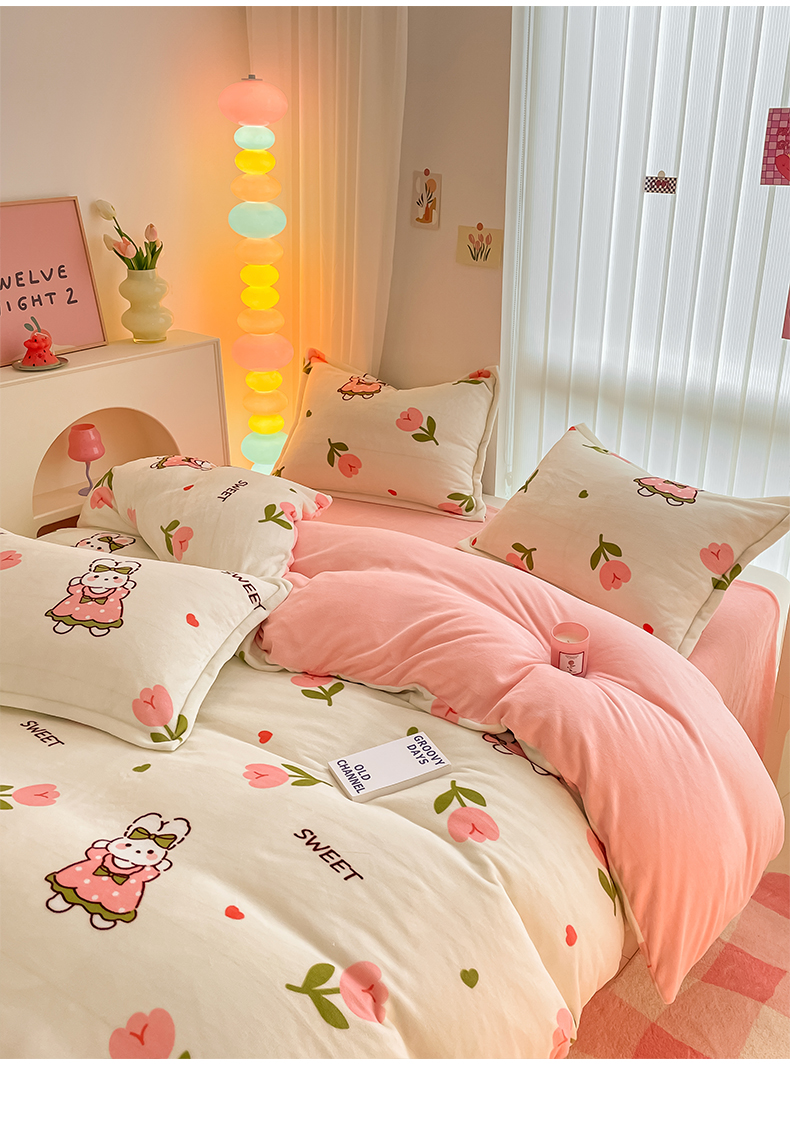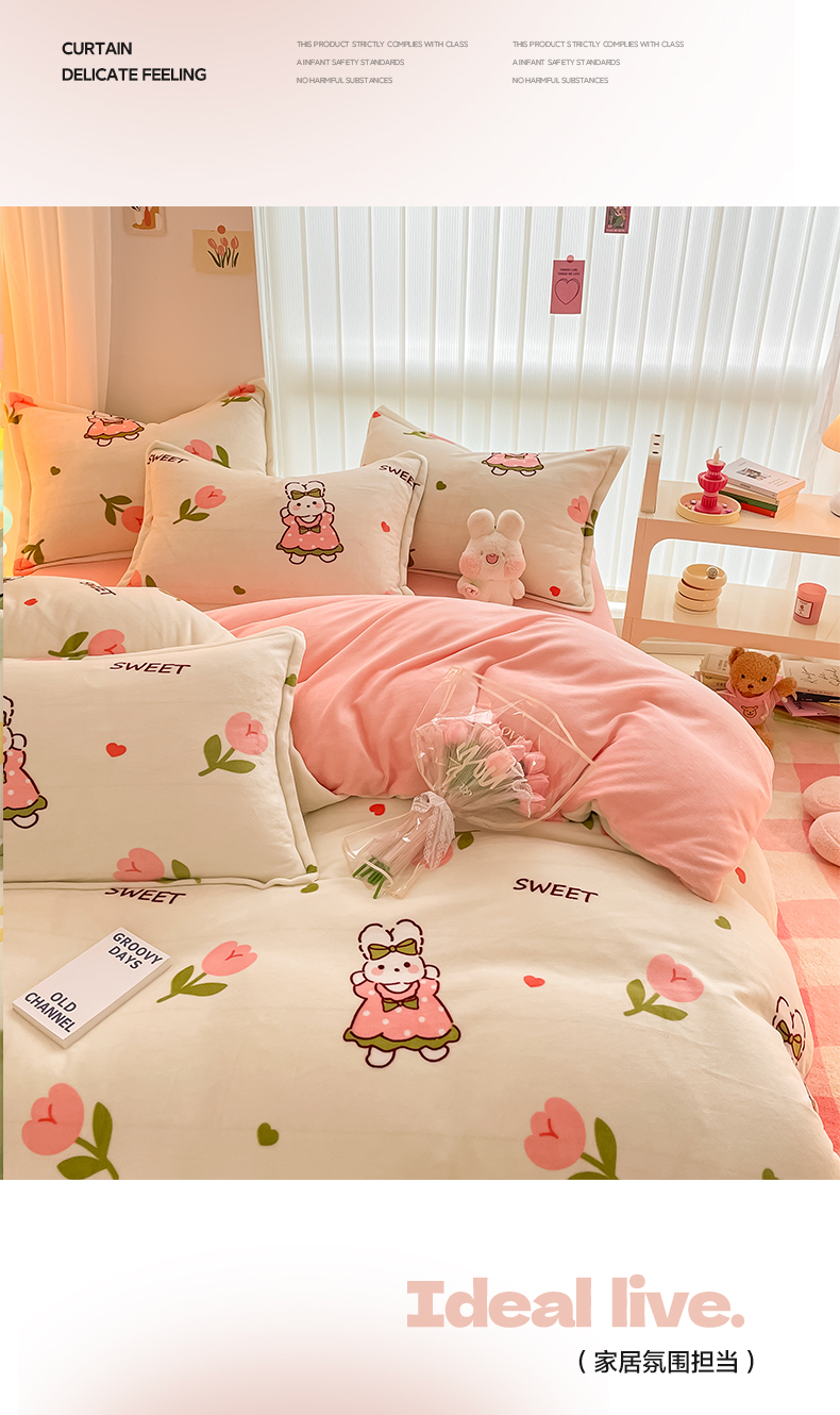 莱米家纺 2023新款小版牛奶绒印花四件套 花丛小兔
