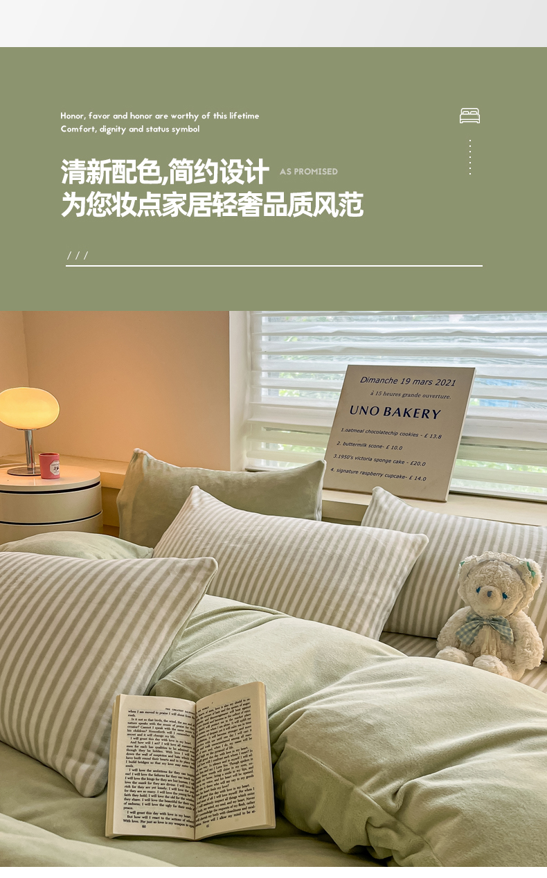 当前位置: 91家纺网 > 商品网购 > 床品套件 > 四件套 > 牛奶绒四件套 > 三朵家纺 2023新款牛奶绒混搭系列四件套 果绿+细条