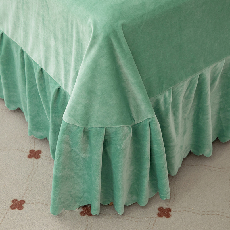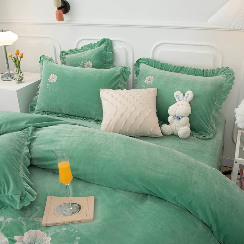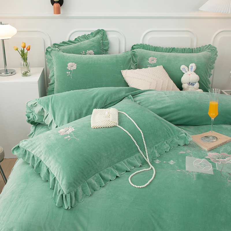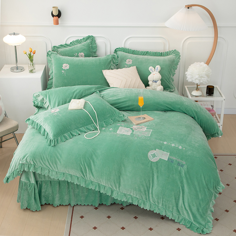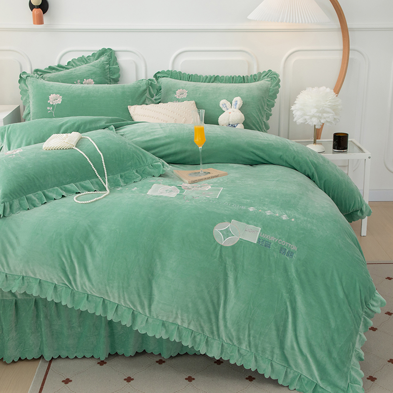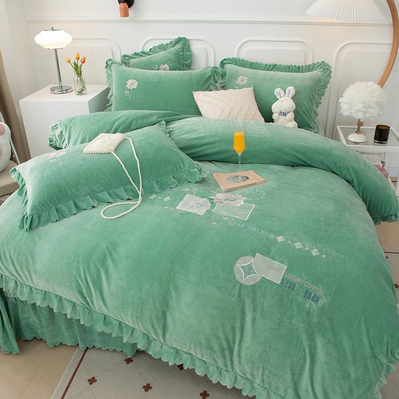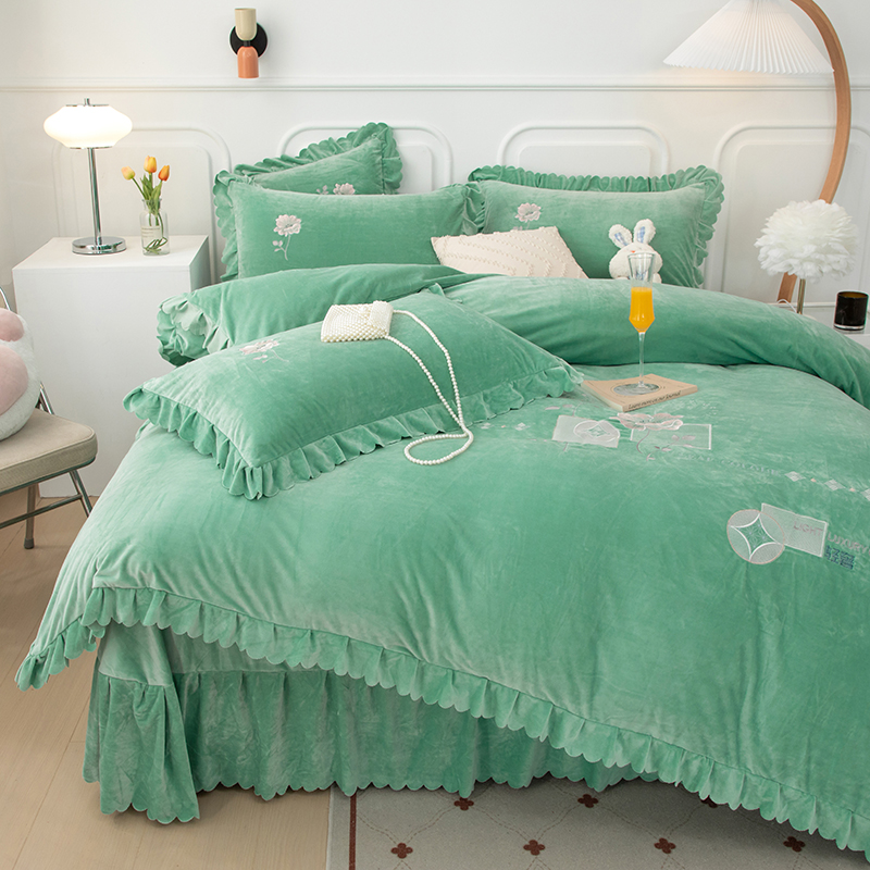 优姿家纺 2024新品8.5斤德芙绒韩版床裙绣花保暖四件套 绽放浅绿