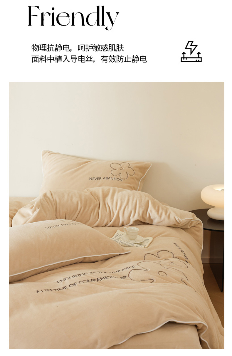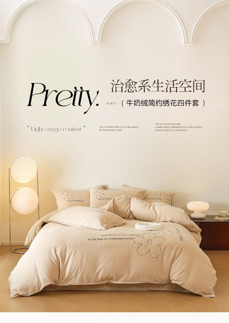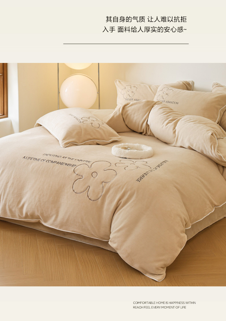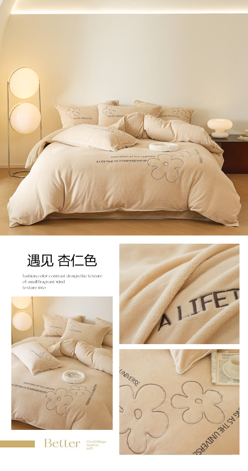 万盛家纺 2025新款牛奶绒简约绣花四件套 杏仁色