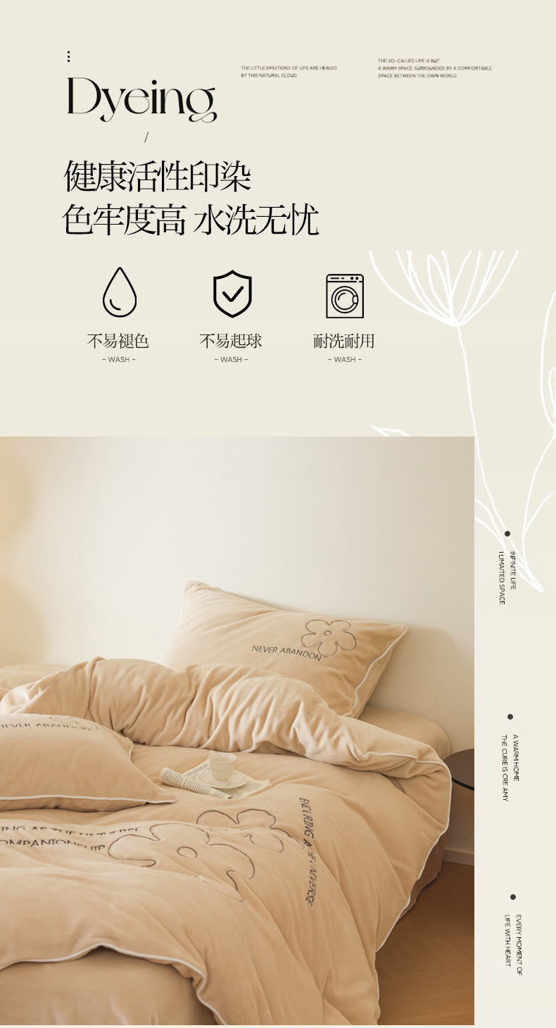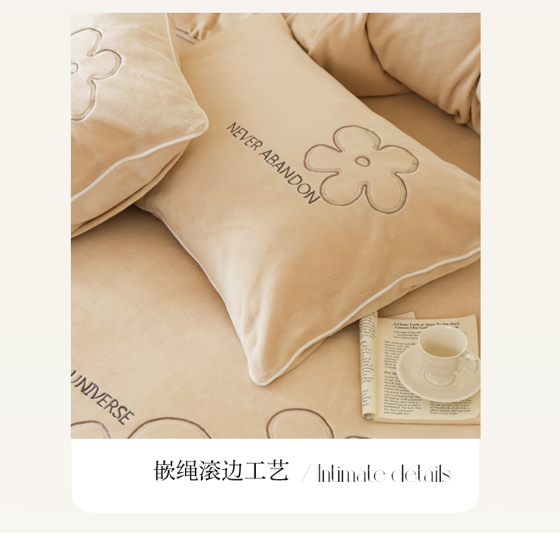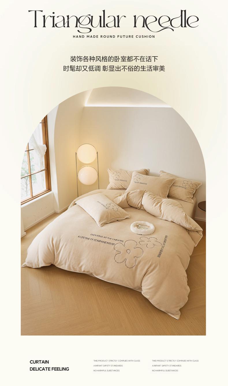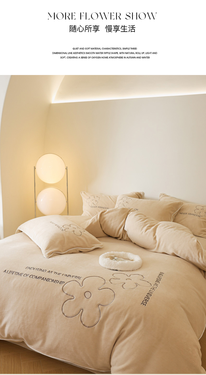 万盛家纺 2025新款牛奶绒简约绣花四件套 杏仁色