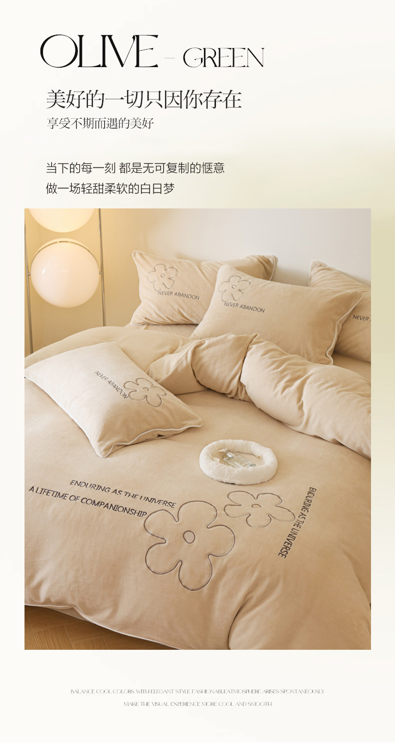 (总)万盛家纺 2025新款牛奶绒简约绣花四件套,艾草绿,豆沙色,高级灰,奶油黄,香草白,杏仁色,悠悠粉