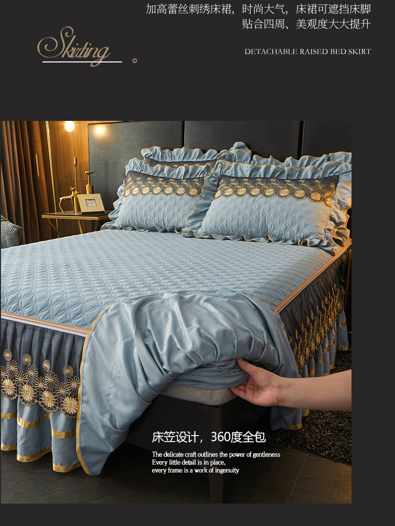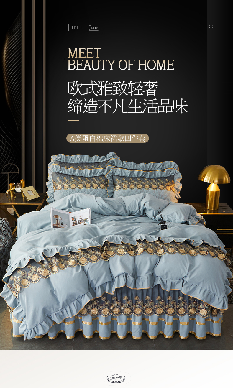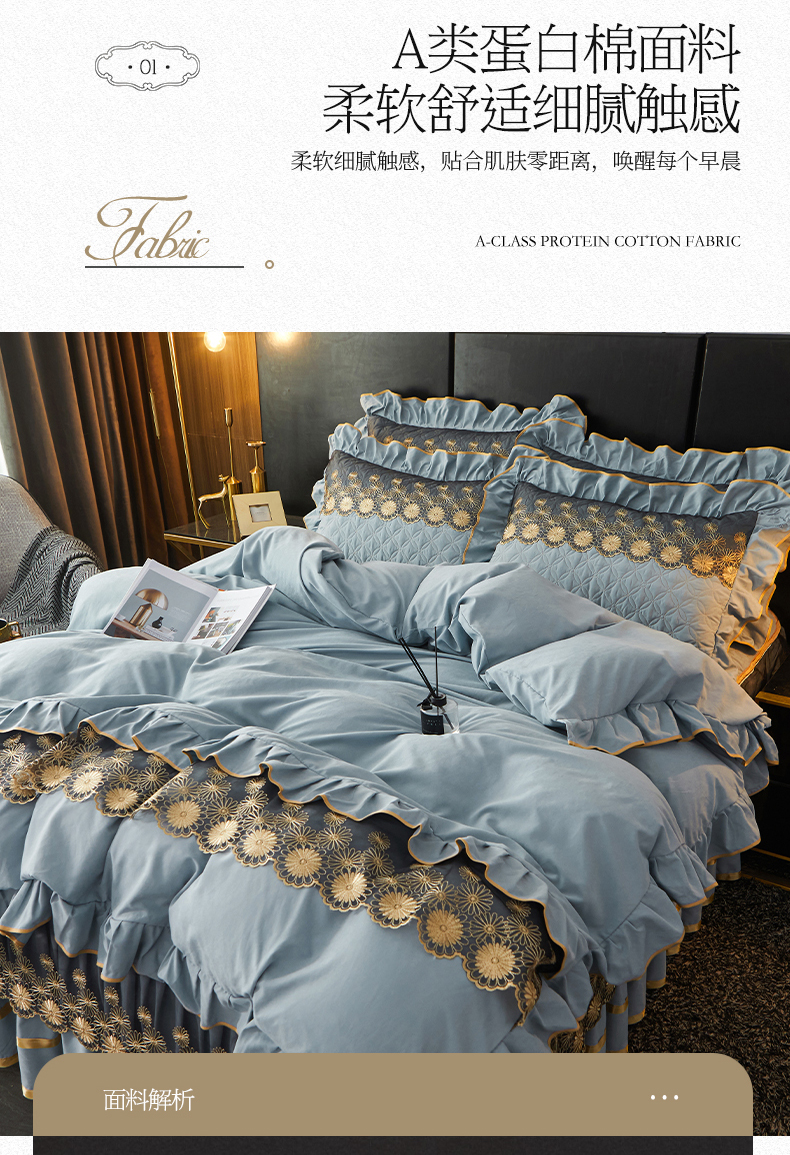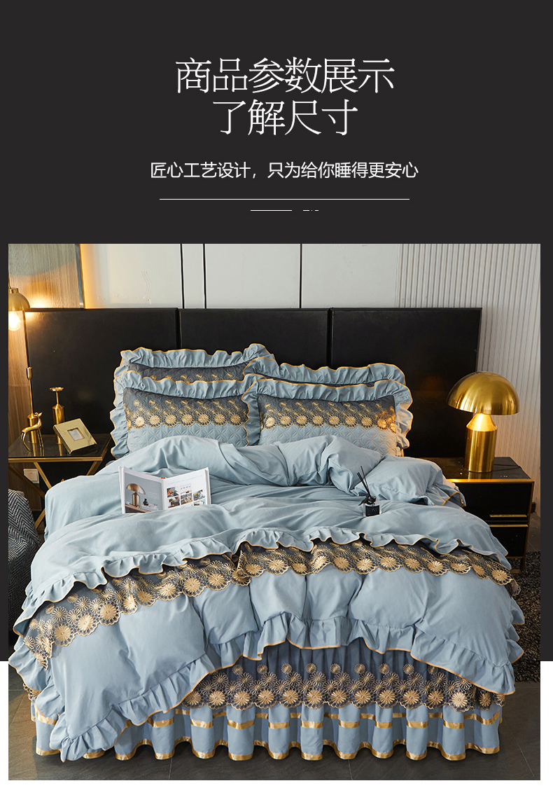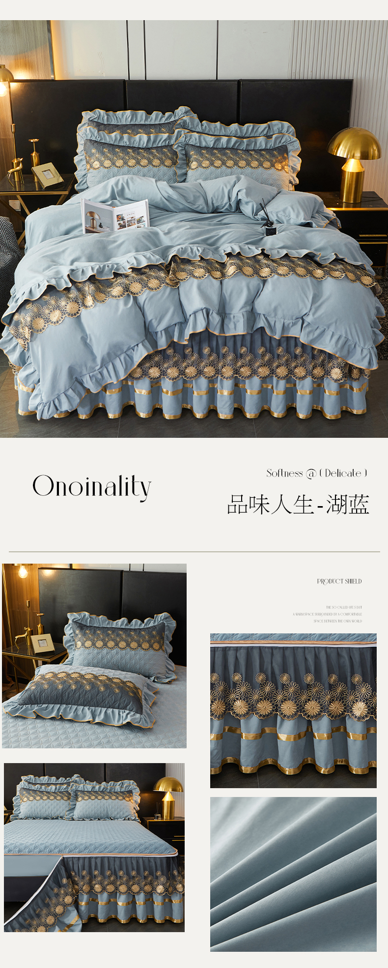 当前位置: 91家纺网 > 商品网购 > 床品套件 > 四件套 > 化纤普通四件套 > 罗艺轩 2024新款A类蛋白棉夹棉床裙四件套-品味人生 品味人生-湖蓝