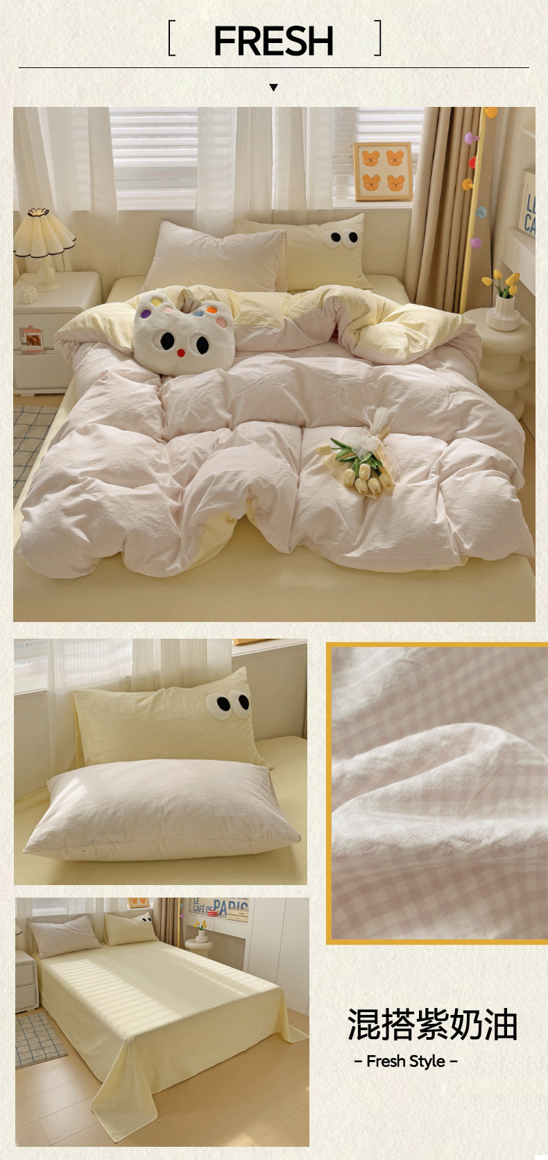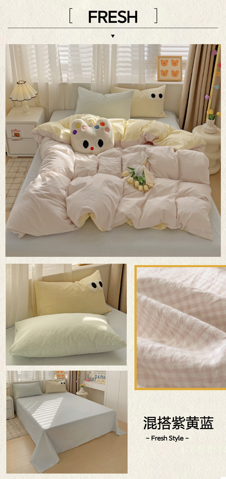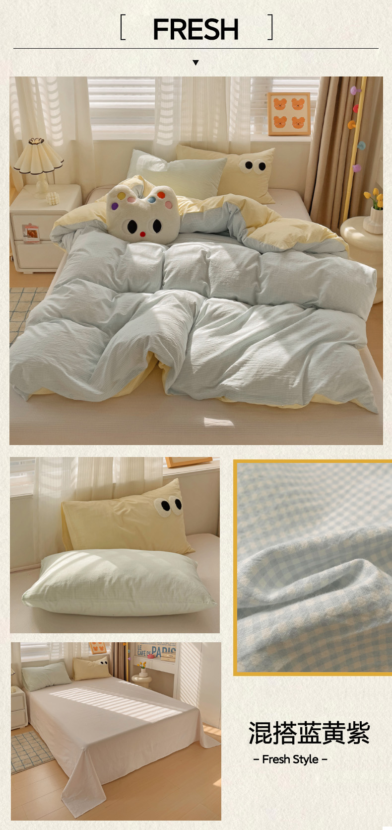 商品名称:(总)丽涵家纺 2024新款ins风混搭水洗棉全棉毛巾绣系列格子四件套