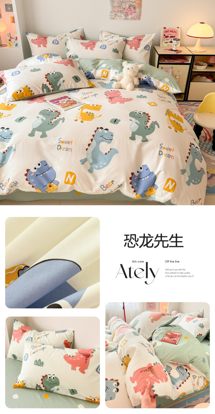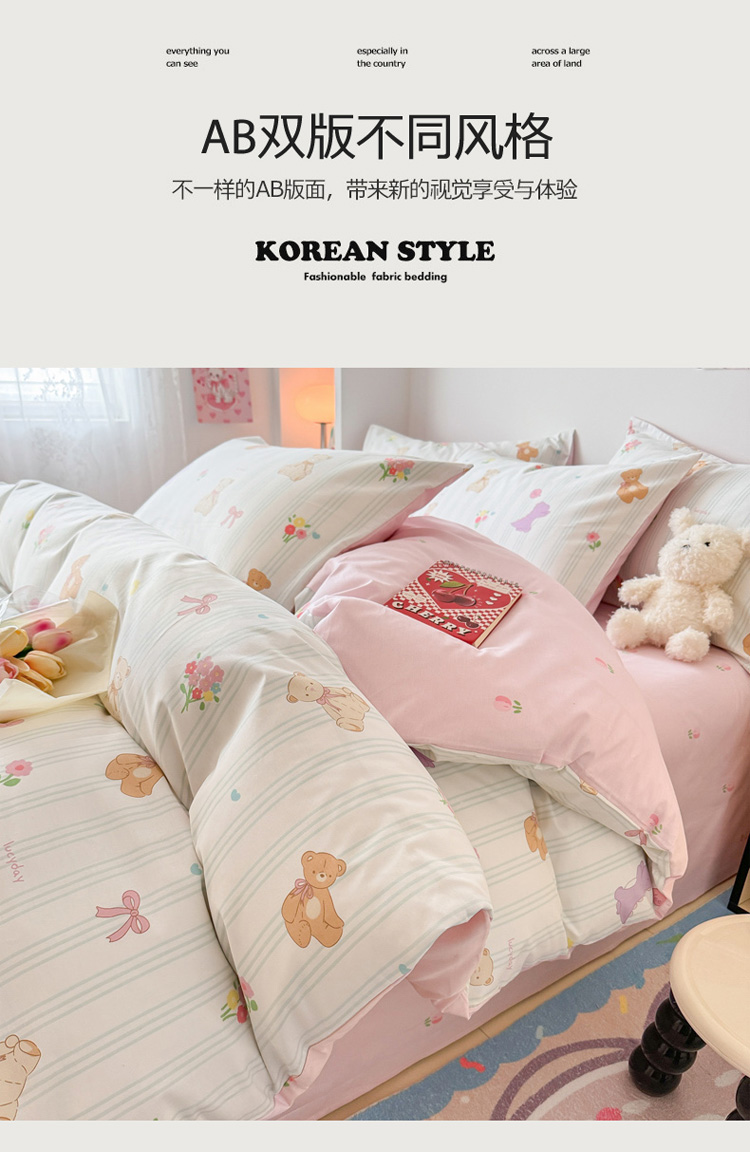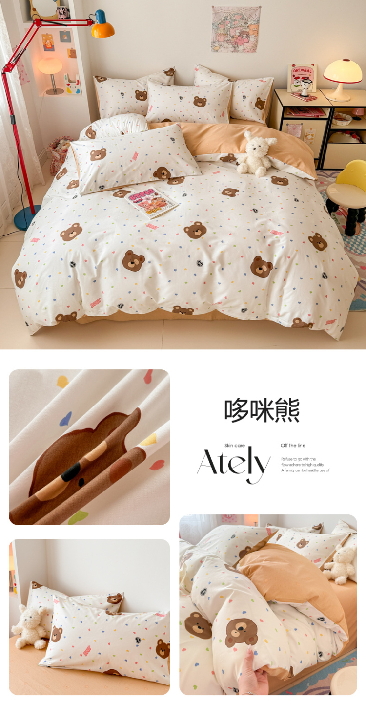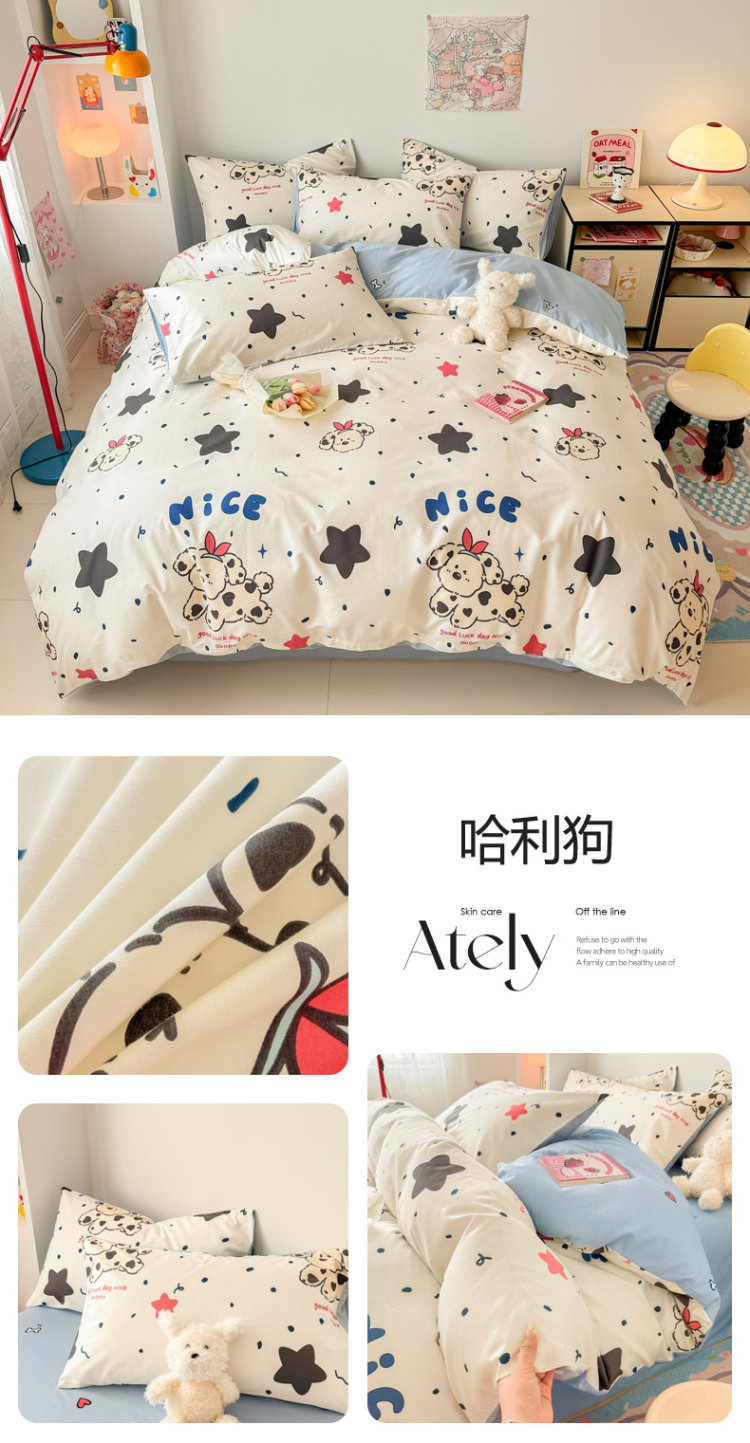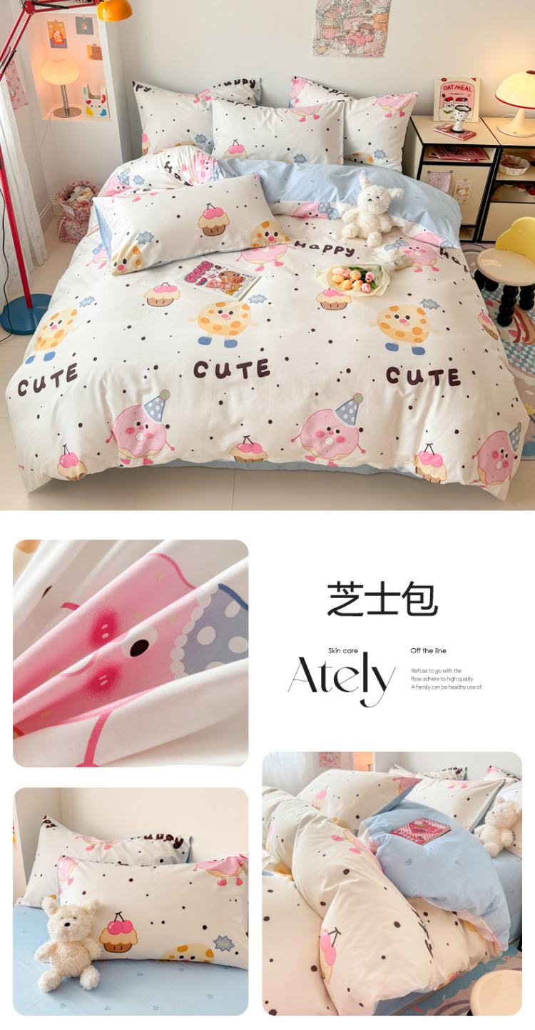(总)慕尚家纺 2025新款全棉印花学生三件套套件,艾米熊,彩色爱心狗,铃兰花,美食派对,萌宠乐园,书生猫咪,桃心狗,汪可爱,旺旺,樱桃