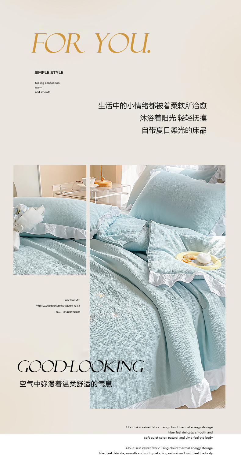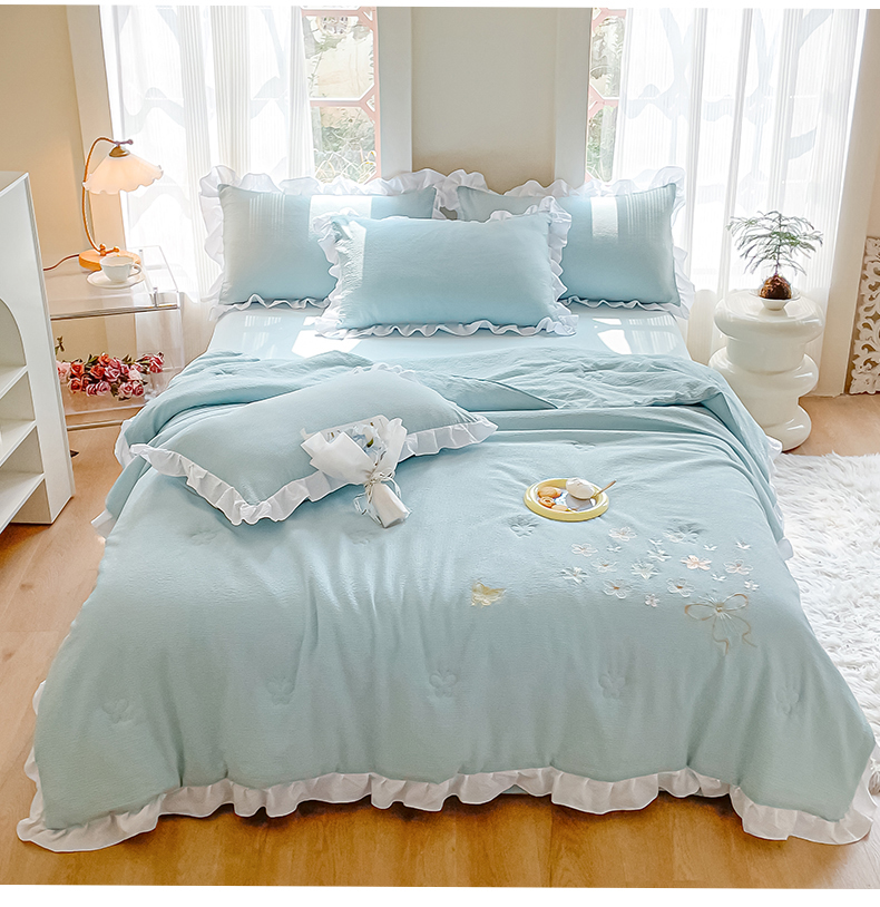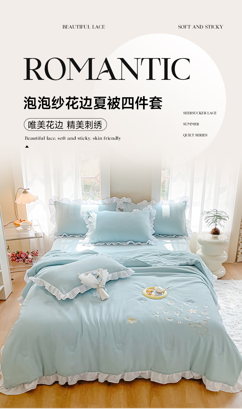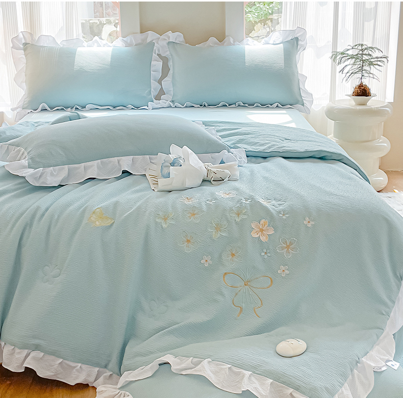 金麦家纺 24新款泡泡纱花边夏被四件套 黛蓝