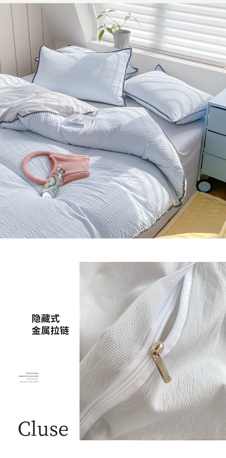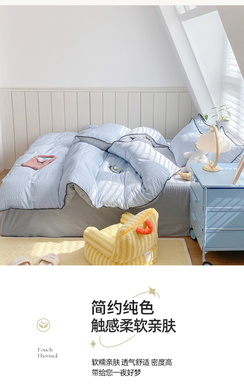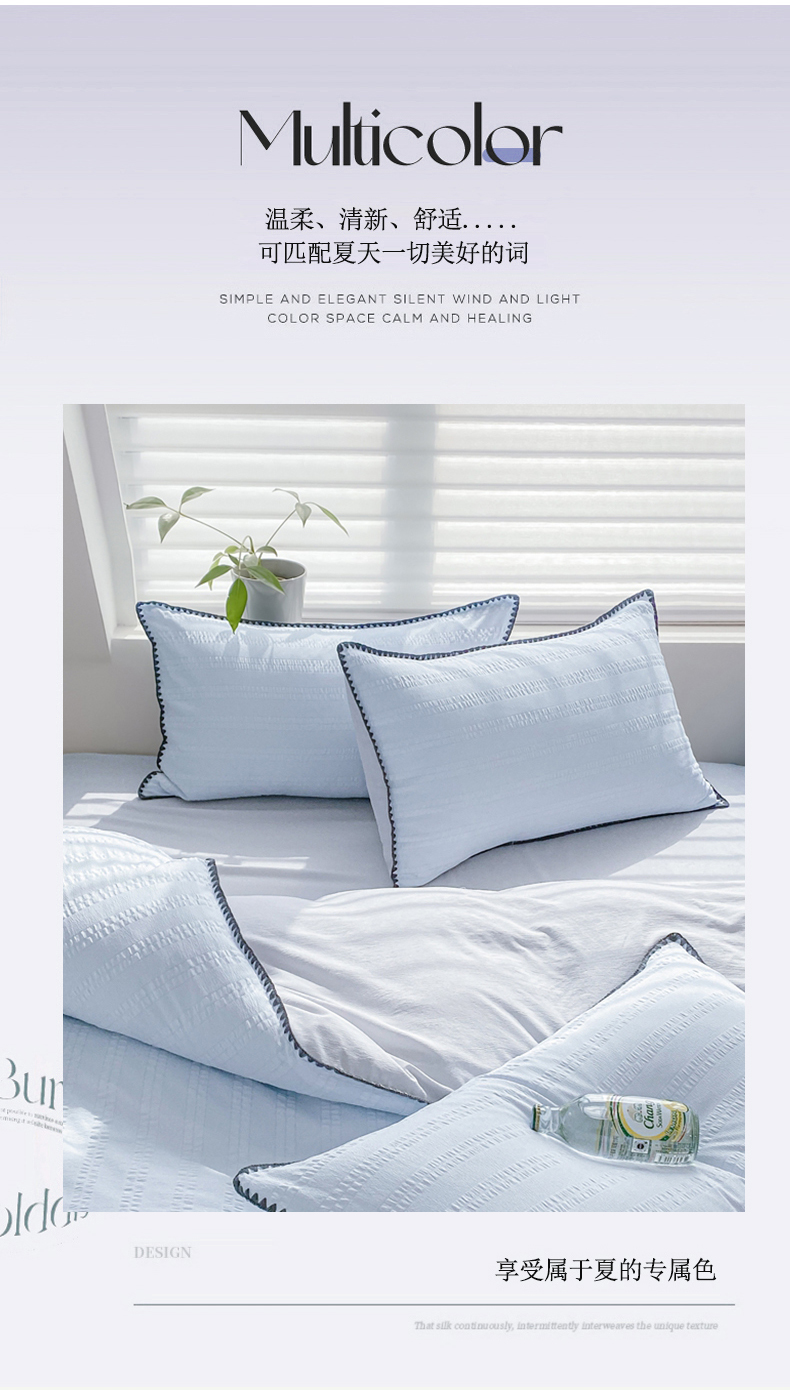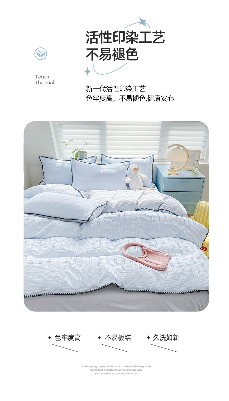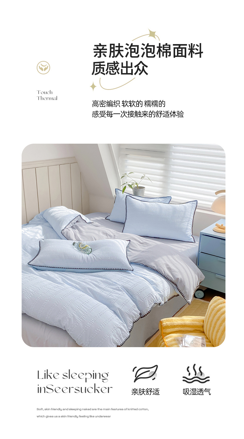 商品名称:羋多 2024新款贝壳边雨泡泡棉泡泡纱双层纱四件套 天空蓝+雅士灰