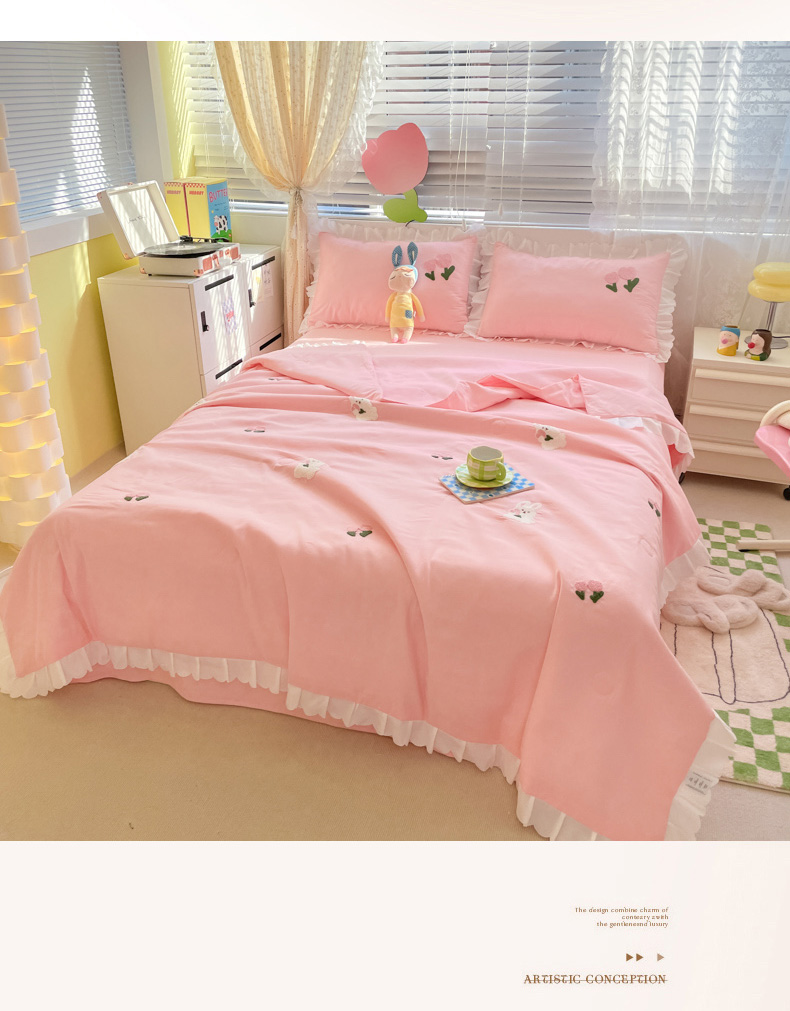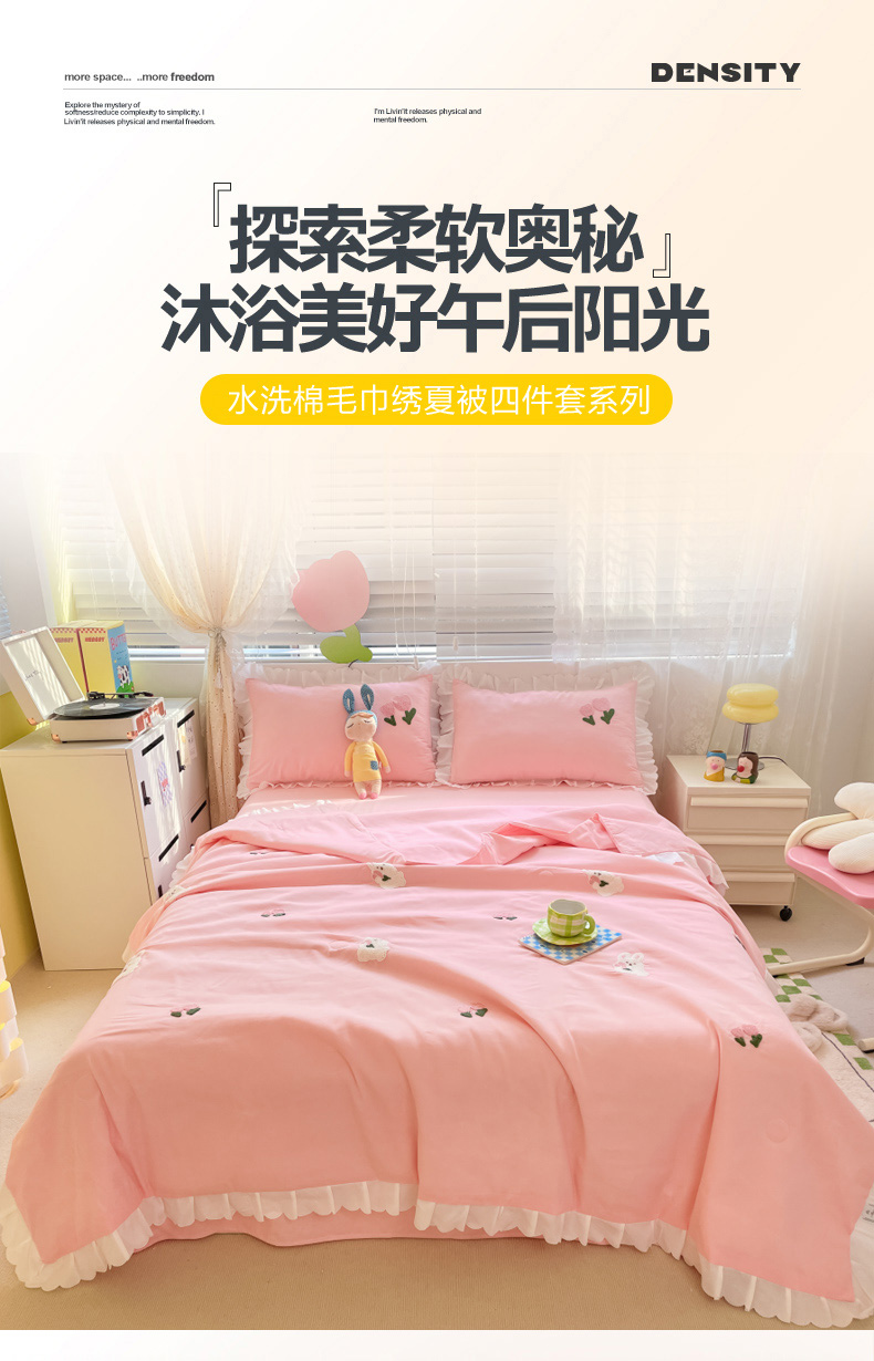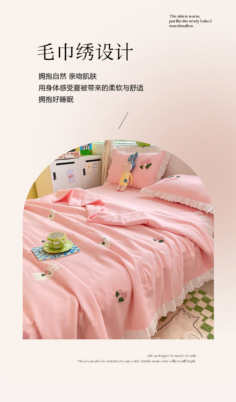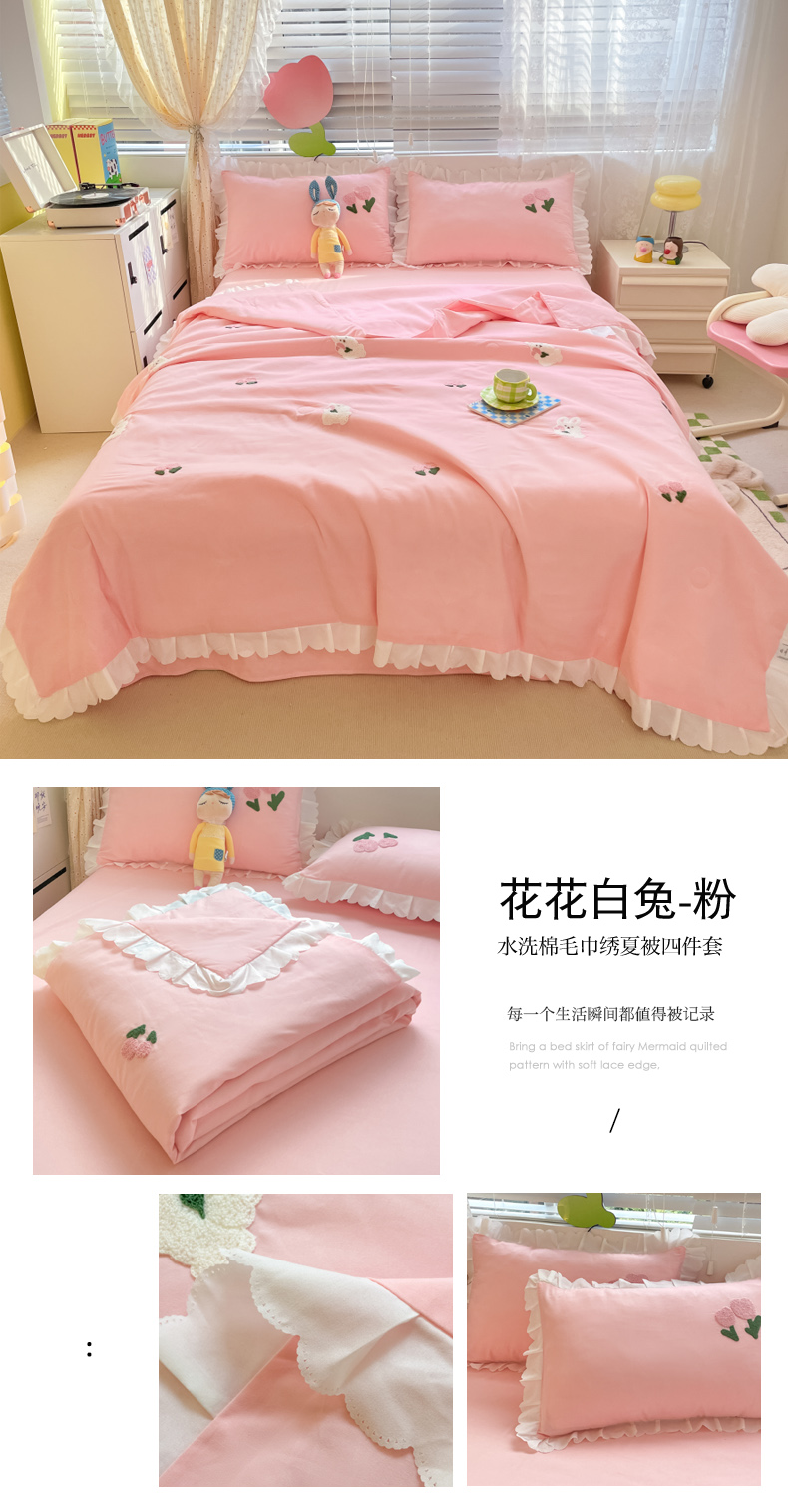 沐慕 2024新款毛巾绣印花夏被四件套 花花白兔-粉