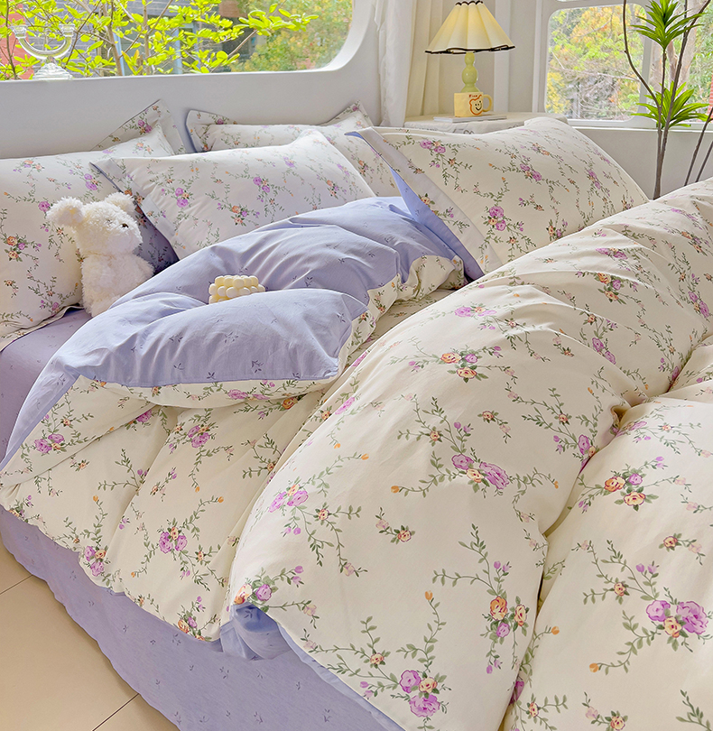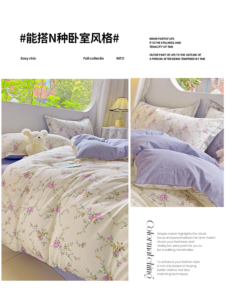 优选良品 2025新款韩版轻奢皱皱纱水洗棉拼色床单床笠四件套三件套-芋泥紫,芋泥紫
