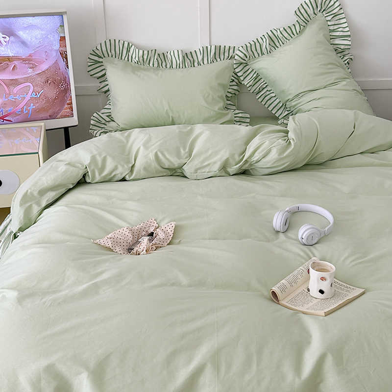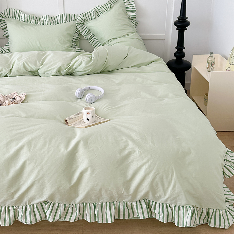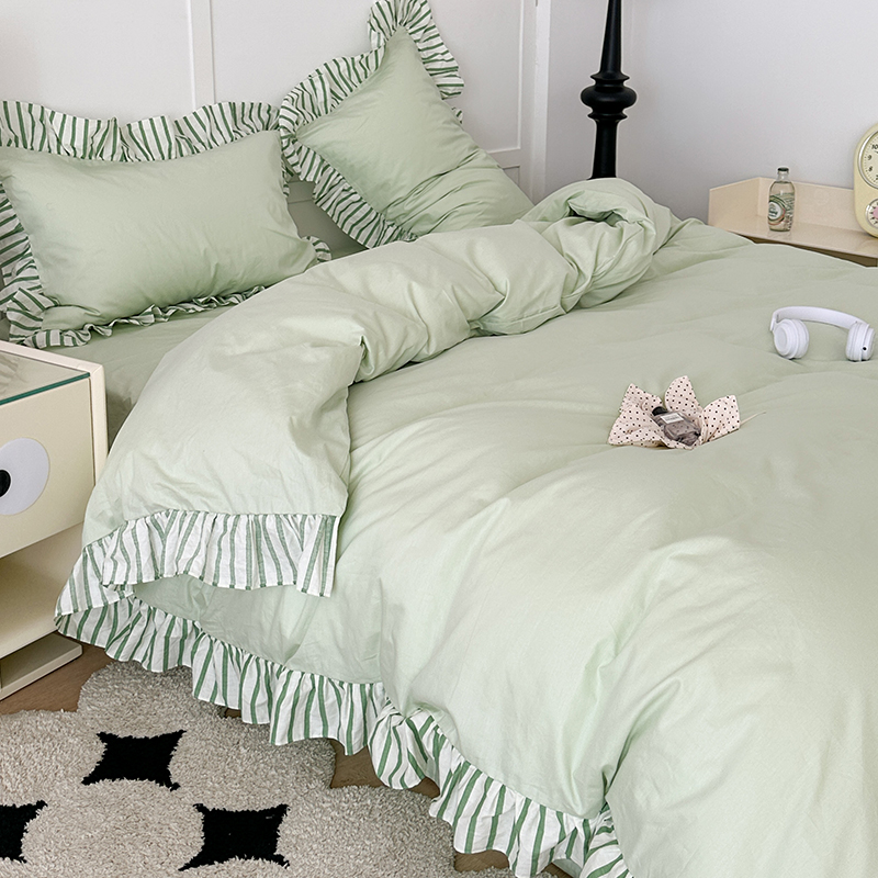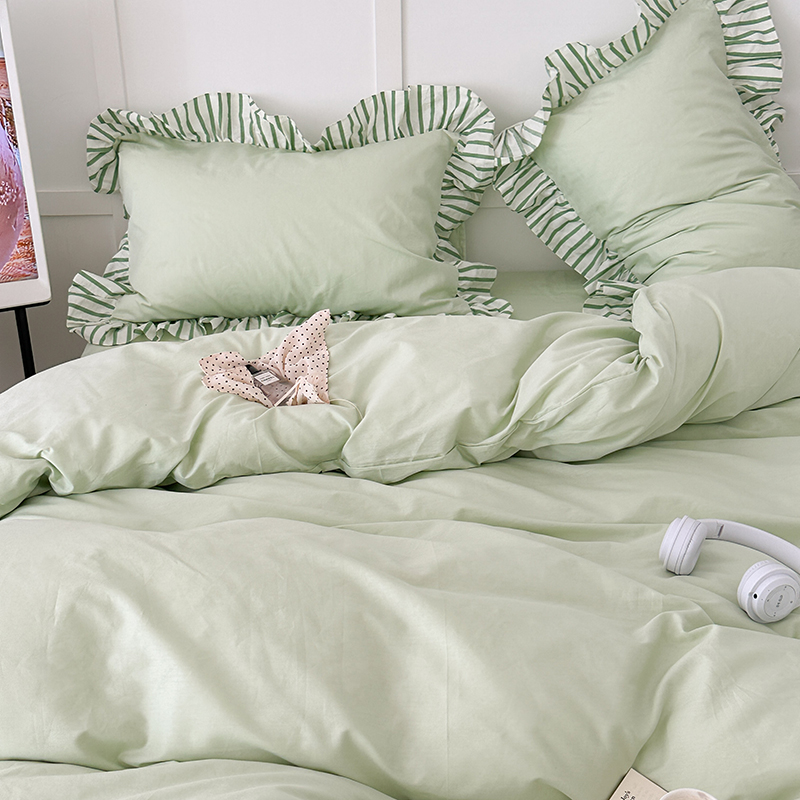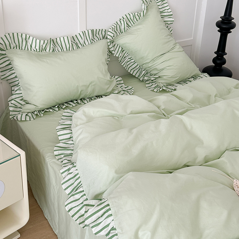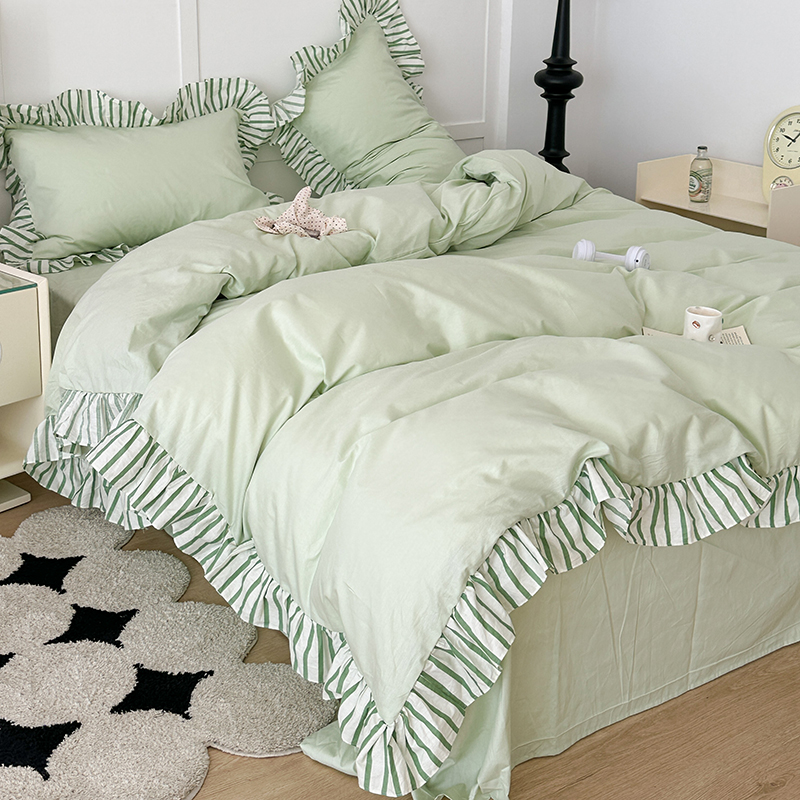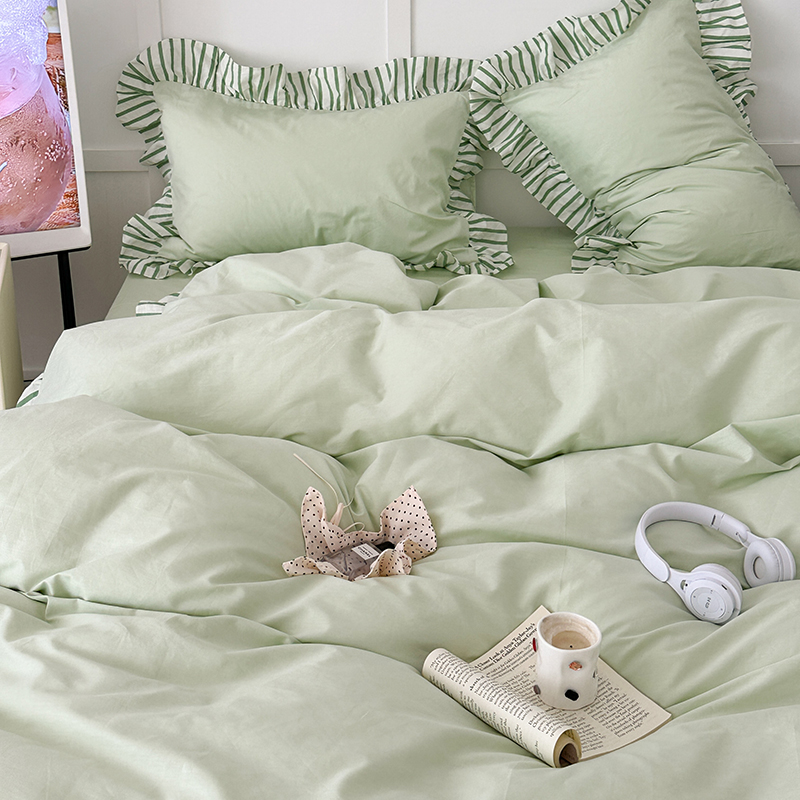 昔可家纺 2024新款纯色亲肤条纹花边四件套 薄荷绿条