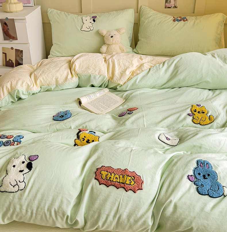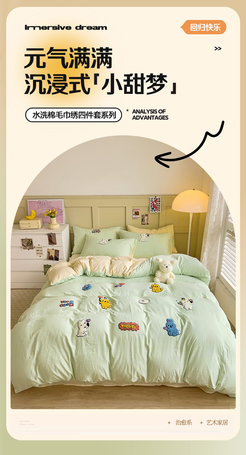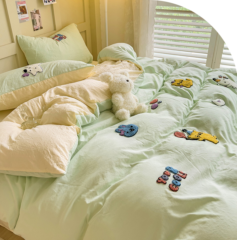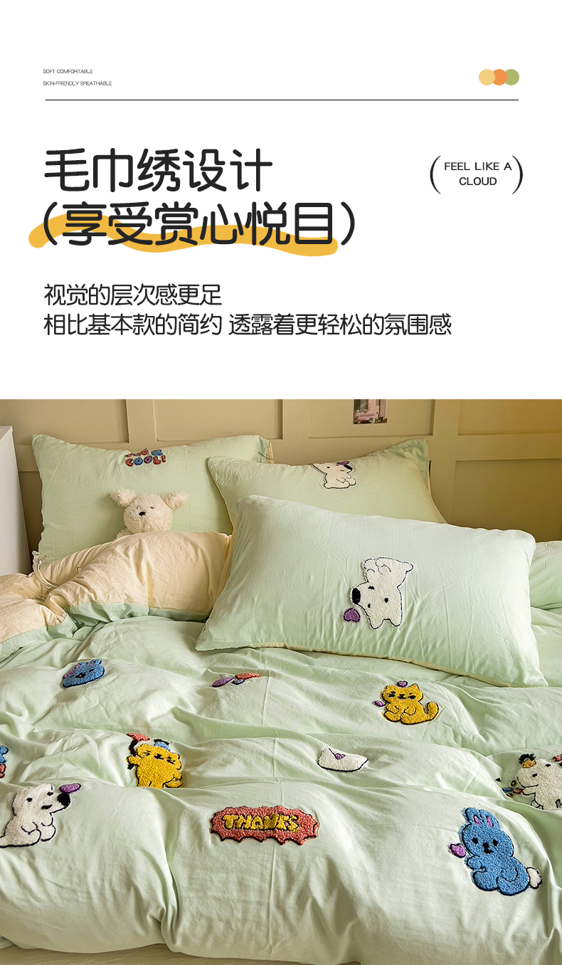 当前位置: 91家纺网 > 商品网购 > 床品套件 > 四件套 > 水洗棉四件套 > 韩巢家纺 2024新款四季通用超柔水洗棉毛巾绣四件套-动物乐园系列(提供卖家秀) 动物乐园浅绿黄
