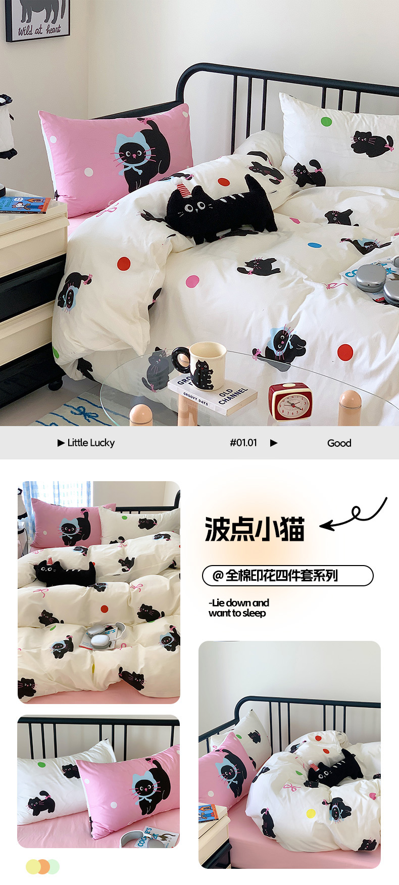 美乐迪家纺 2024新款全棉印花混搭系列四件套 波点小猫