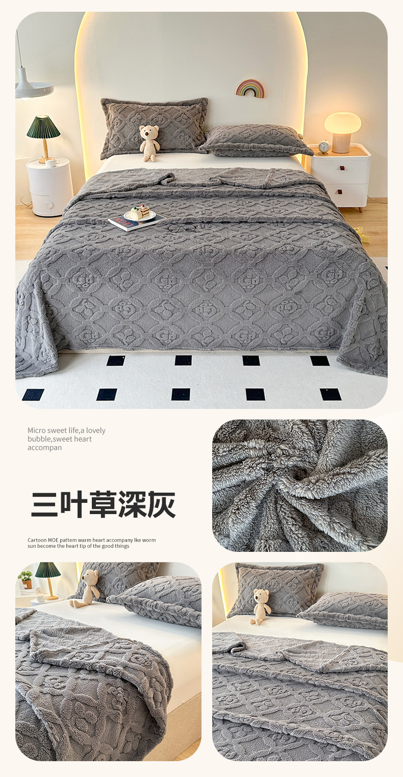 商品名称:悦织湾家纺 2025直播爆款外贸出口跨境热销款三叶草塔芙绒毛毯 三叶草深灰