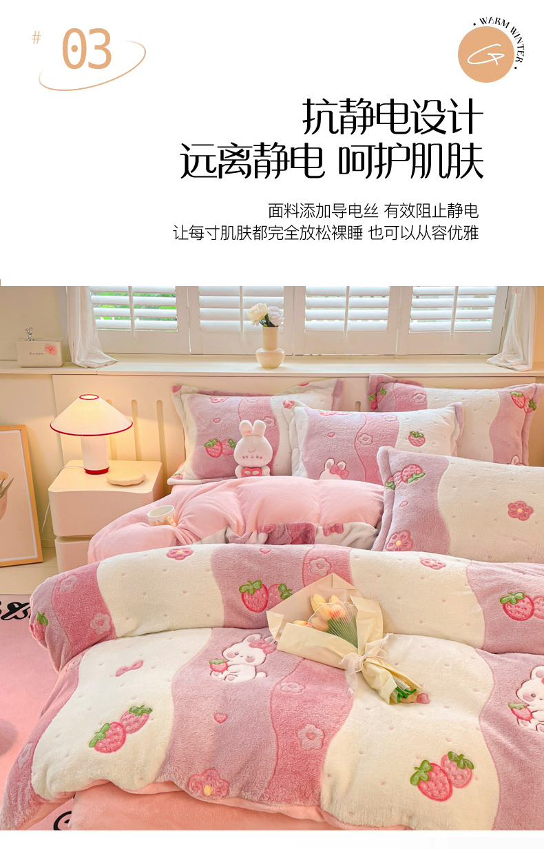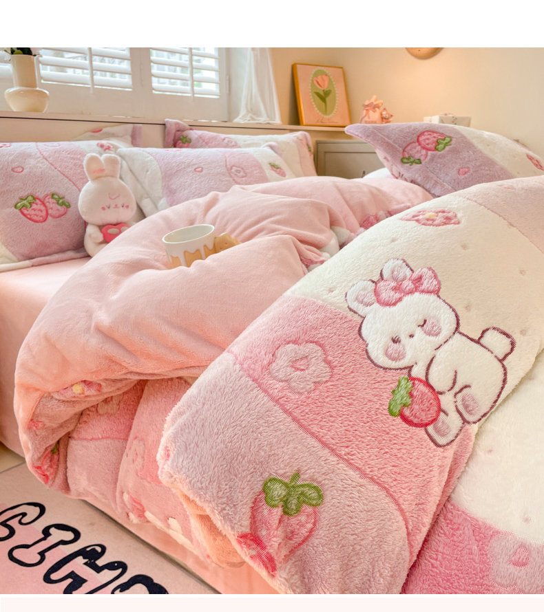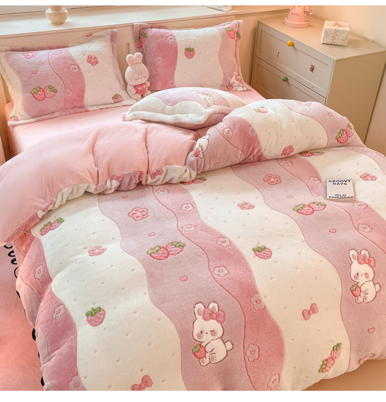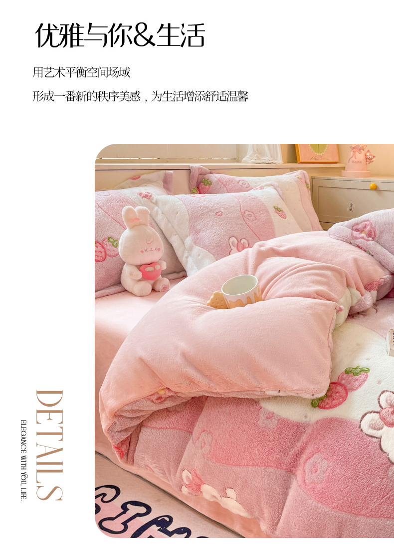 当前位置: 91家纺网 > 商品网购 > 床品套件 > 四件套 > 其它四件套 > 沐慕 2024新款卡通印花雪花绒四件套加厚牛奶绒四件套 草莓兔