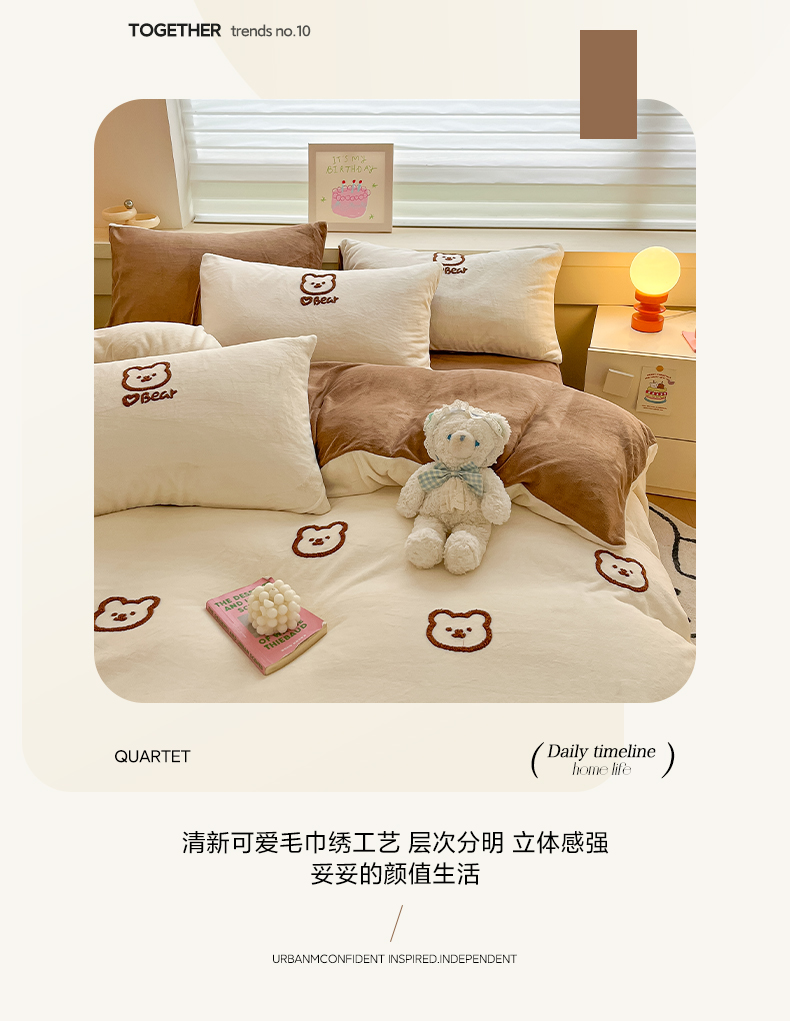 雅居纺家纺 2024新款高克重牛奶绒毛巾绣四件套 小熊-白咖