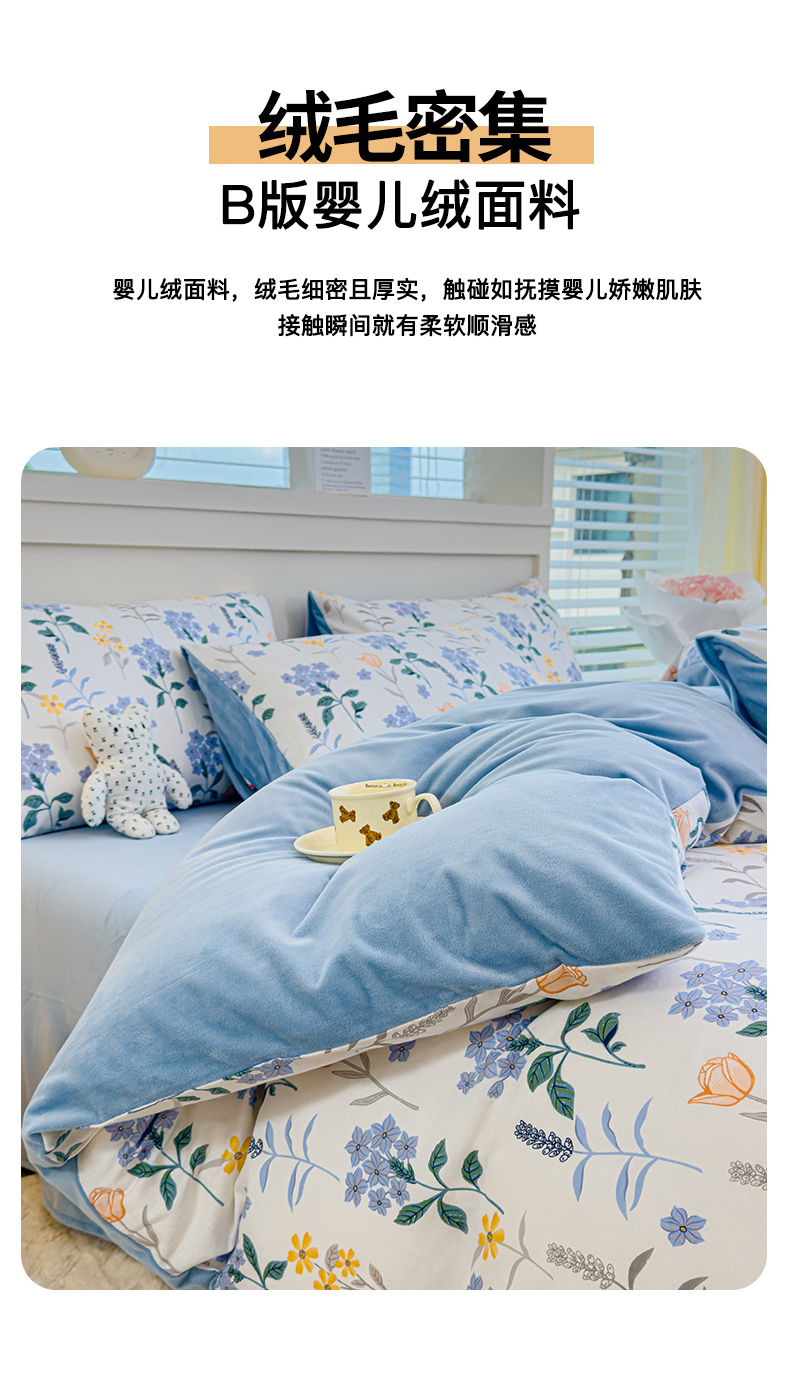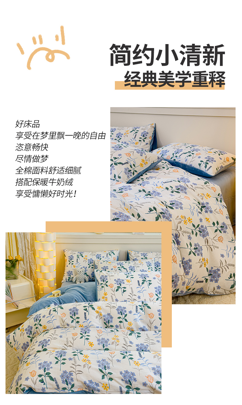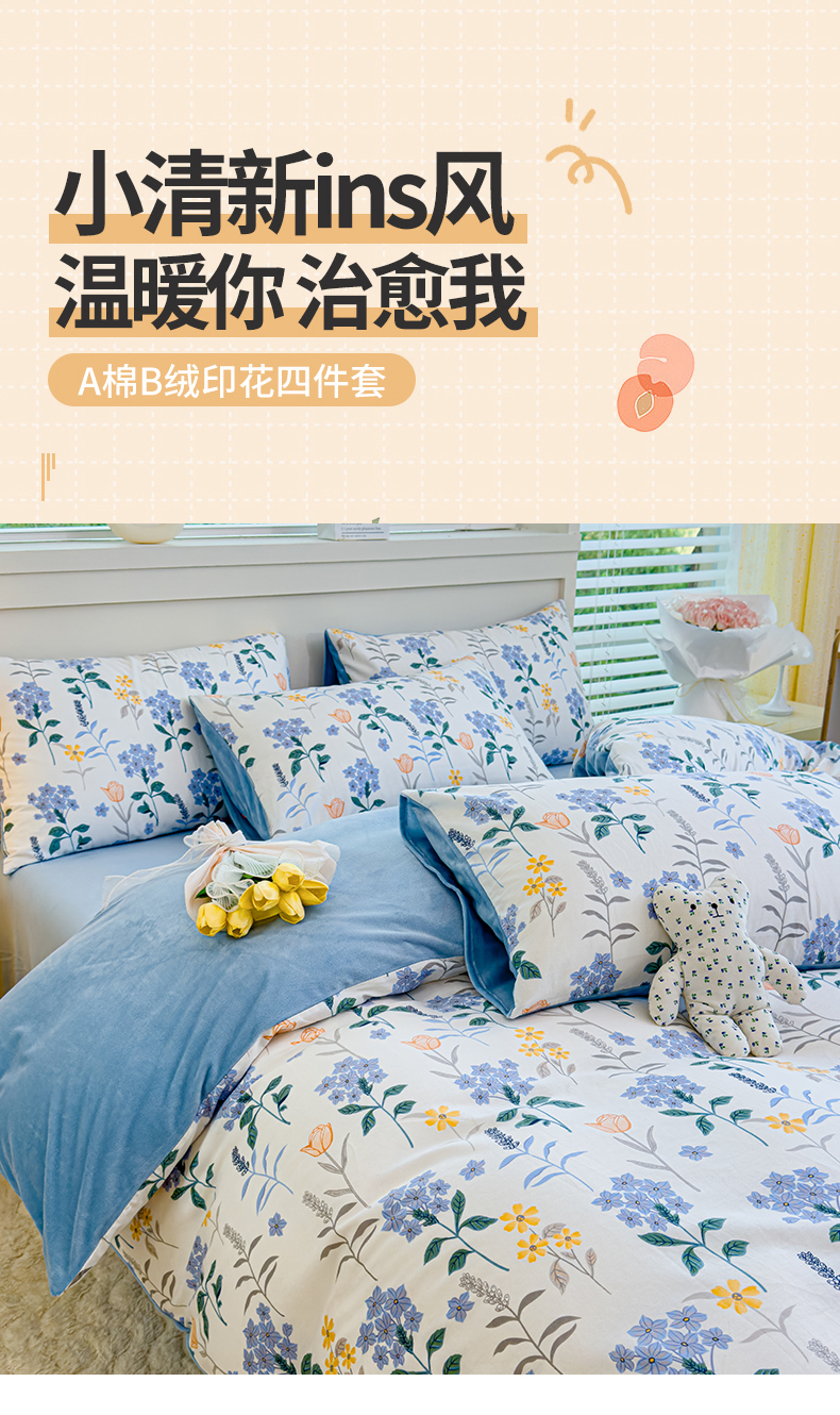 商品名称:(总)清雅福 2024新款小清新ins棉加绒印花四件套系列-棉绒风格一